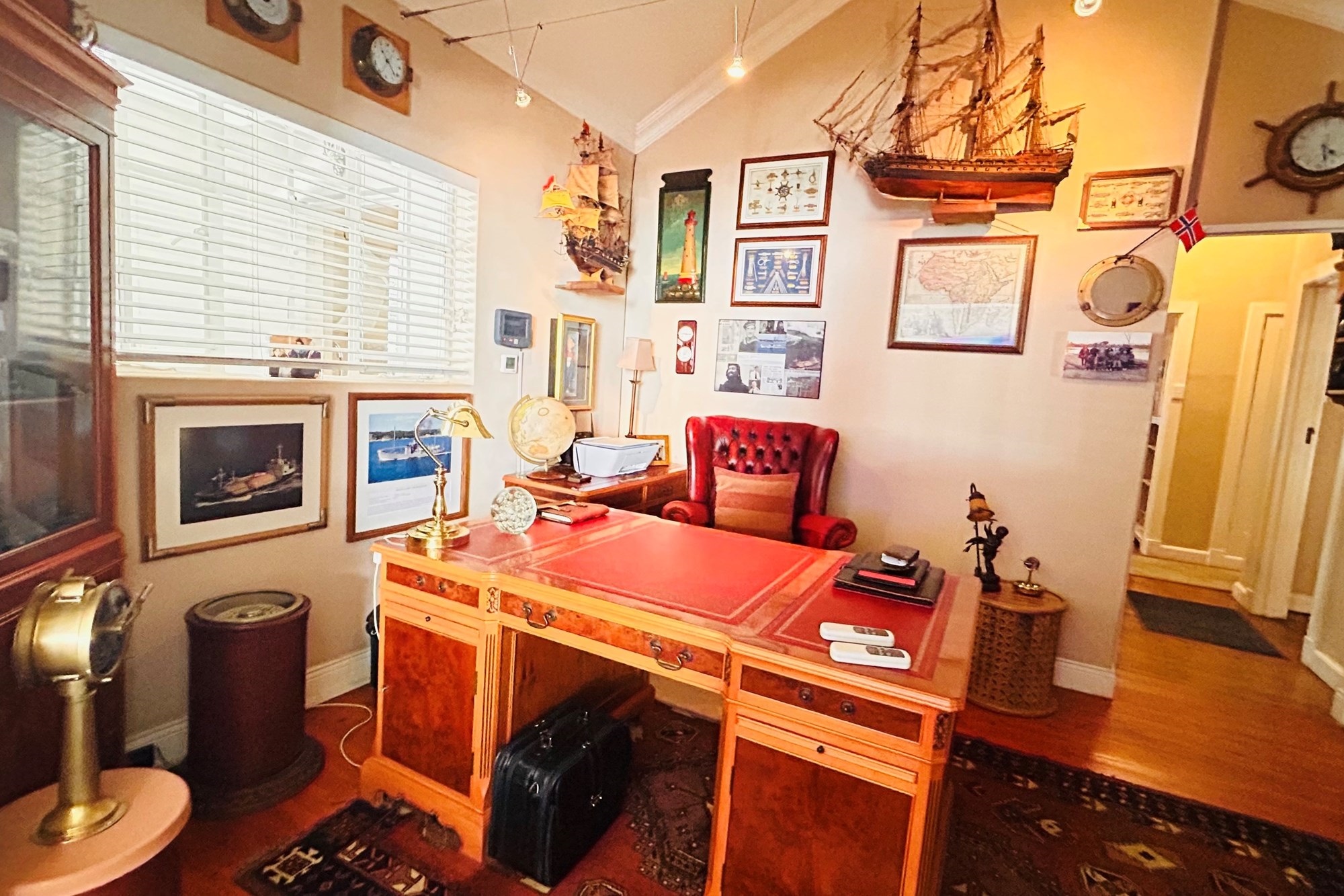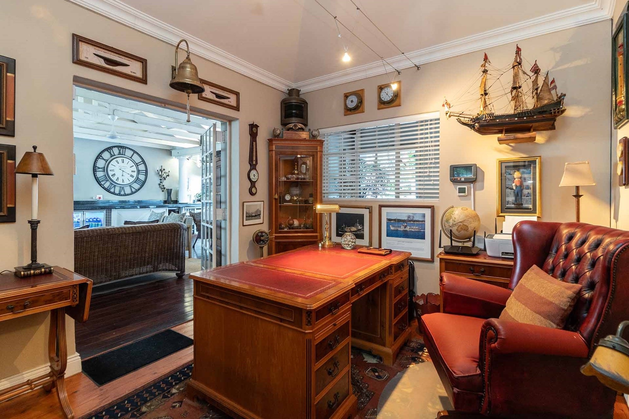 In the courtyard, a serene seating area and built-in braai add to the allure of the guest suite, a private haven with its own entrance and bathroom. To the left lies a large, covered wooden deck veranda perfect for entertaining, while a crystal-clear swimming pool shimmers to the right, ideal for family gatherings or quiet retreats. Above the garage, an elevated rooftop bar with a cozy fire pit creates the ultimate evening escape under Waterkloof’s starlit sky.