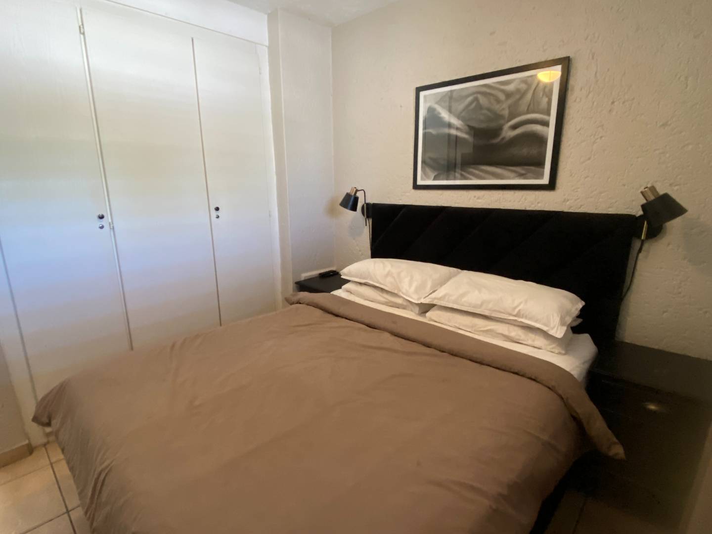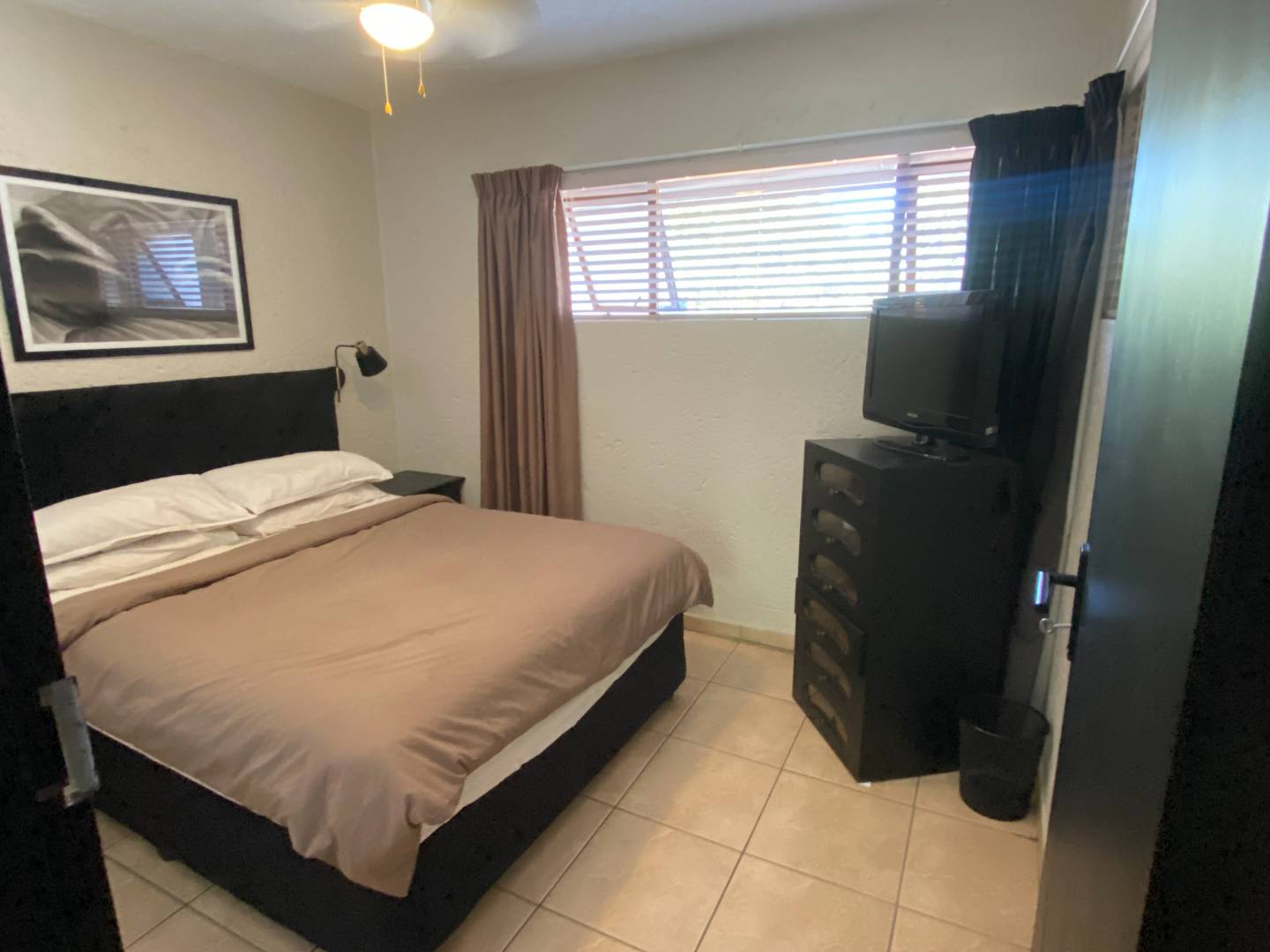 The bedroom comfortably accommodates a double or queen-size bed and is fitted with a ceiling fan for added comfort.