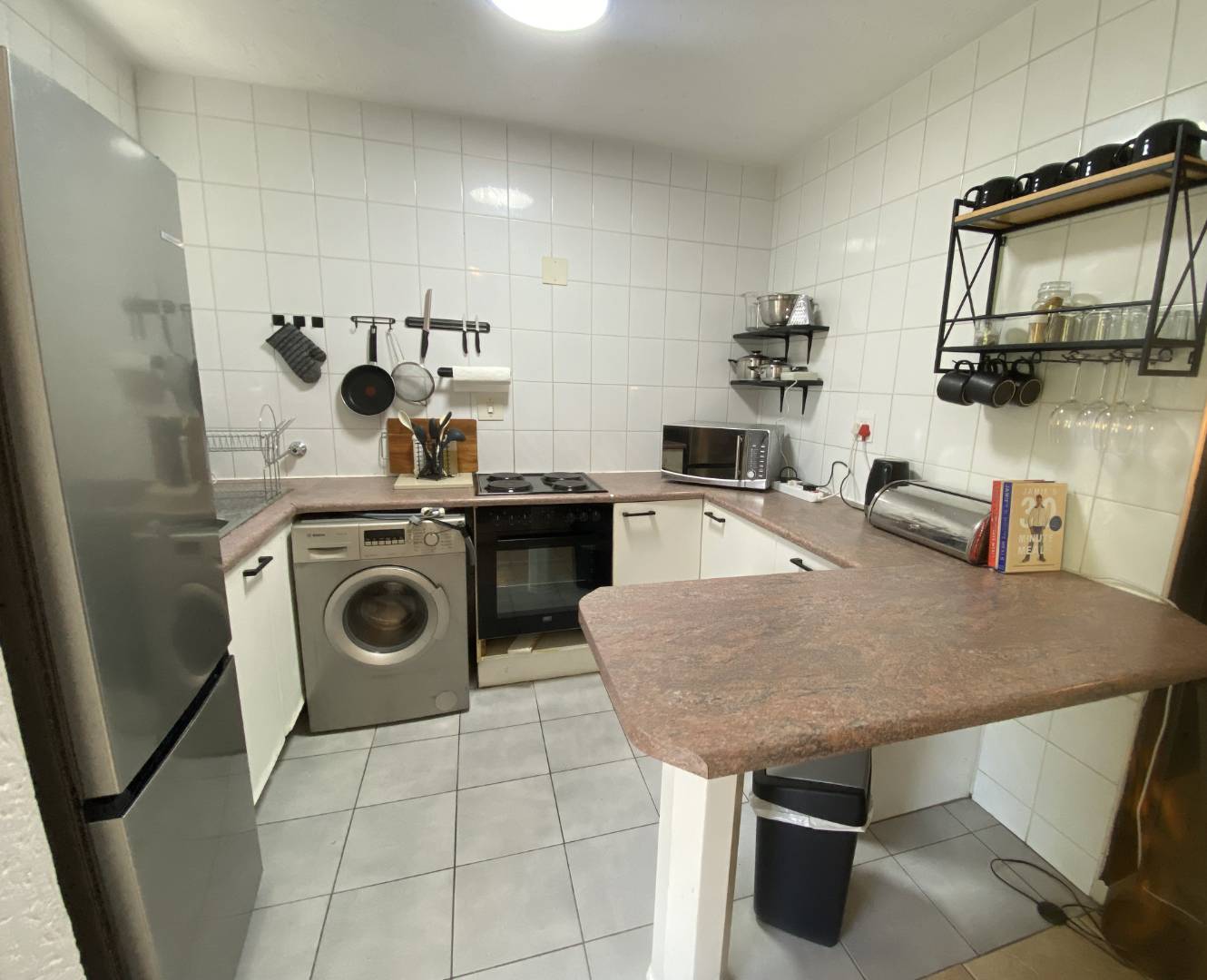 The kitchen offers a practical layout with a breakfast nook, space for a single-door fridge, and one washing machine connection.