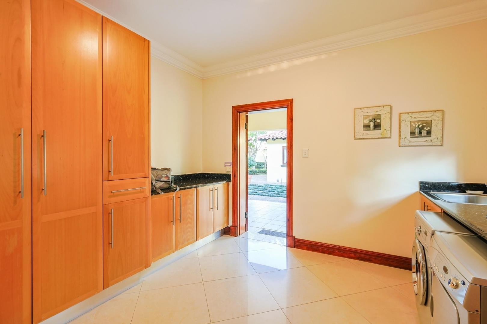 The lower level offers seamless flow between the study, TV lounge, formal living and dining areas, all anchored by a beautifully appointed kitchen - the true heart of the home. Fitted with premium Miele appliances, sleek cabinetry, and a generous scullery and laundry, this space opens effortlessly through double doors onto a covered patio with built-in braai, sparkling pool, and lush irrigated garden - ideal for relaxed family living and memorable gatherings.