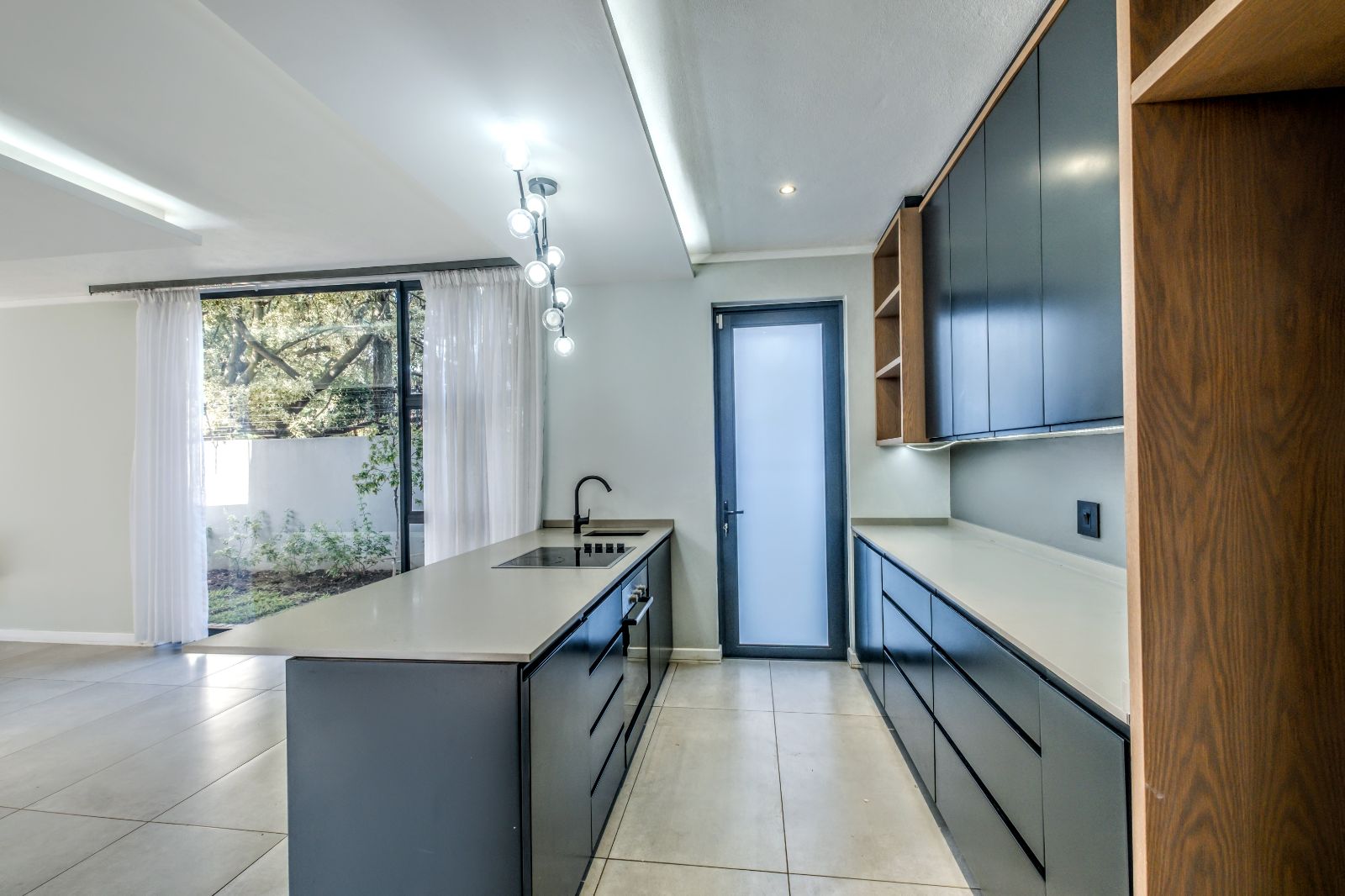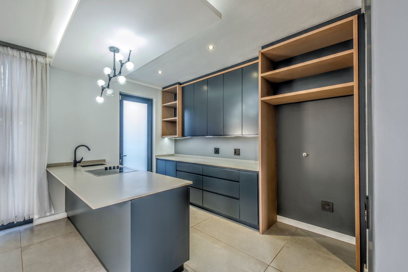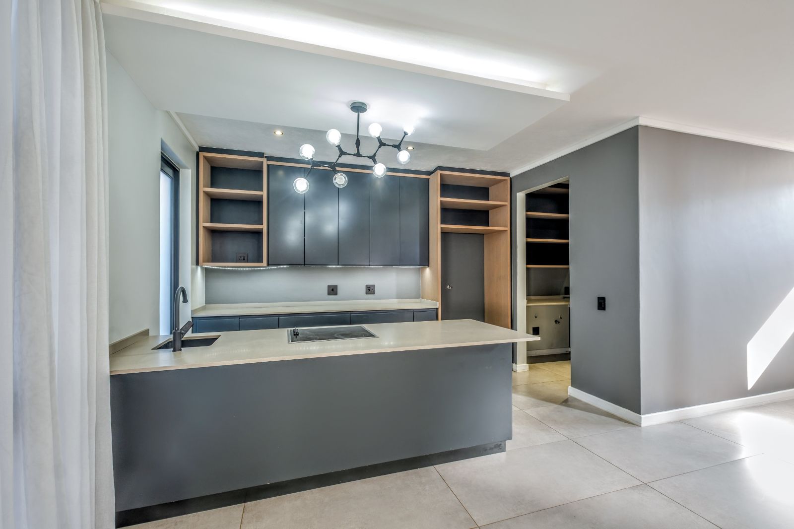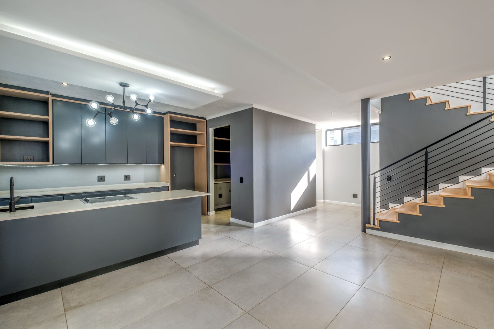 The sleek, contemporary kitchen is boasts premium finishes and a large kitchen island equipped with an under-counter oven and induction hob. Adjacent to the kitchen, a concealed scullery and laundry room provide ample storage and easy access to a generously sized double garage with tiled floors and built-in cupboards — perfect for extra gear or sports equipment.