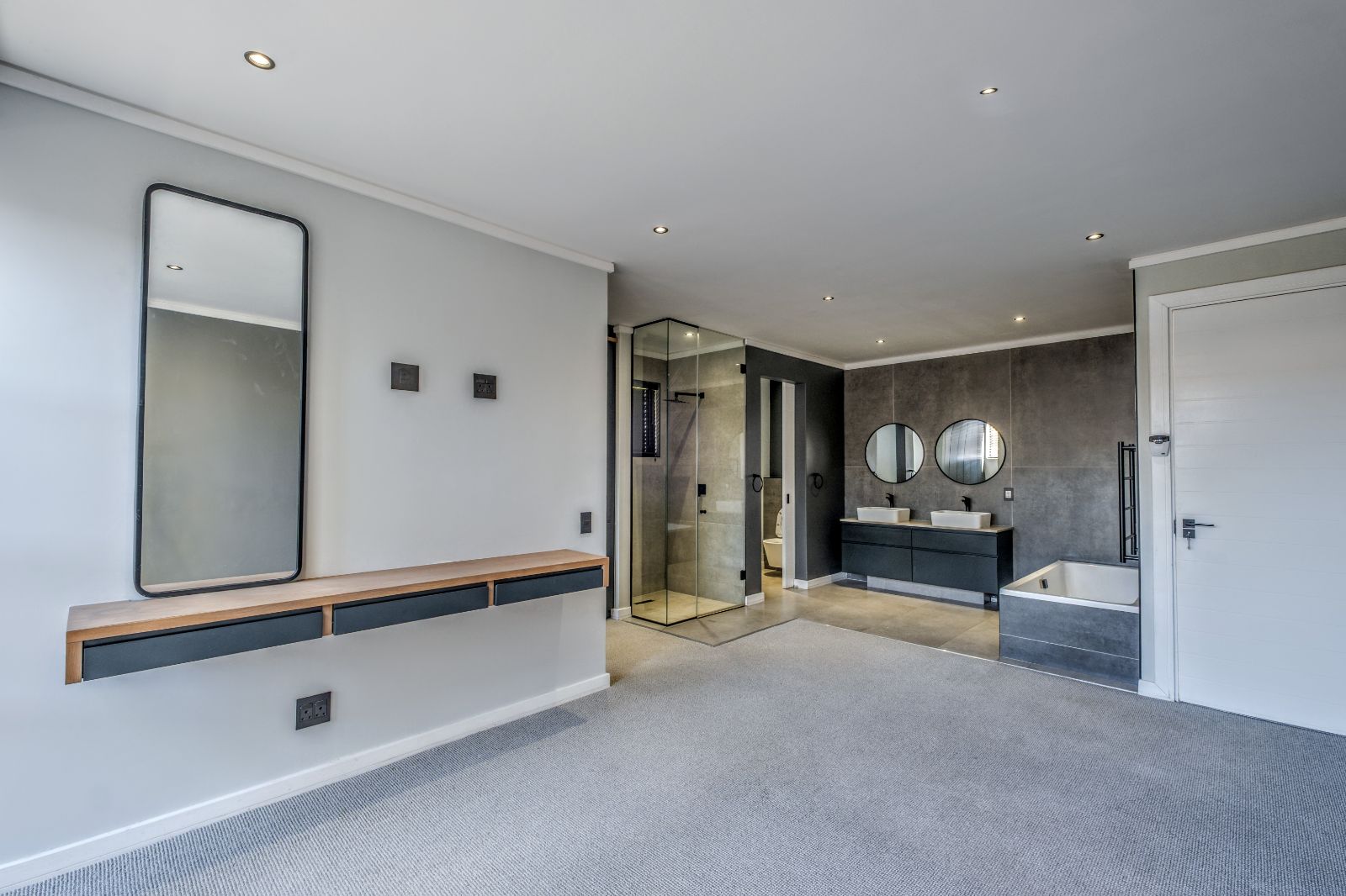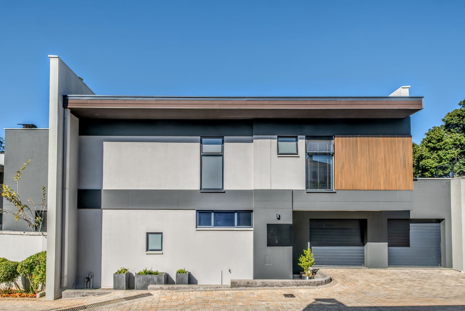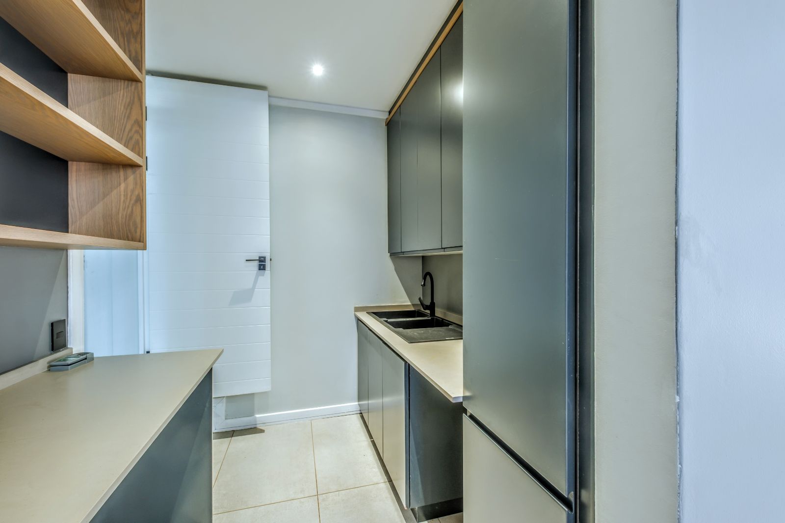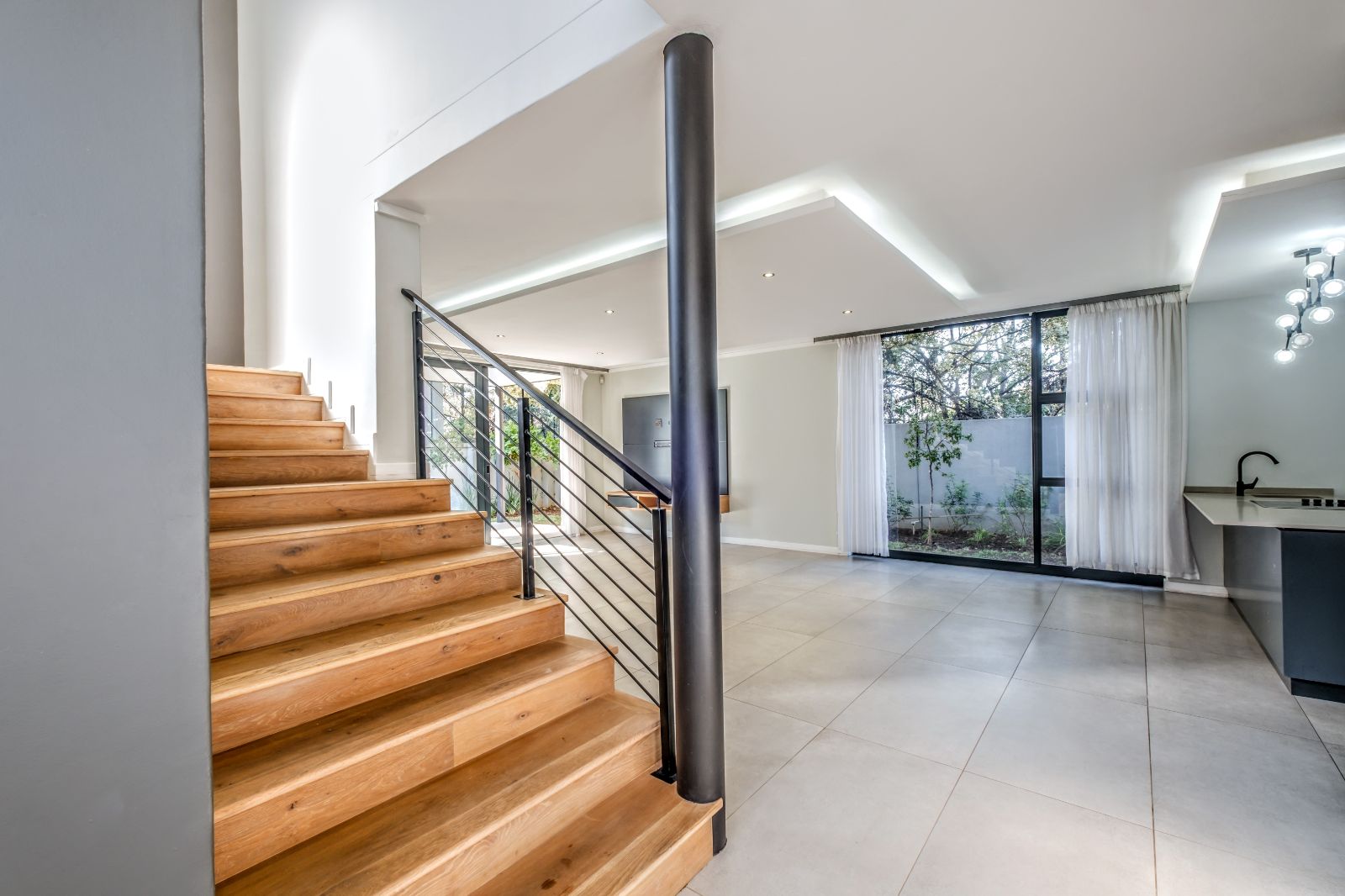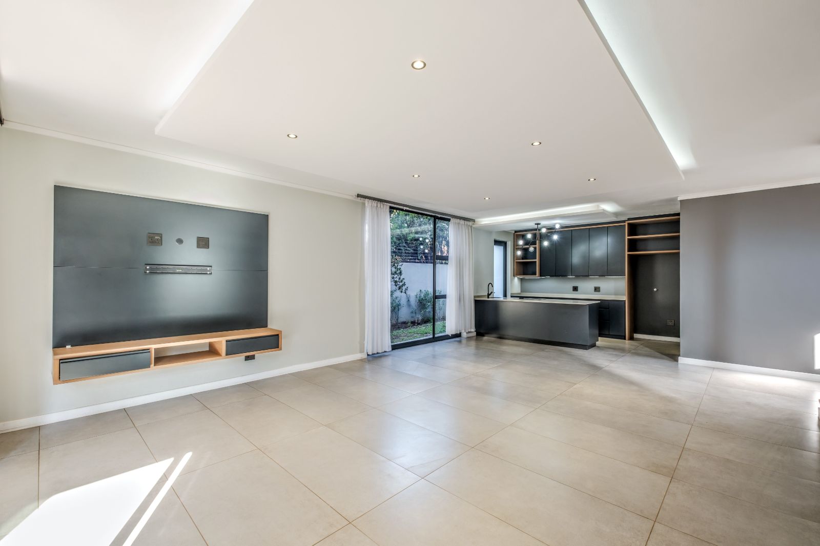 The sleek, contemporary kitchen is boasts premium finishes and a large kitchen island equipped with an under-counter oven and induction hob. Adjacent to the kitchen, a concealed scullery and laundry room provide ample storage and easy access to a generously sized double garage with tiled floors and built-in cupboards — perfect for extra gear or sports equipment.