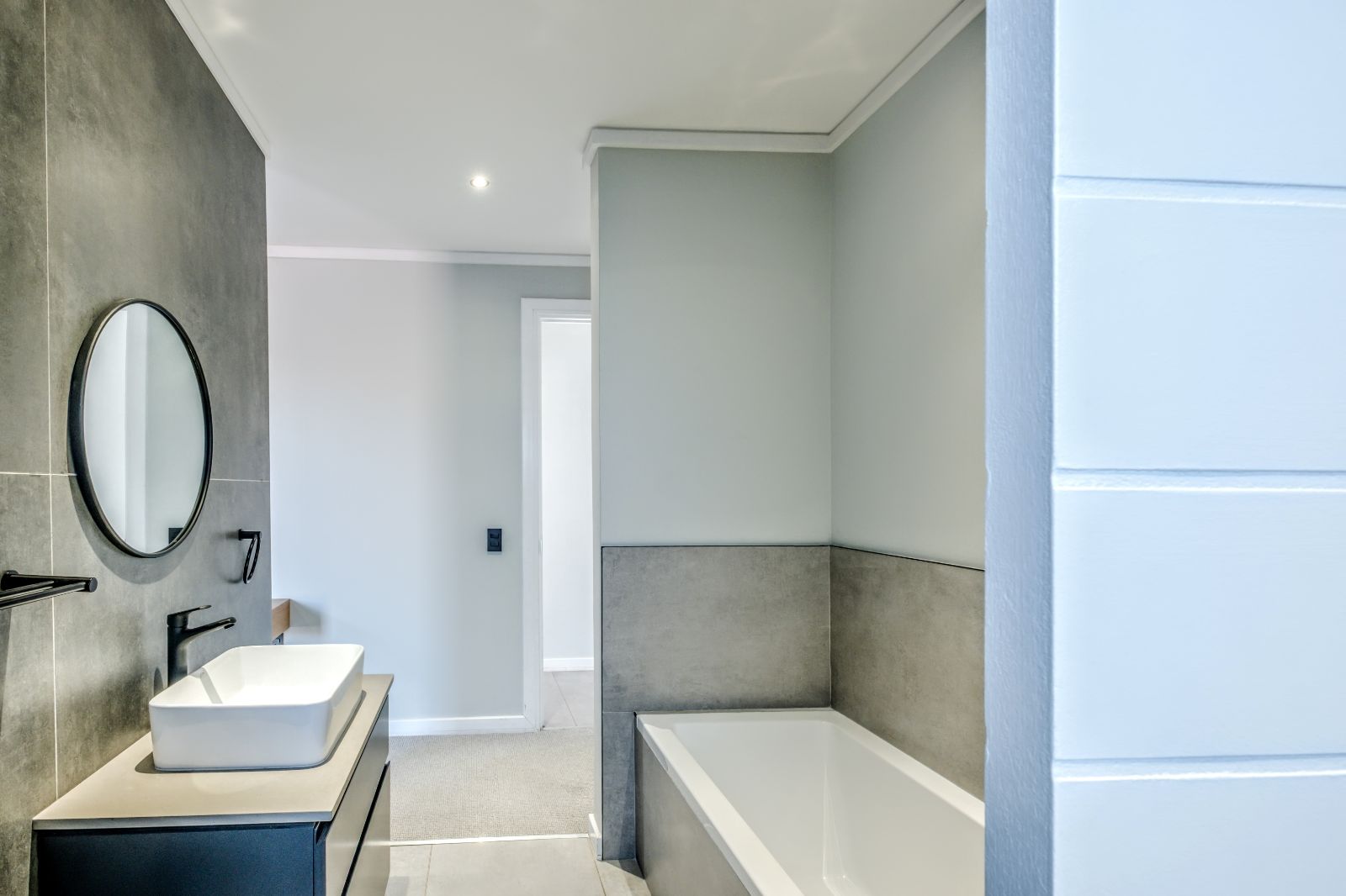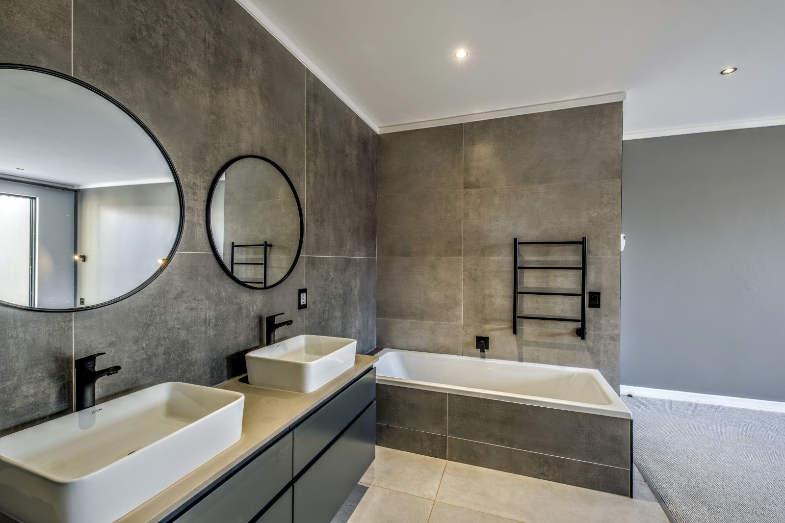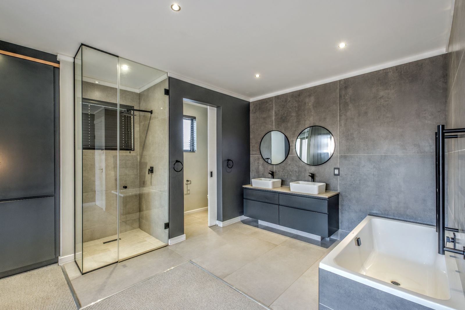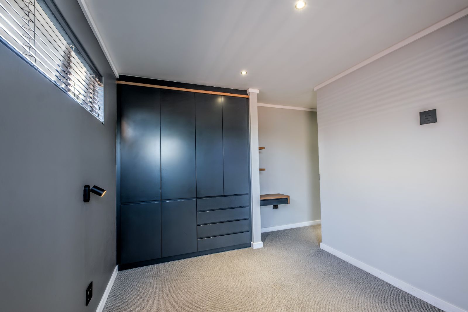 The sleek, contemporary kitchen is boasts premium finishes and a large kitchen island equipped with an under-counter oven and induction hob. Adjacent to the kitchen, a concealed scullery and laundry room provide ample storage and easy access to a generously sized double garage with tiled floors and built-in cupboards — perfect for extra gear or sports equipment.