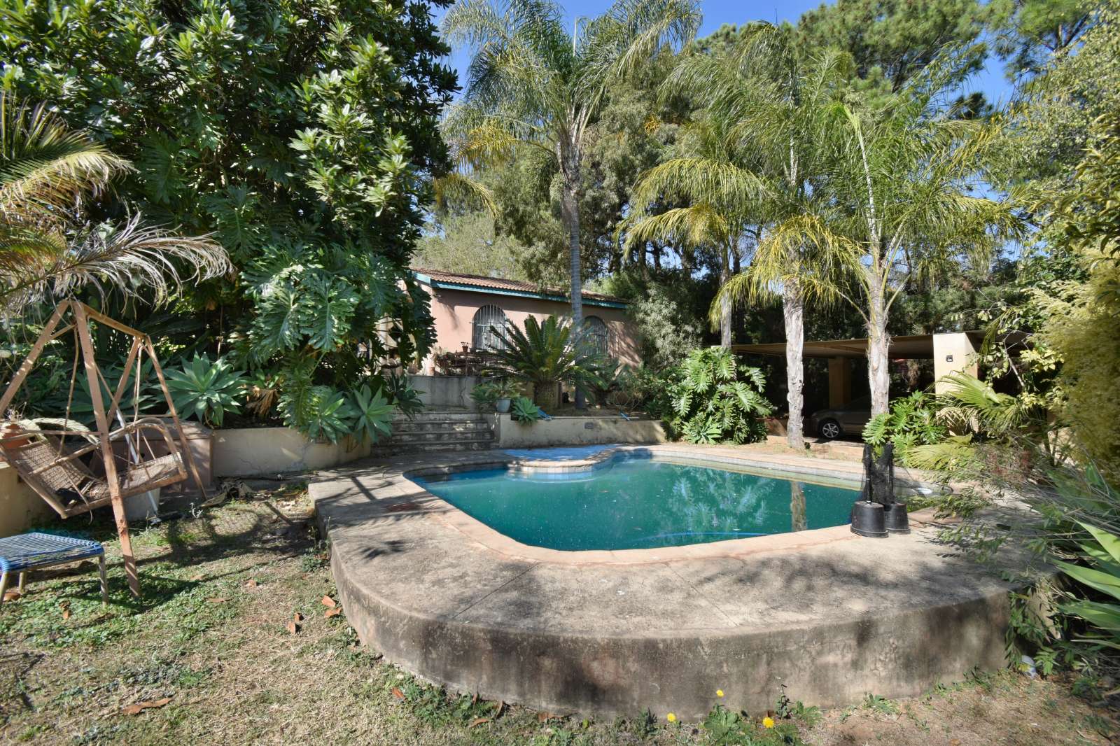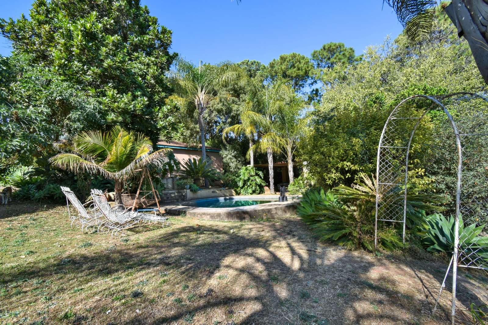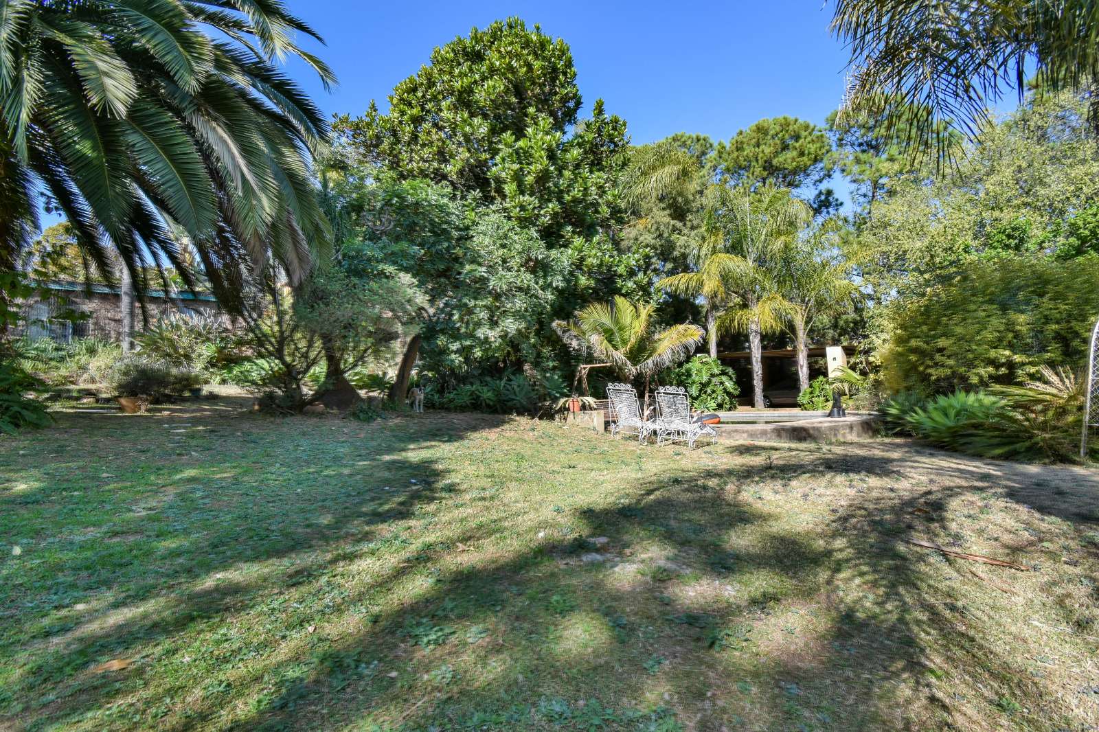 Expansive patio leading out to a lush garden and sparkling pool – ideal for entertaining