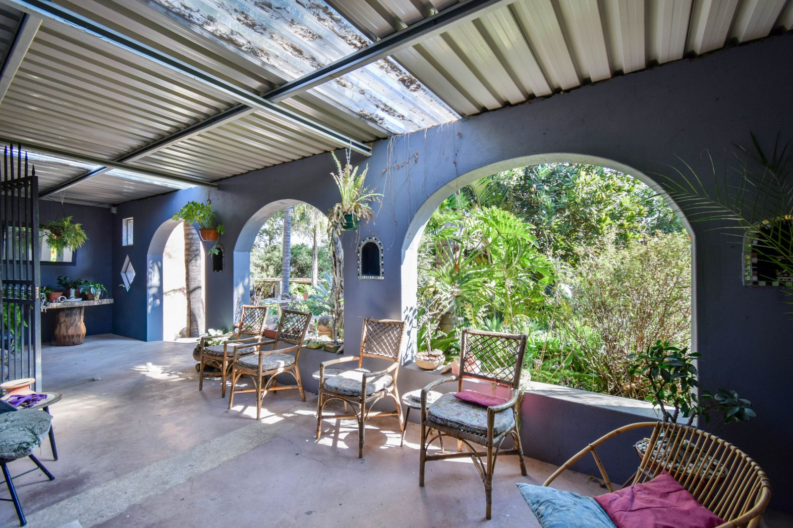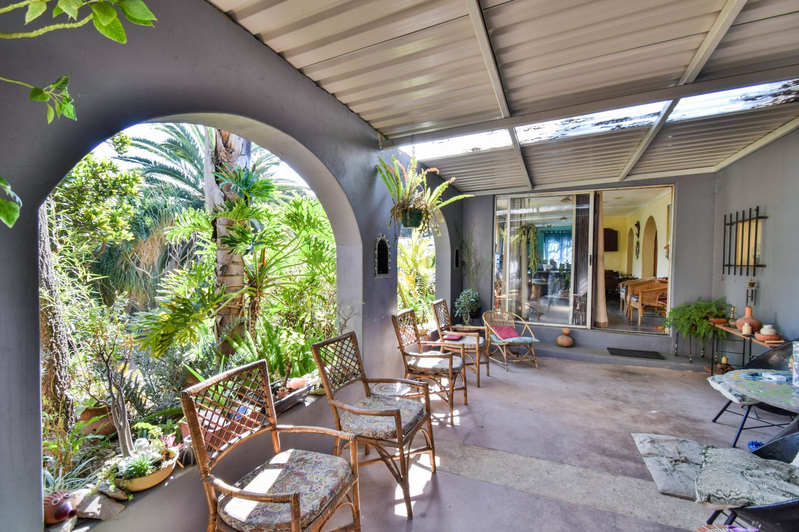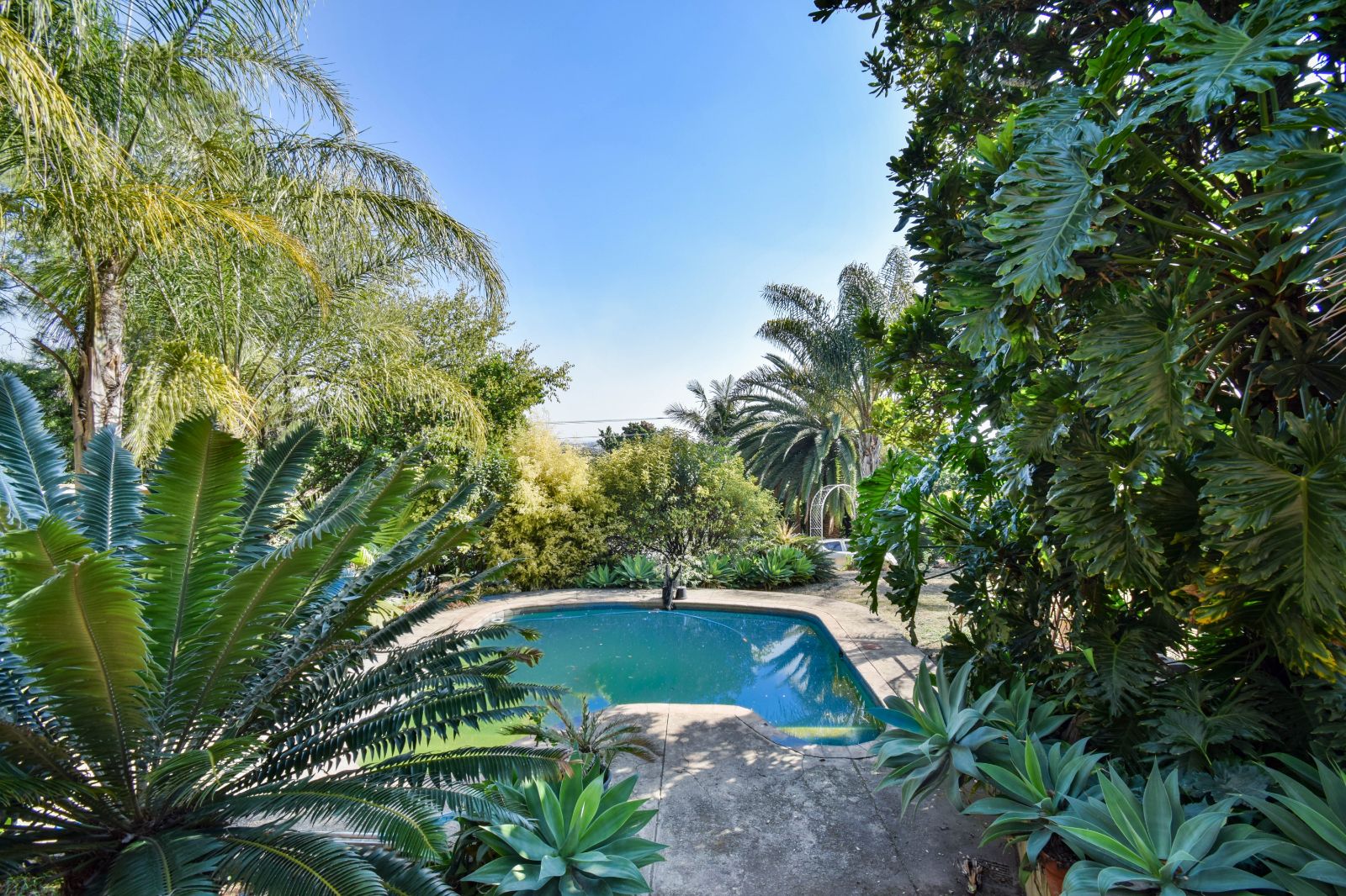 Expansive patio leading out to a lush garden and sparkling pool – ideal for entertaining
