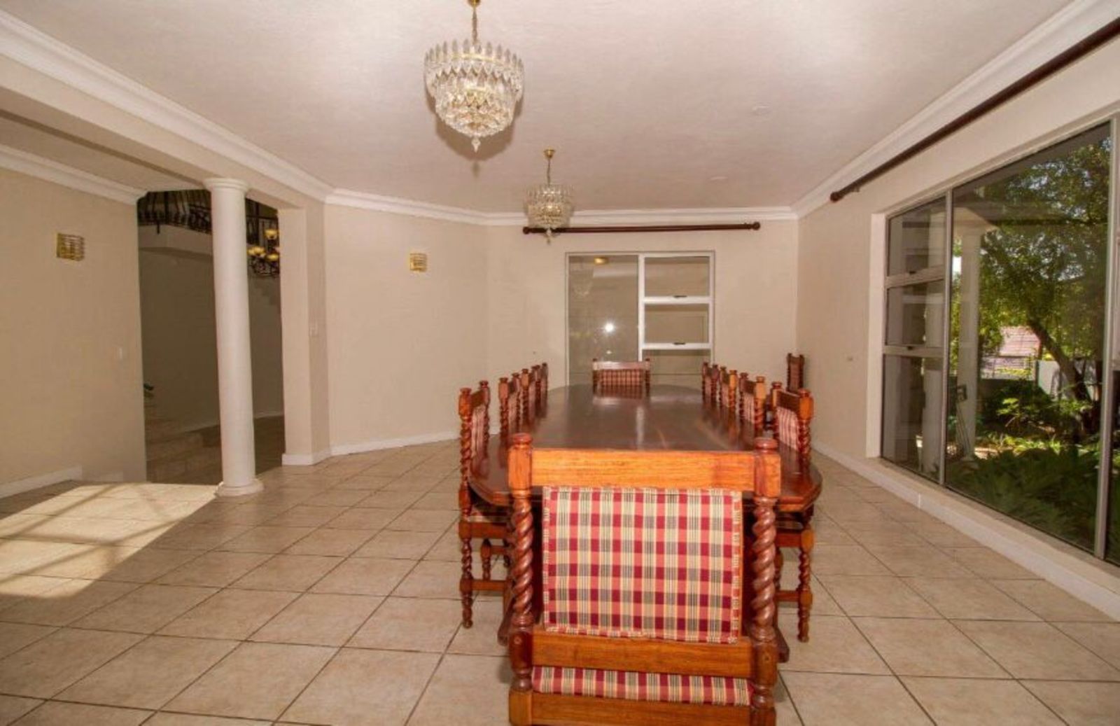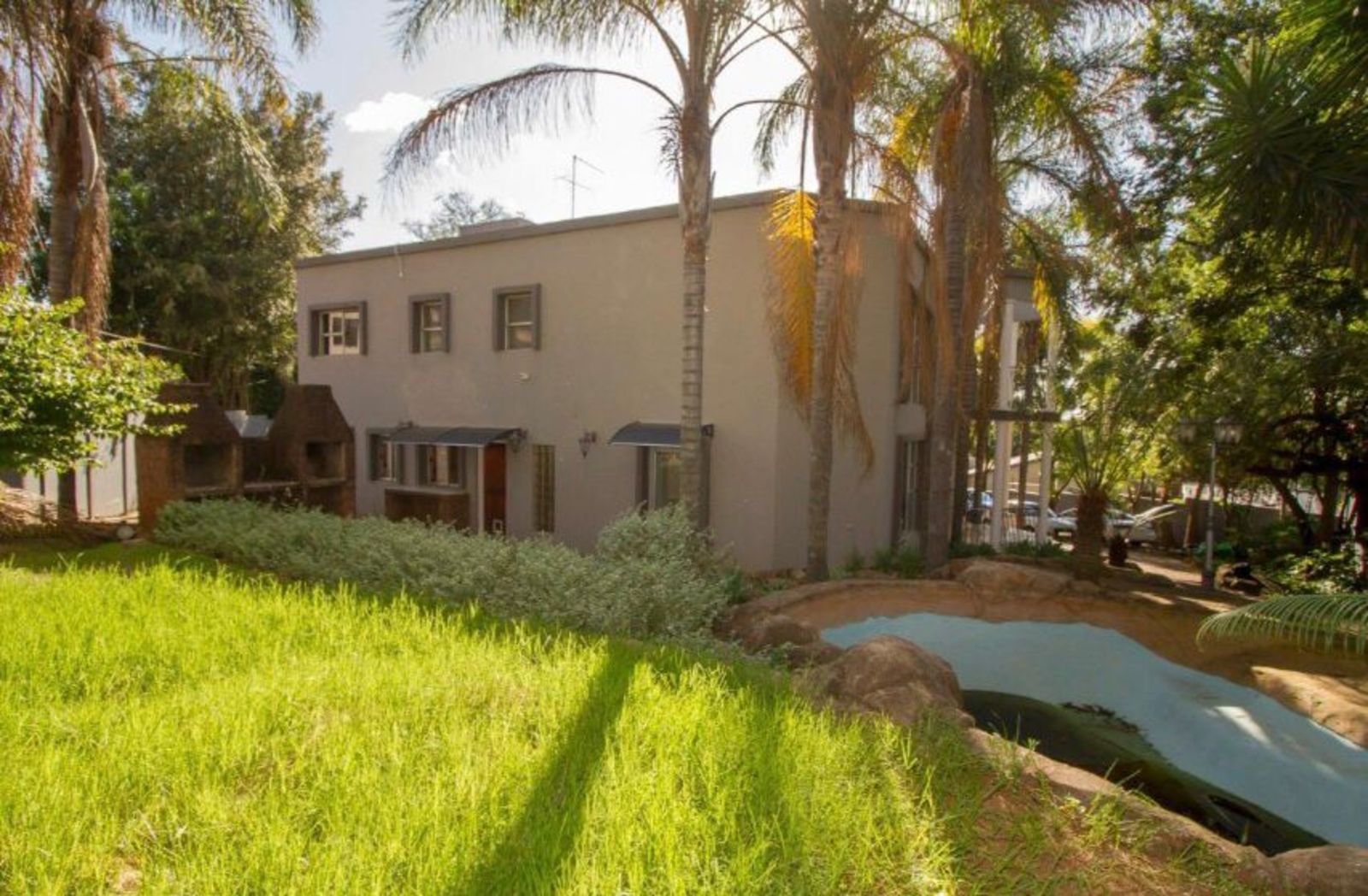 The property’s outdoor spaces are designed for leisure and entertainment, featuring a sparkling swimming pool, built-in braais, and a beautifully treed garden.