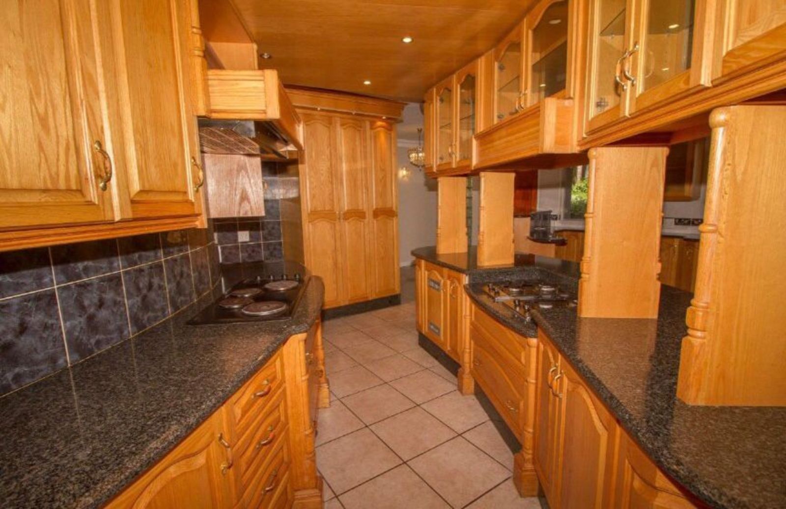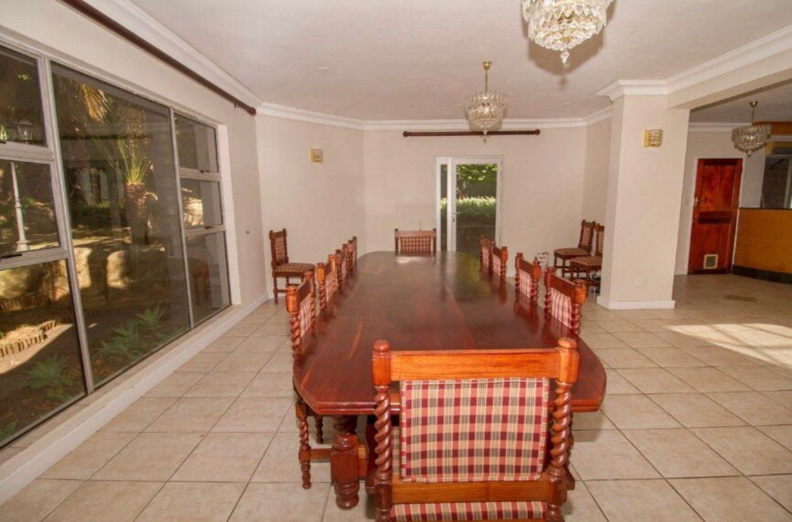 The heart of the home unfolds into an open-plan living and dining area, designed for effortless flow between indoor and outdoor spaces. The dining room, perfect for entertaining, connects seamlessly to the garden and pool area, while the well-appointed kitchen with separate scullery and laundry ensures practicality and style in equal measure.
