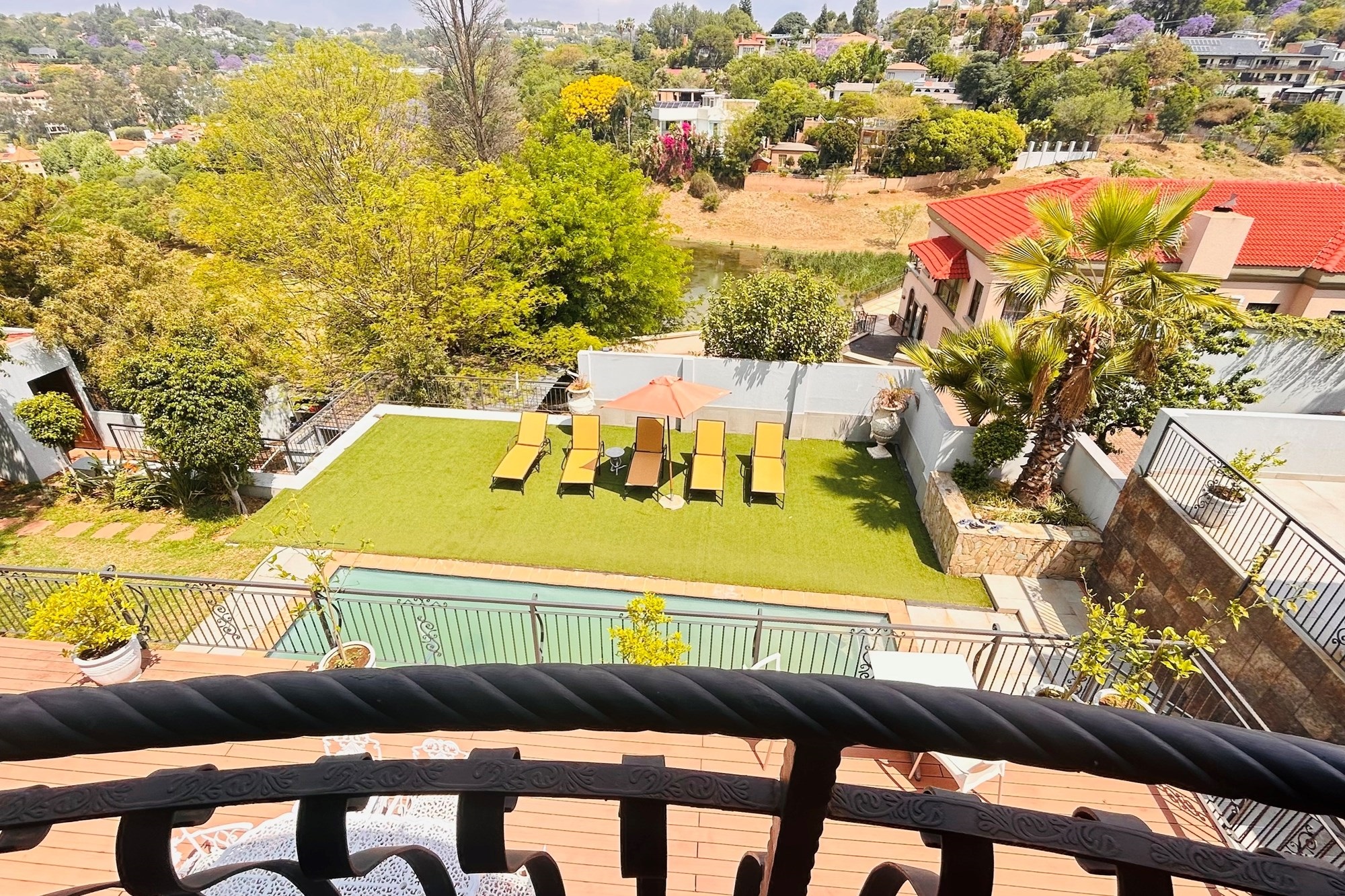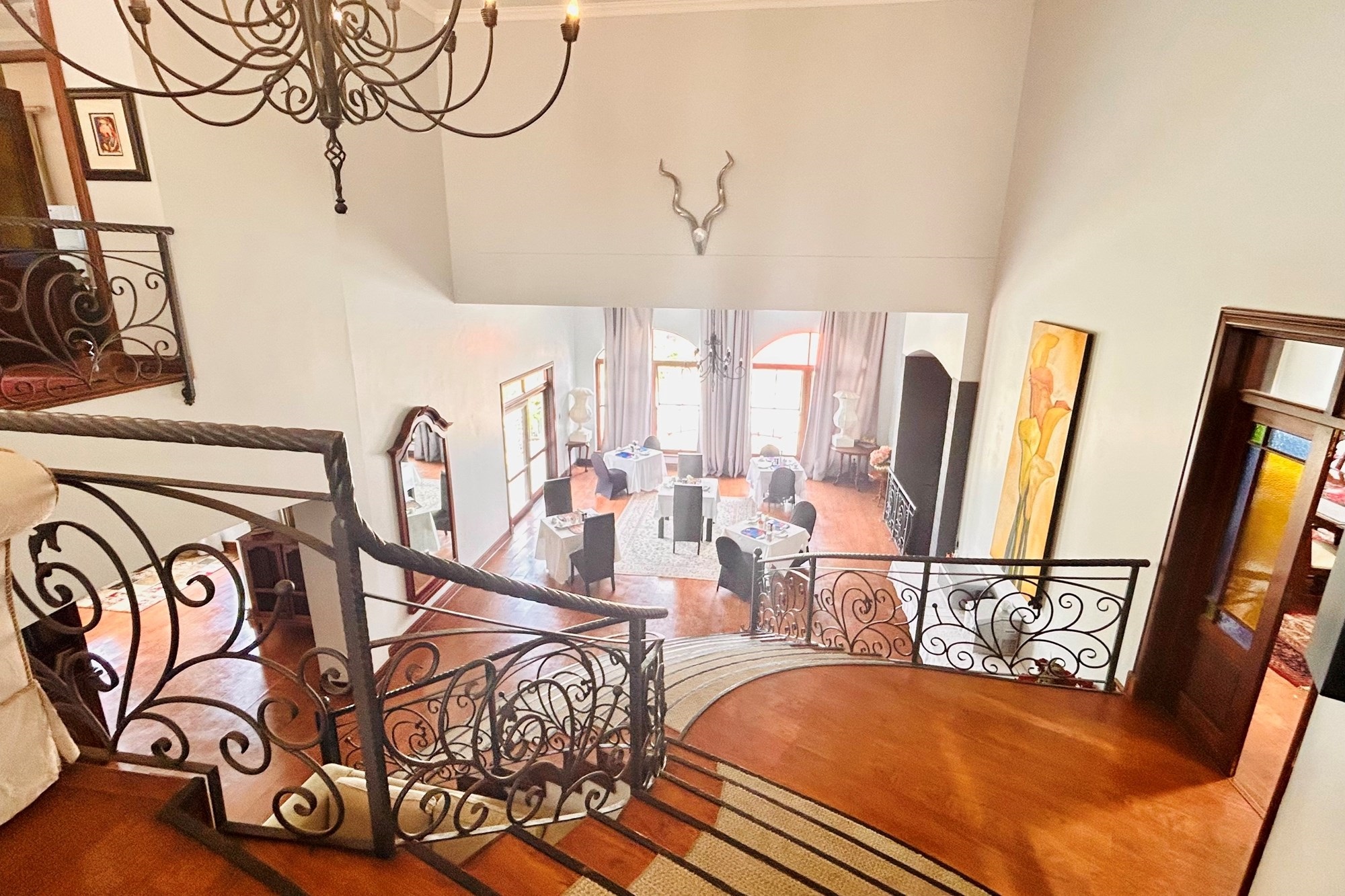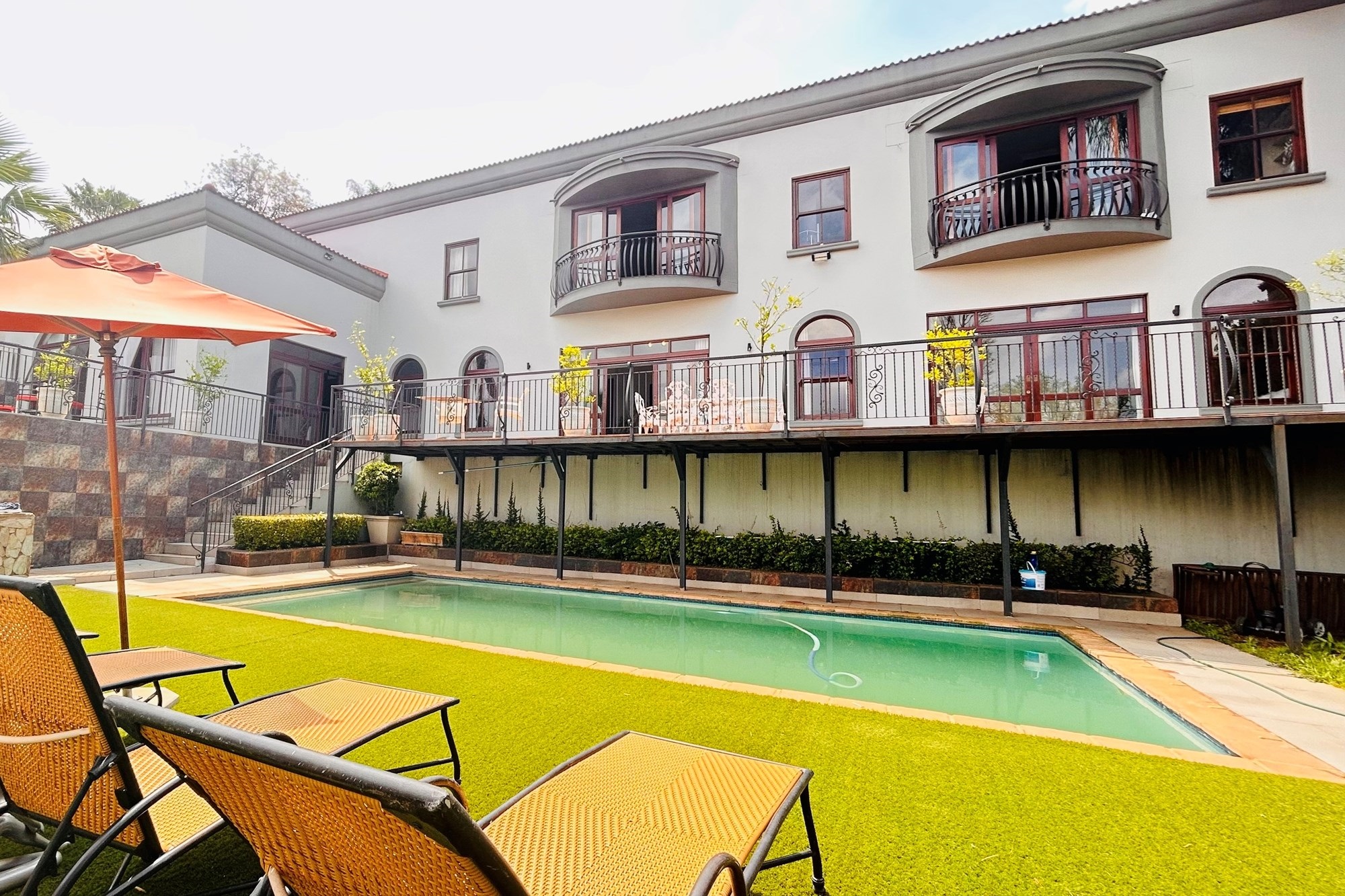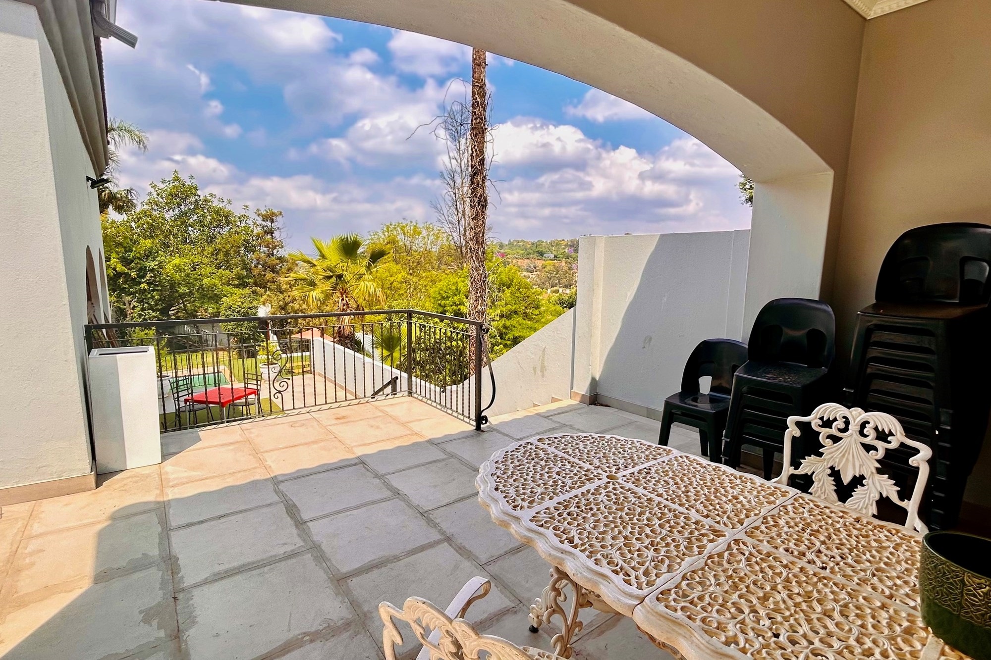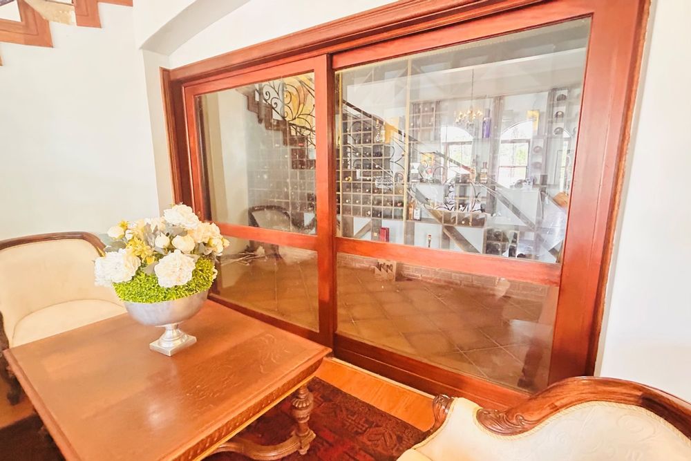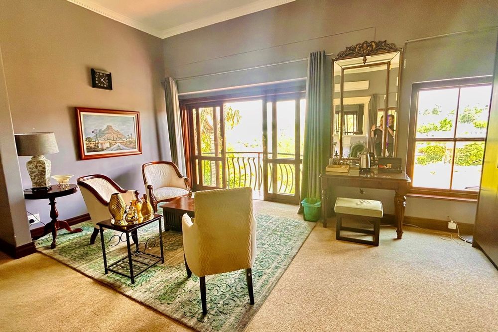 Property Features:7 En-suite Bedrooms– Includes a2-bedroom private flatlet, ideal for guests, extended family, or additional rental income.Currently Operated as a Guesthouse– Ready for continued operation or private living.2 Elegant Studies– Offering quiet, sophisticated spaces for work or creativity.Multi-Level Living Spaces– Double-volume entrance foyer, formal dining, expansive living areas, and an impressive wine cellar.Outdoor Braai & Entertainment Area– Seamless indoor-outdoor flow, perfect for entertaining guests or enjoying family time.Private Pool– Set against panoramic views, this large pool is ideal for relaxation and poolside gatherings.4 Garages, 5 Parking Spaces & 2 Carports– Ample secure parking for family and guests.Porte-cochere Entrance– A grand, welcoming feature adding to the property’s ambassadorial appeal.Dedicated Guardhouse & Security– Two security guards ensure 24-hour protection, allowing complete peace of mind.No Loadshedding– Full power backup for uninterrupted comfort and convenience.