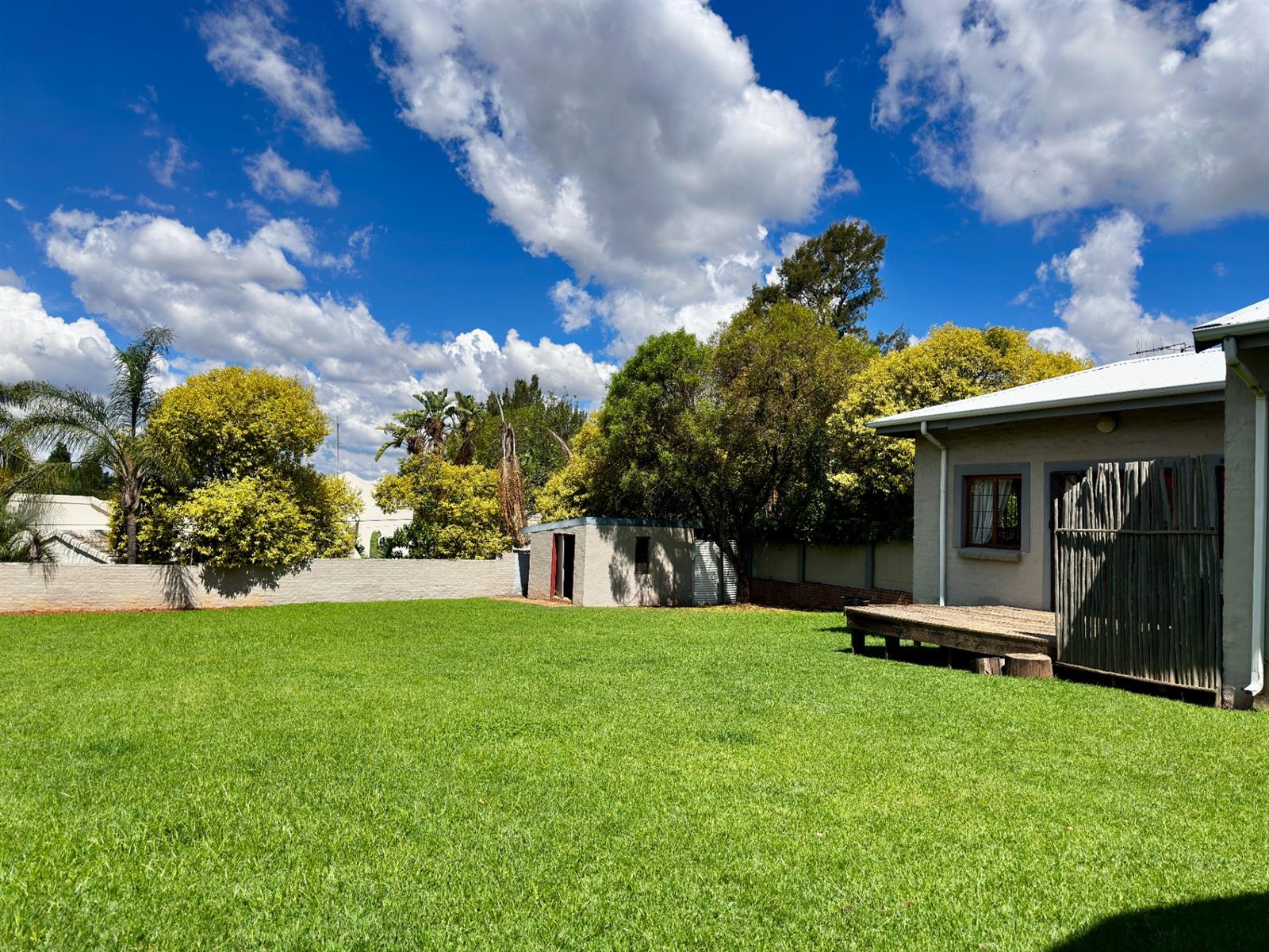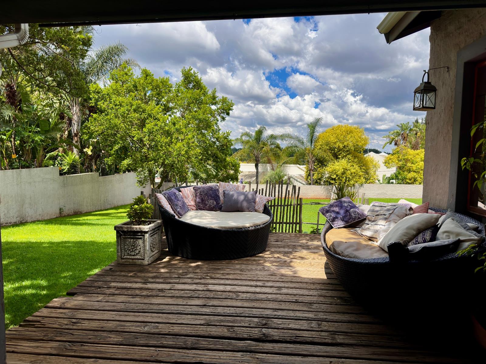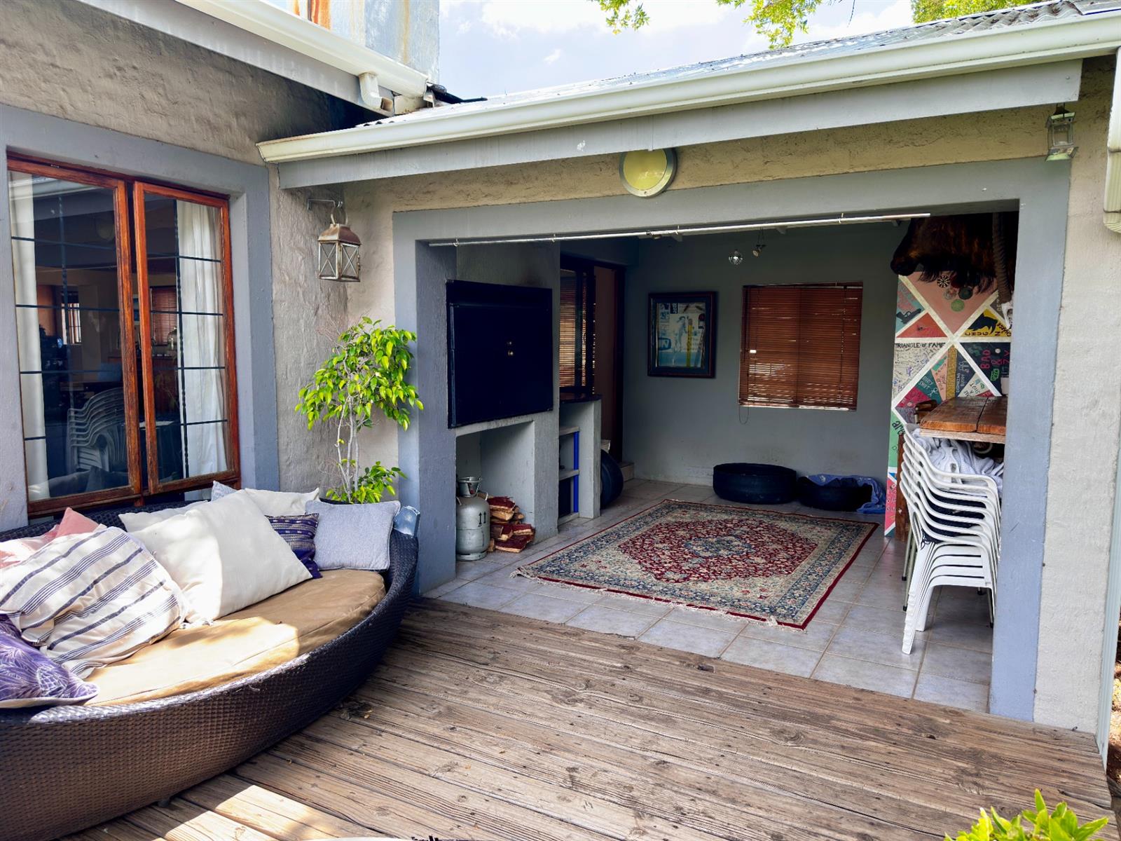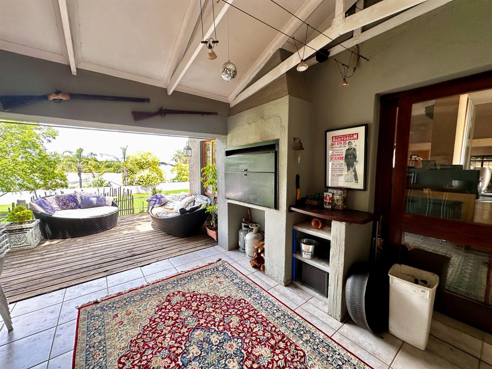 The living areas open onto a large covered patio with a built-in braai, overlooking rolling lawns and a beautifully spacious garden — a rare offering that delivers privacy, potential, and room to grow.
