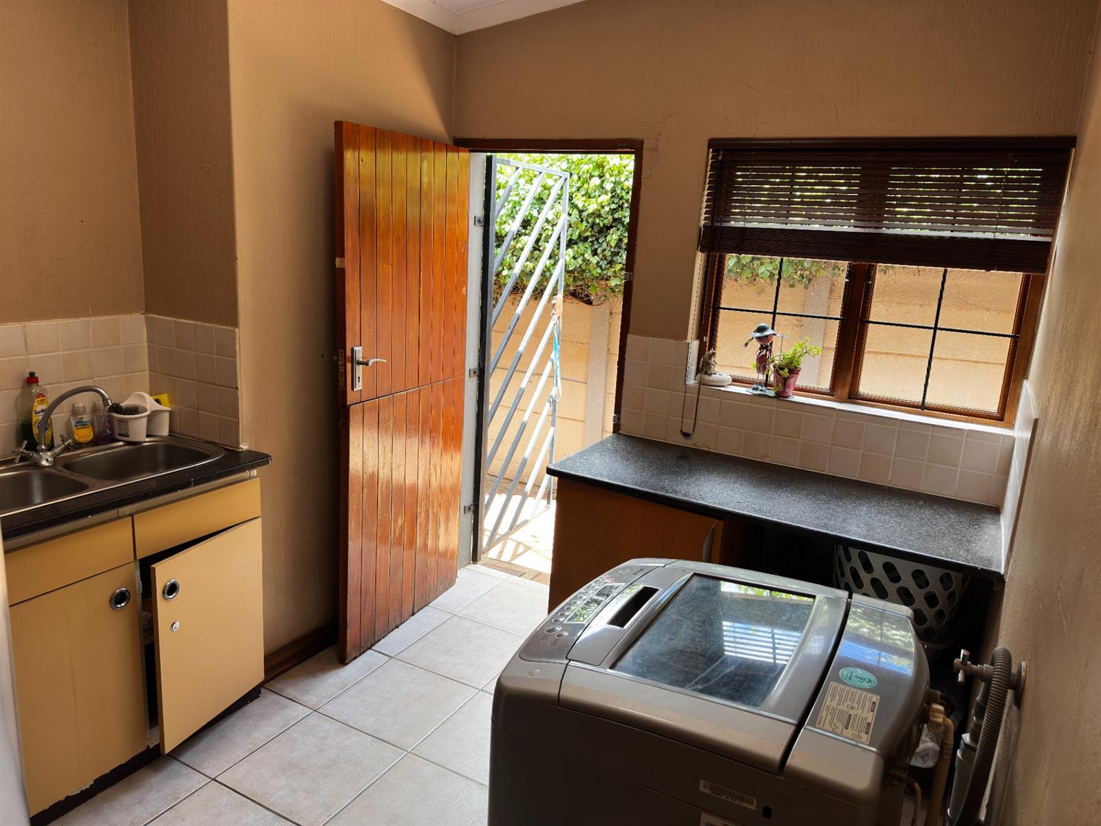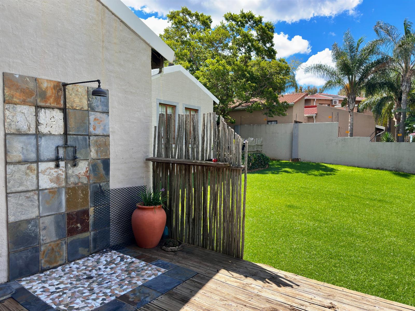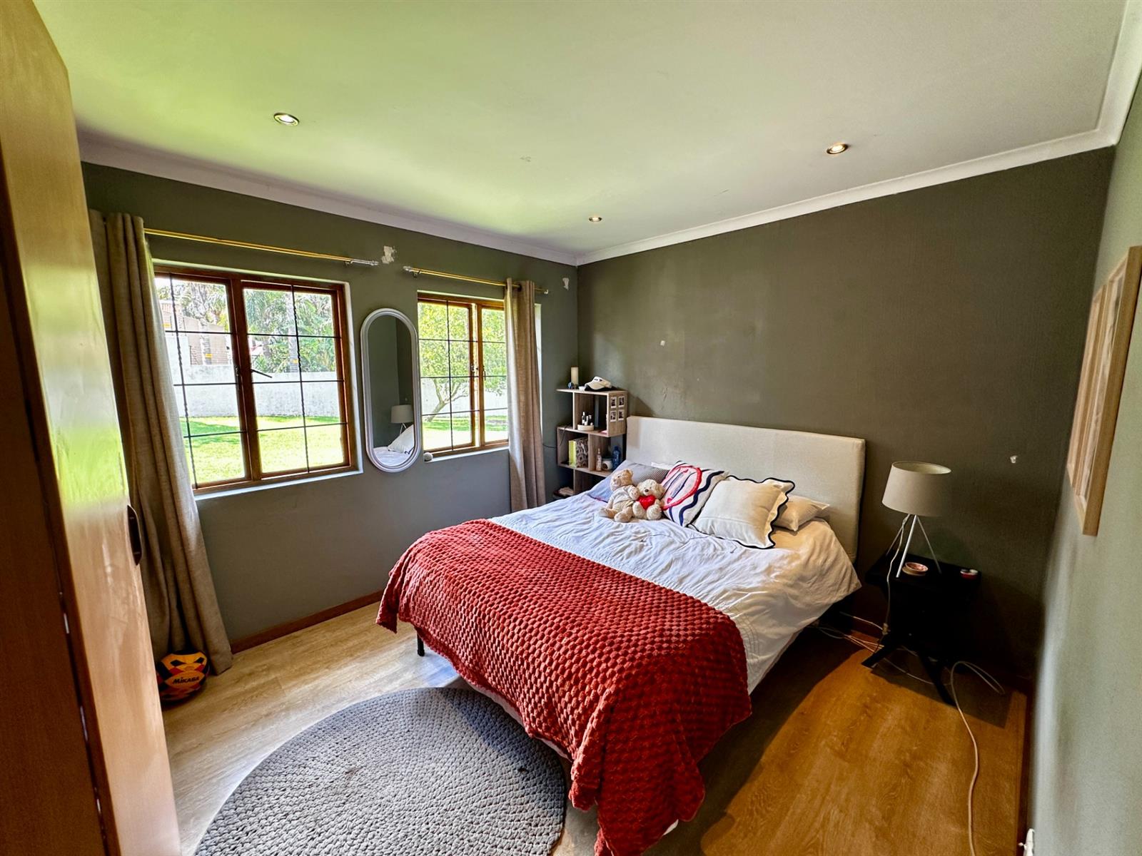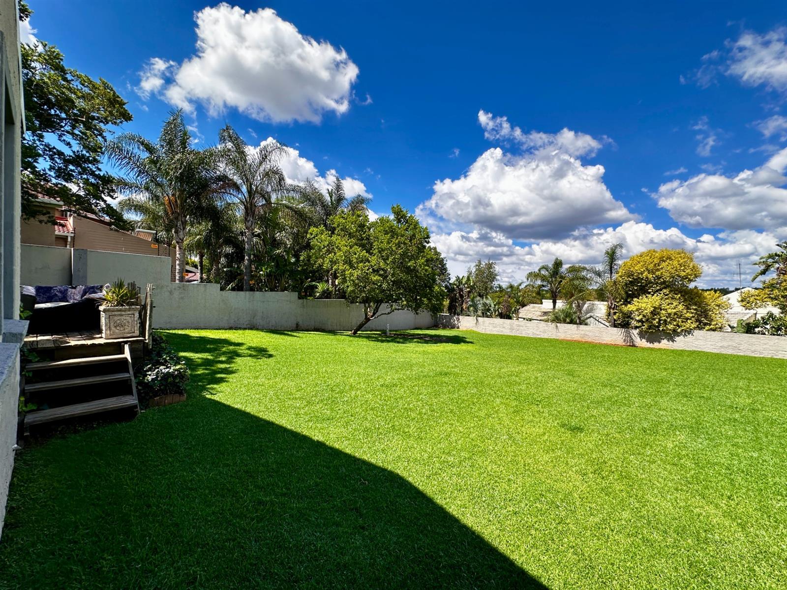 The living areas open onto a large covered patio with a built-in braai, overlooking rolling lawns and a beautifully spacious garden — a rare offering that delivers privacy, potential, and room to grow.