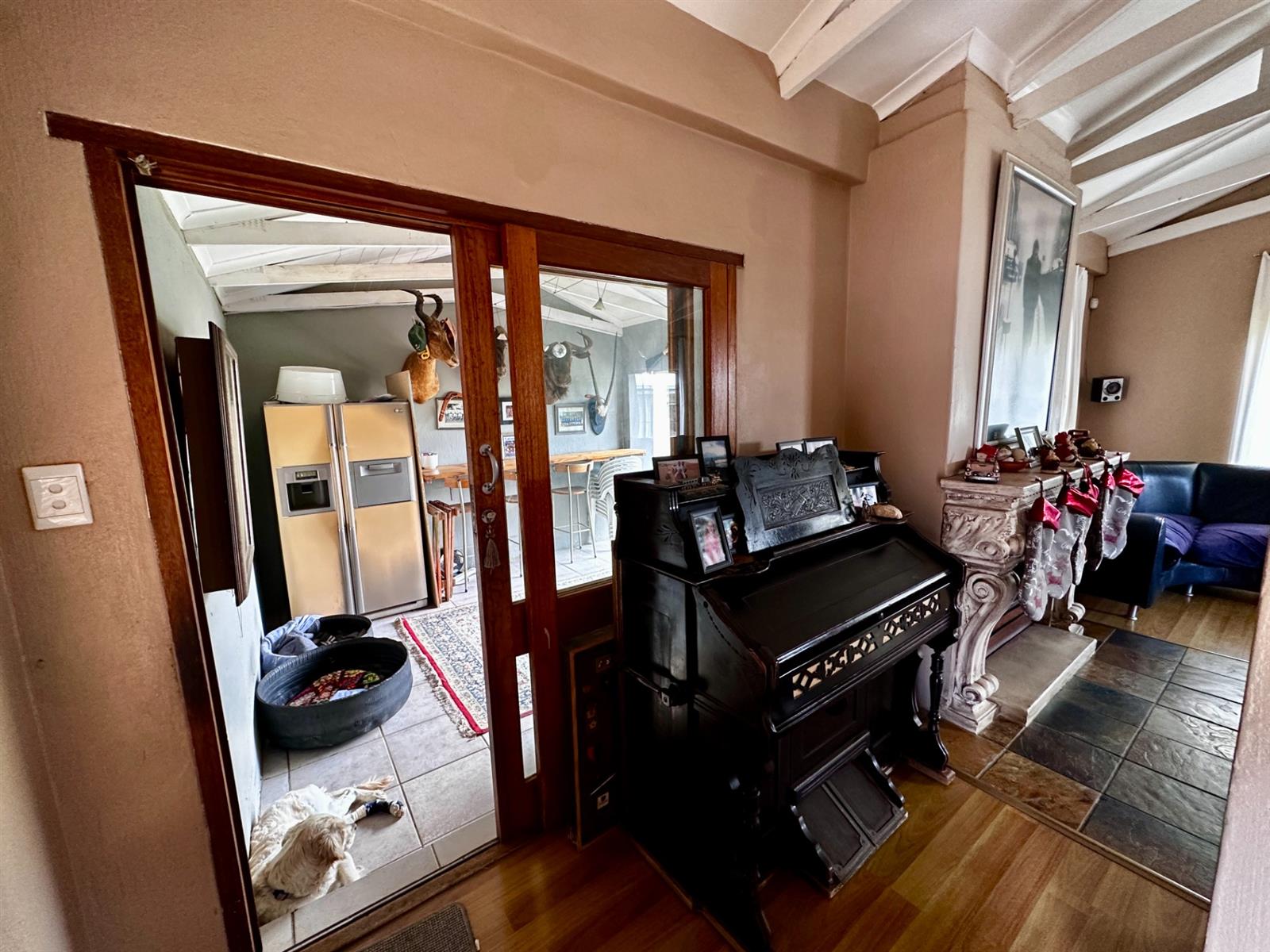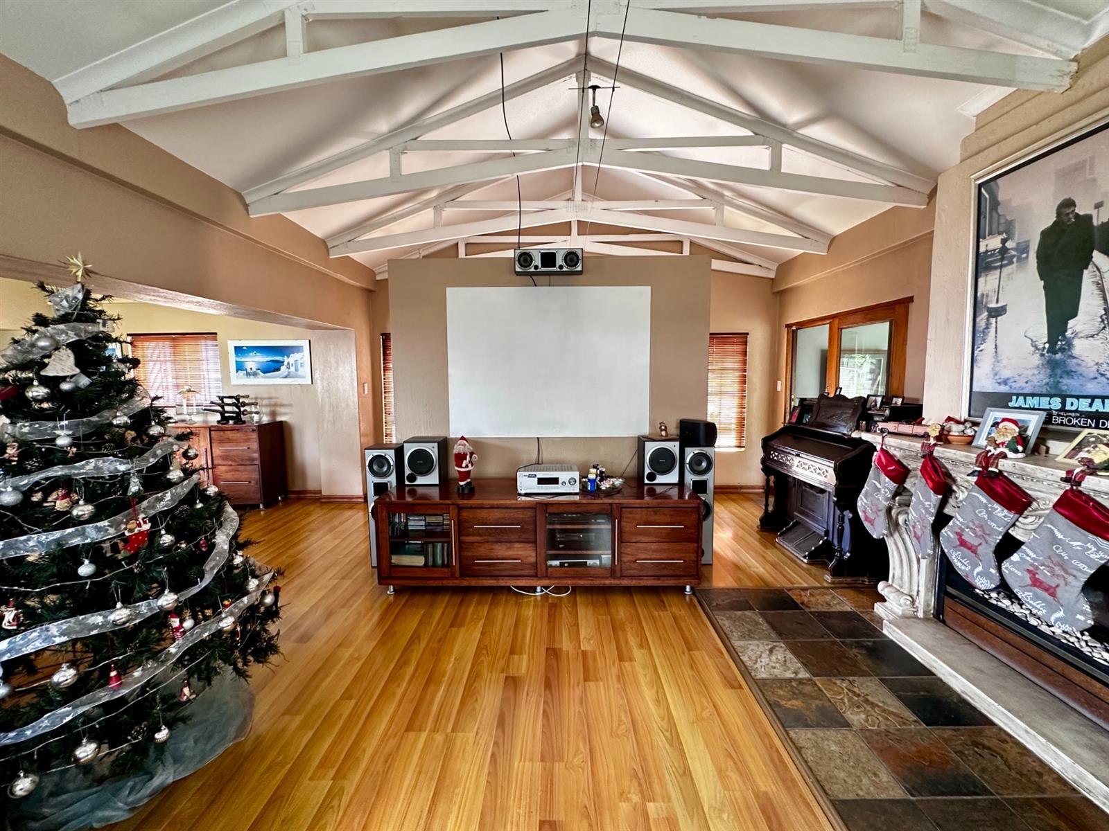 A welcoming entrance hall leads into a light-filled lounge highlighted by exposed trusses and a striking gas fireplace, creating a warm and inviting focal point. The lounge flows seamlessly into the dining area, where the fireplace continues to enhance the ambience — perfect for intimate dinners and family gatherings.
