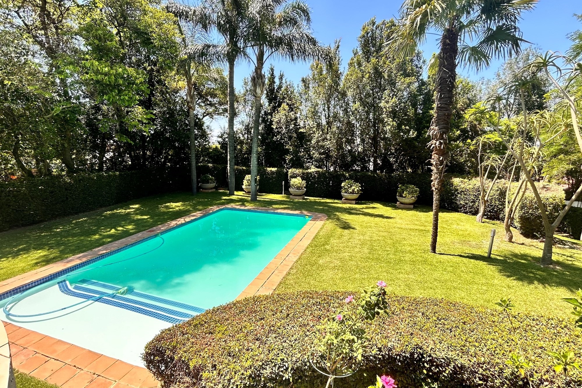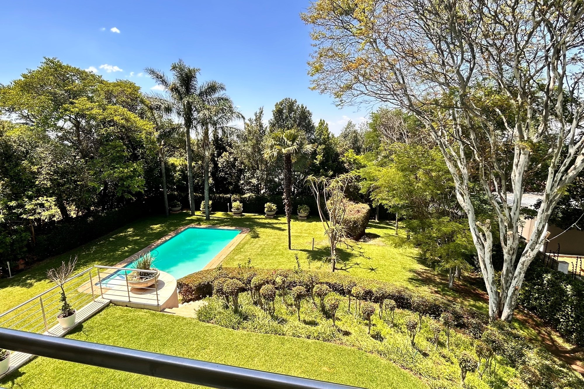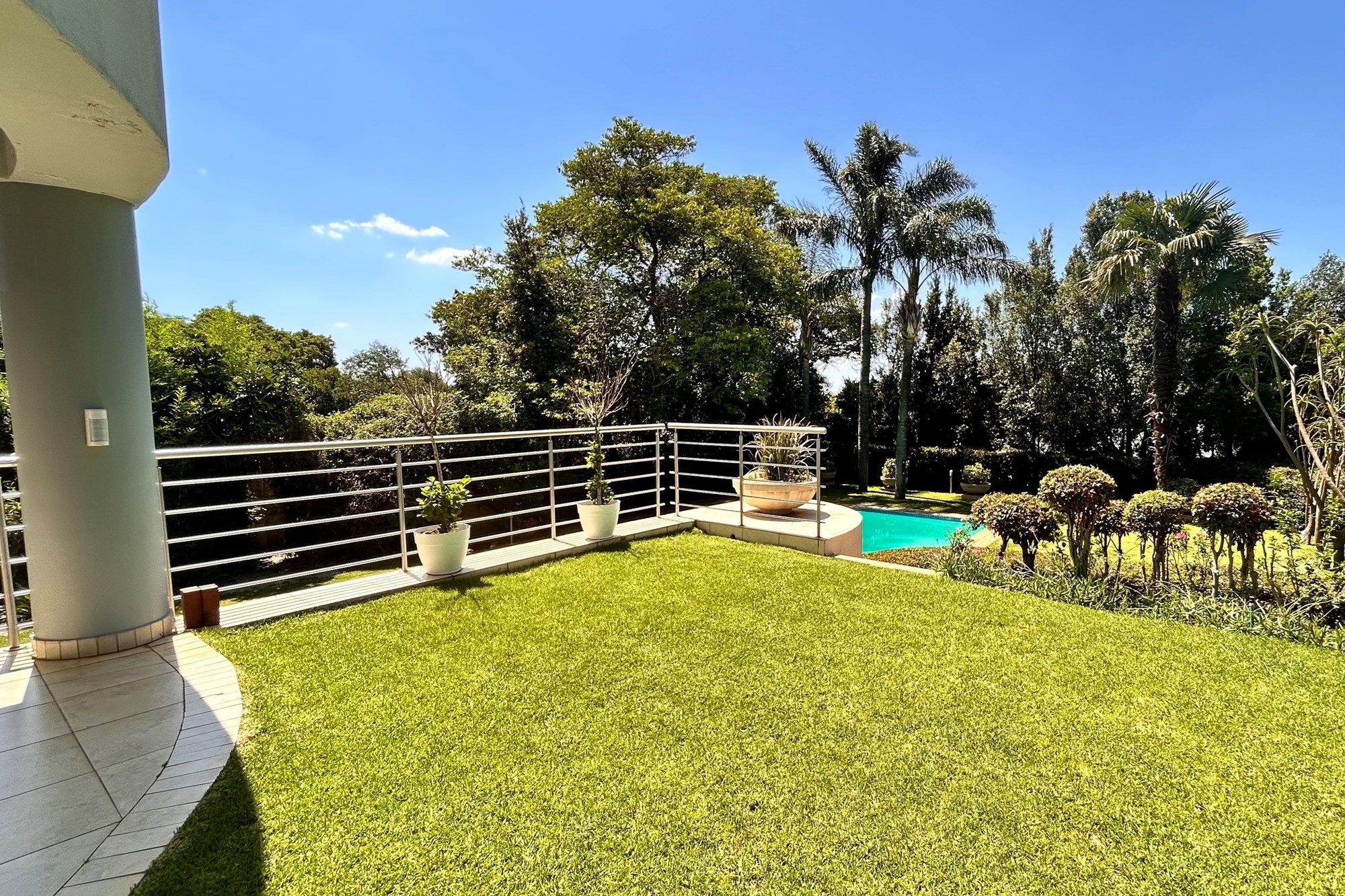 Covered patio with a builtin gas braai.Landscaped gardens and a sparkling pool accessed via charming staircases.