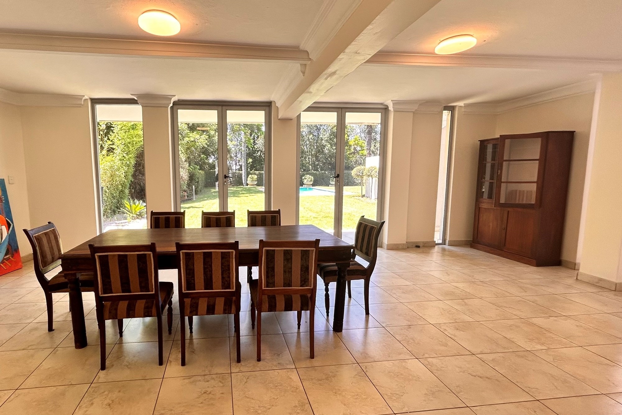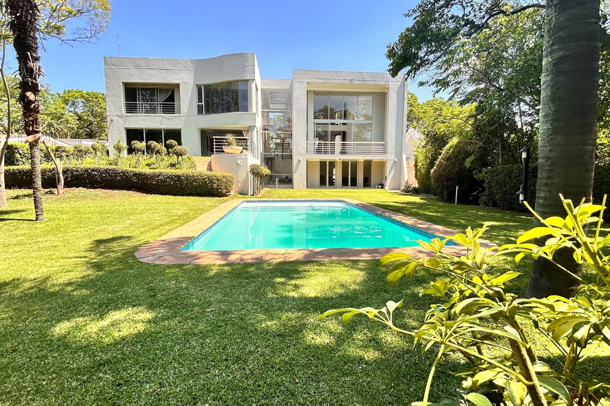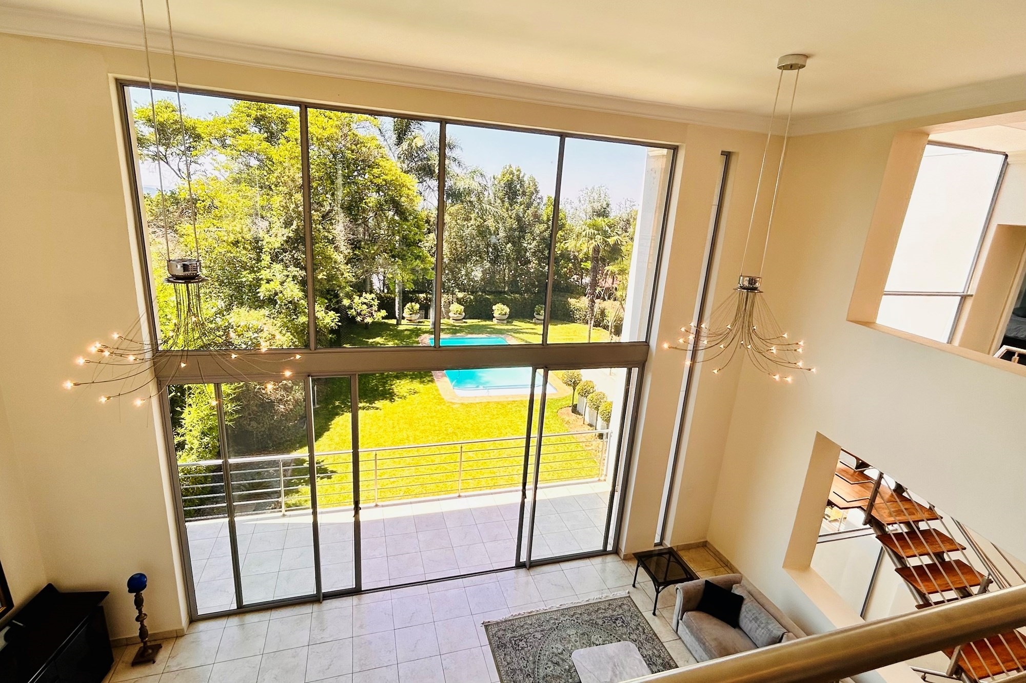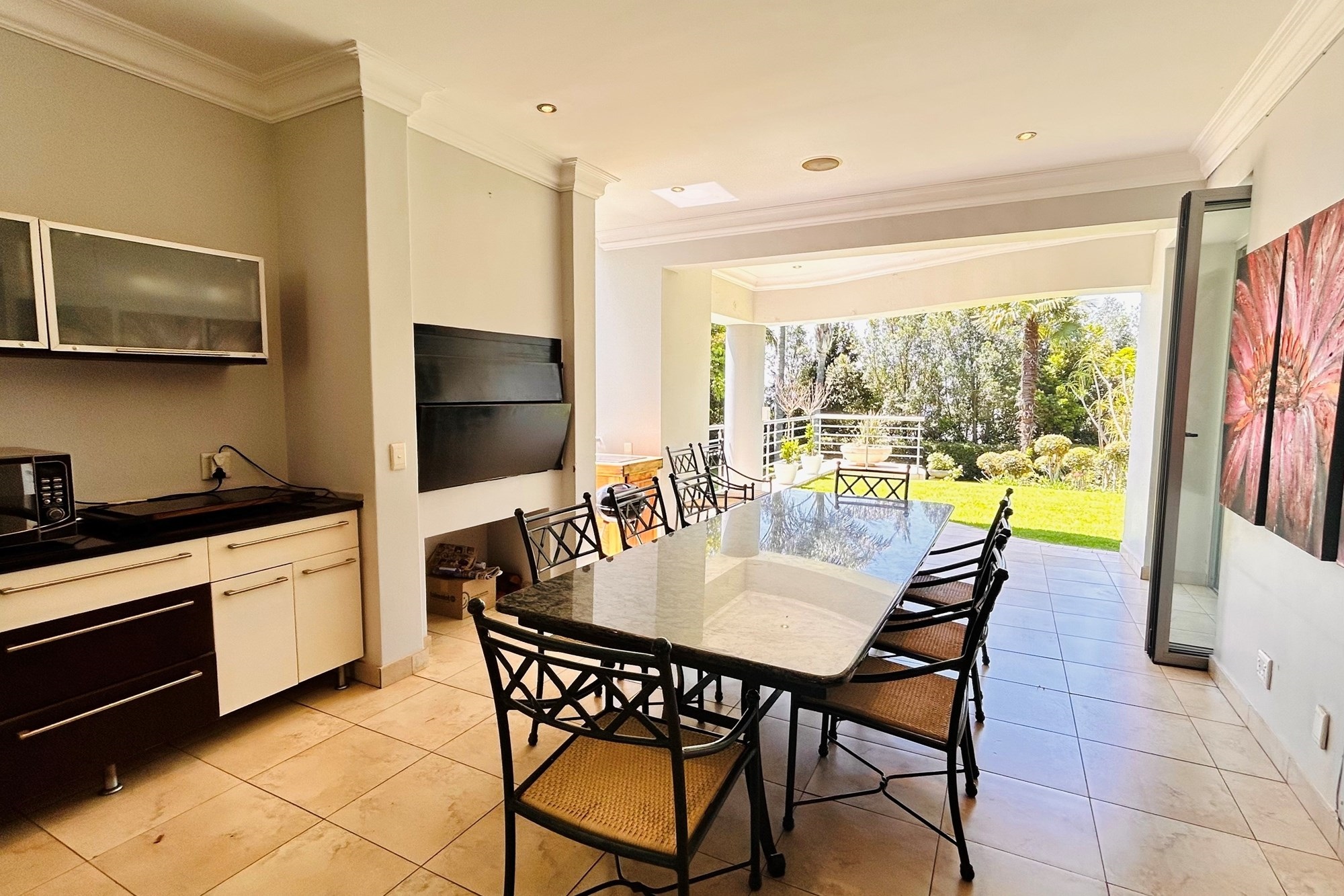Covered patio with a builtin gas braai.Landscaped gardens and a sparkling pool accessed via charming staircases.