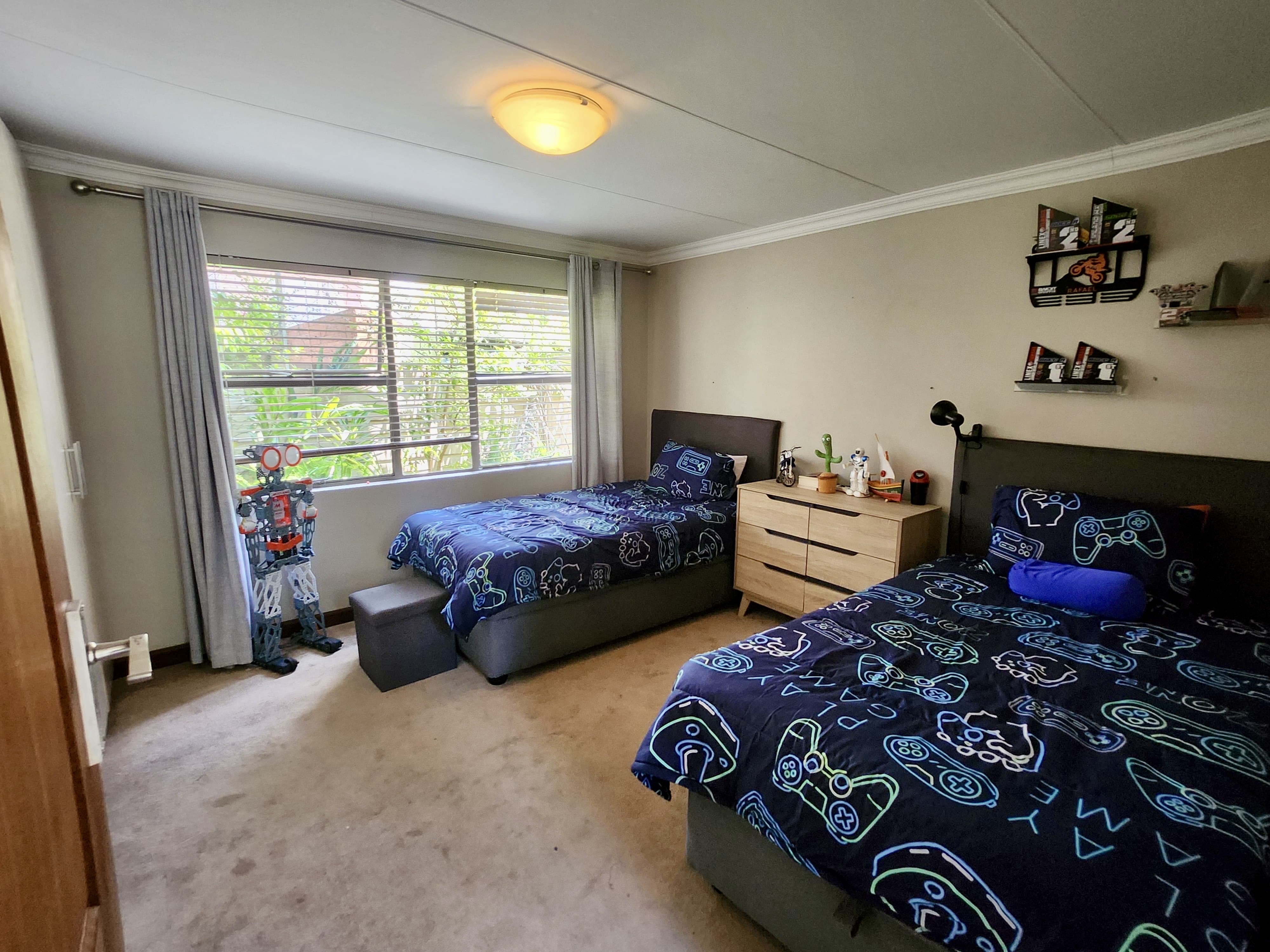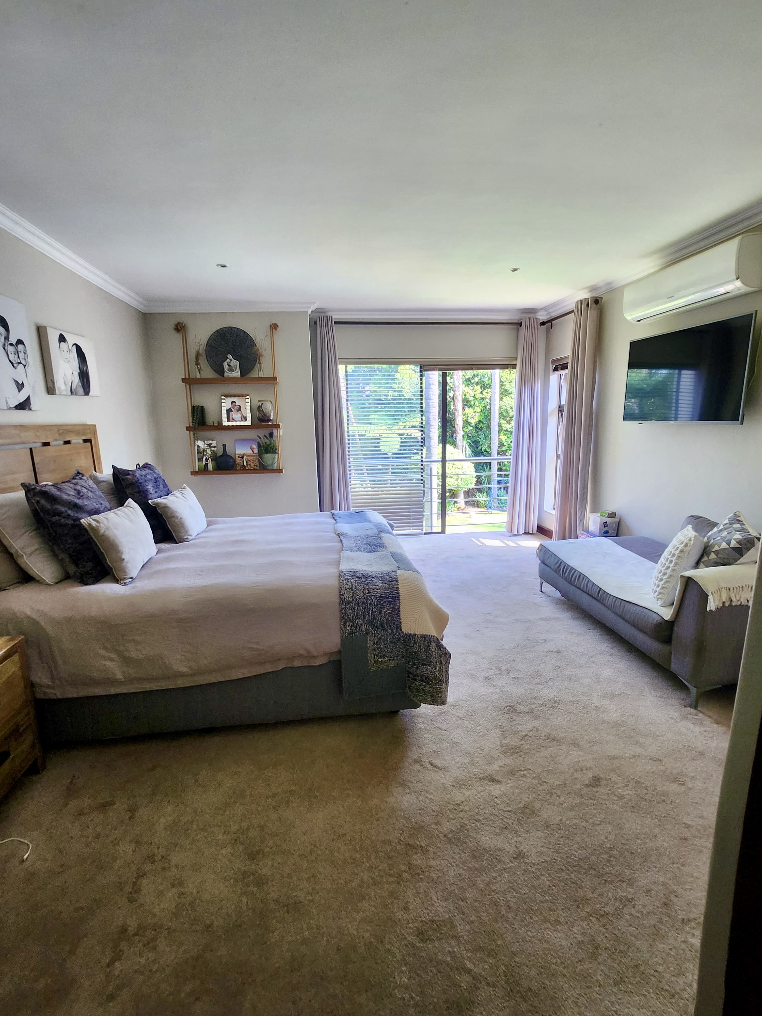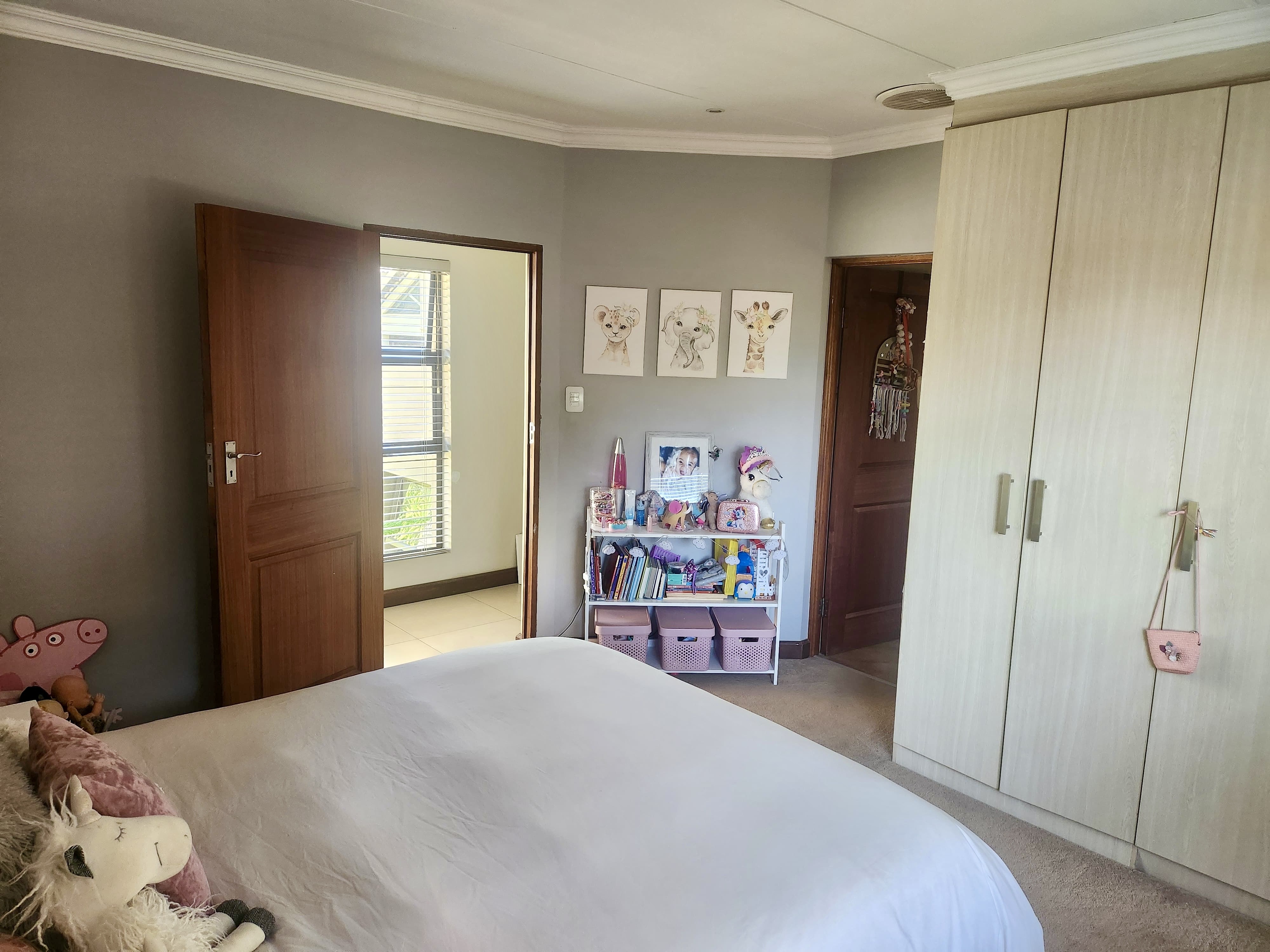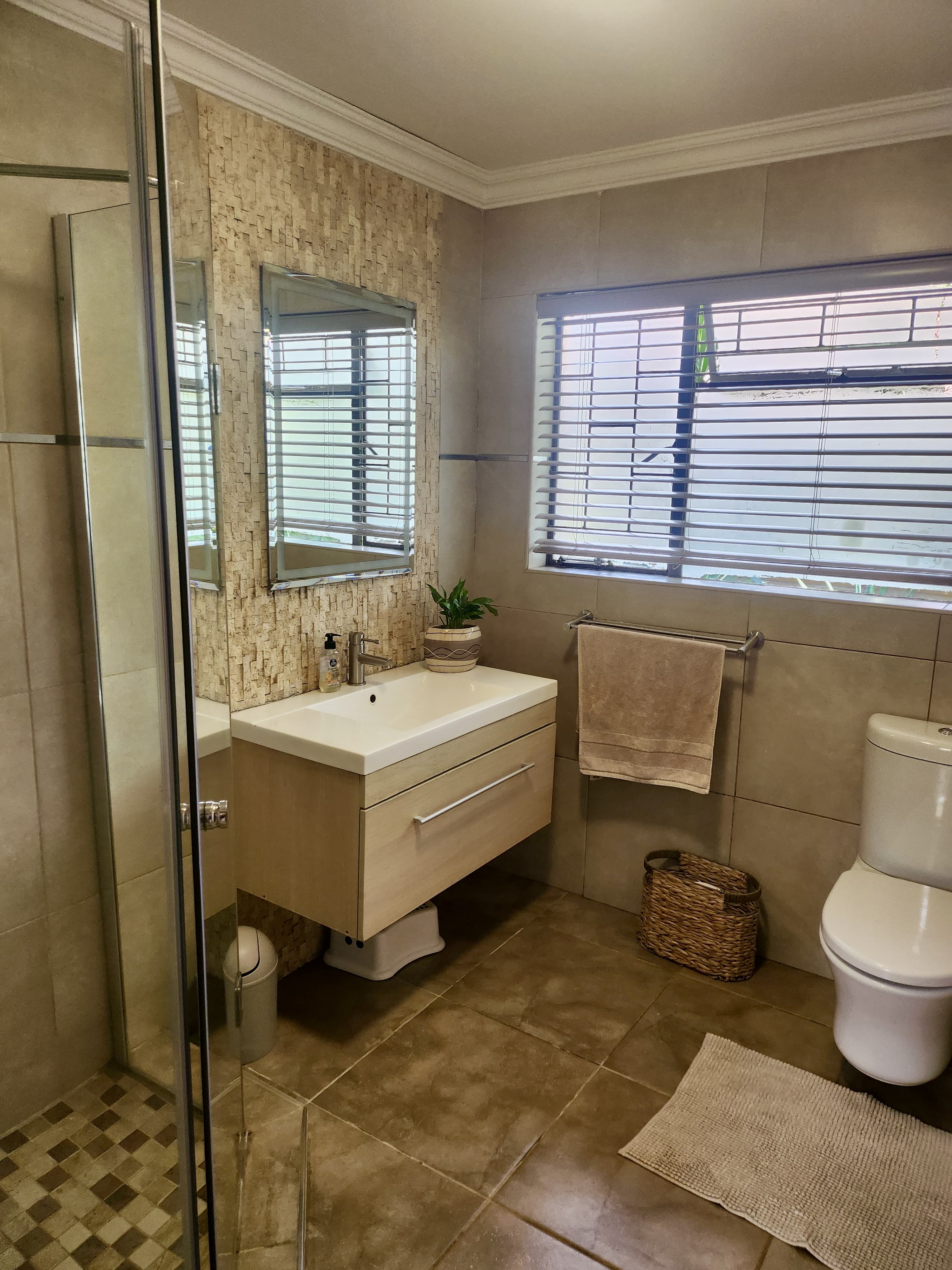 Upstairs, you’ll find the expansive main bedroom (25 m2 | 5 m x 5 m) with air-conditioning, an adjoining dressing area and a large en-suite bathroom. The second upstairs bedroom measures 14 m2 (4 m x 3.5 m) and also features its own en-suite. The third bedroom is located on the lower level and matches the size of the second bedroom, with a bathroom conveniently adjacent.