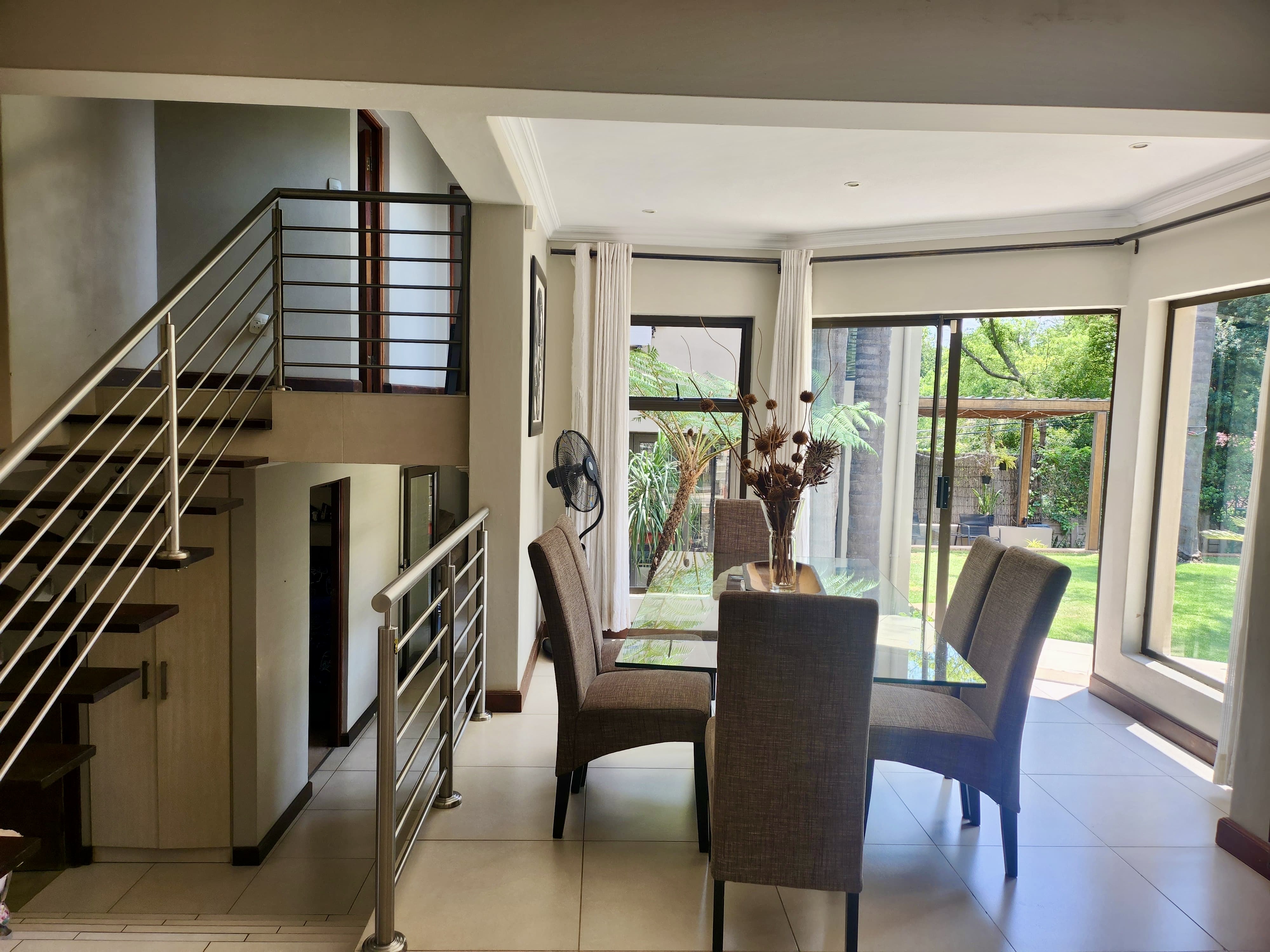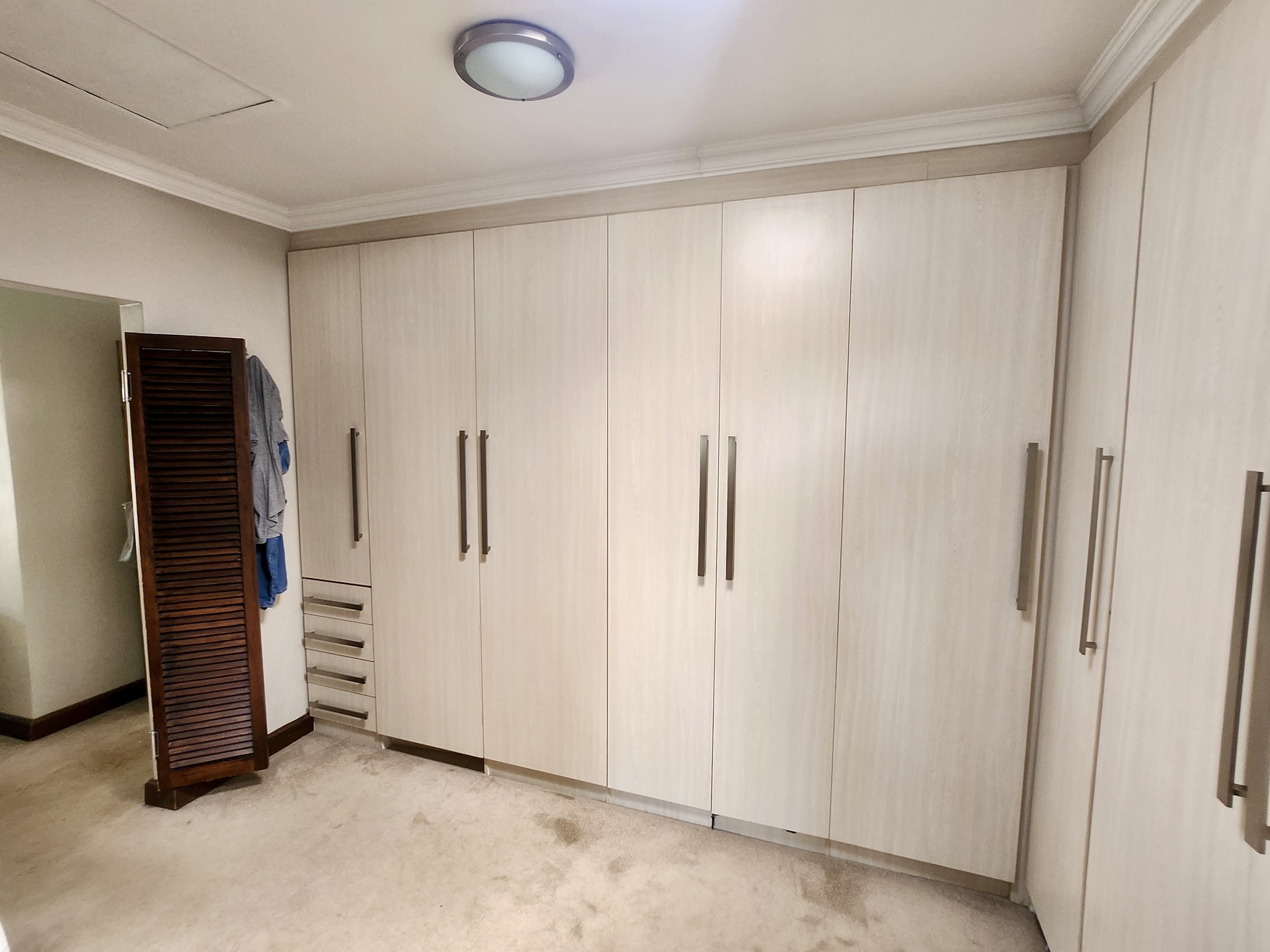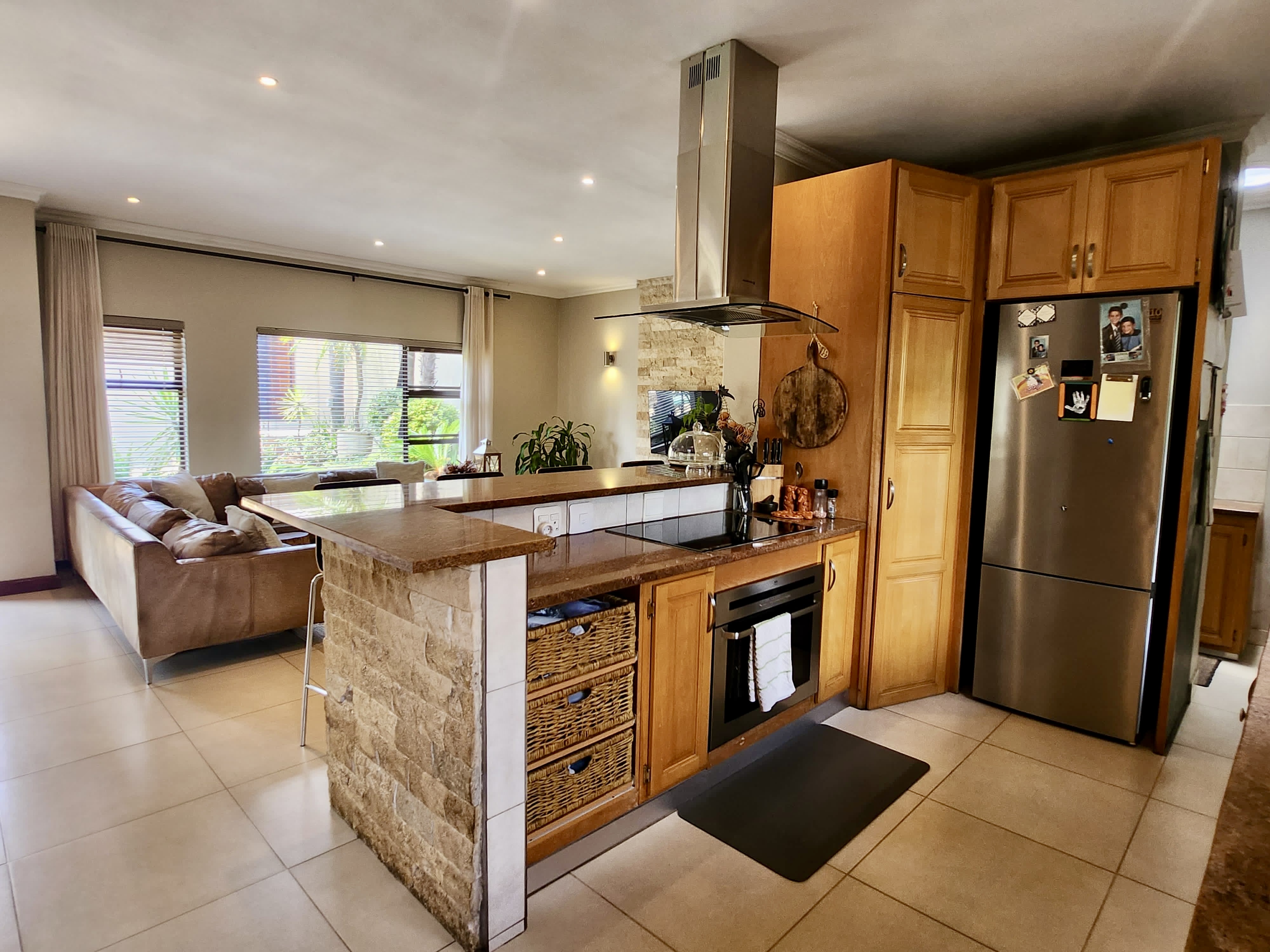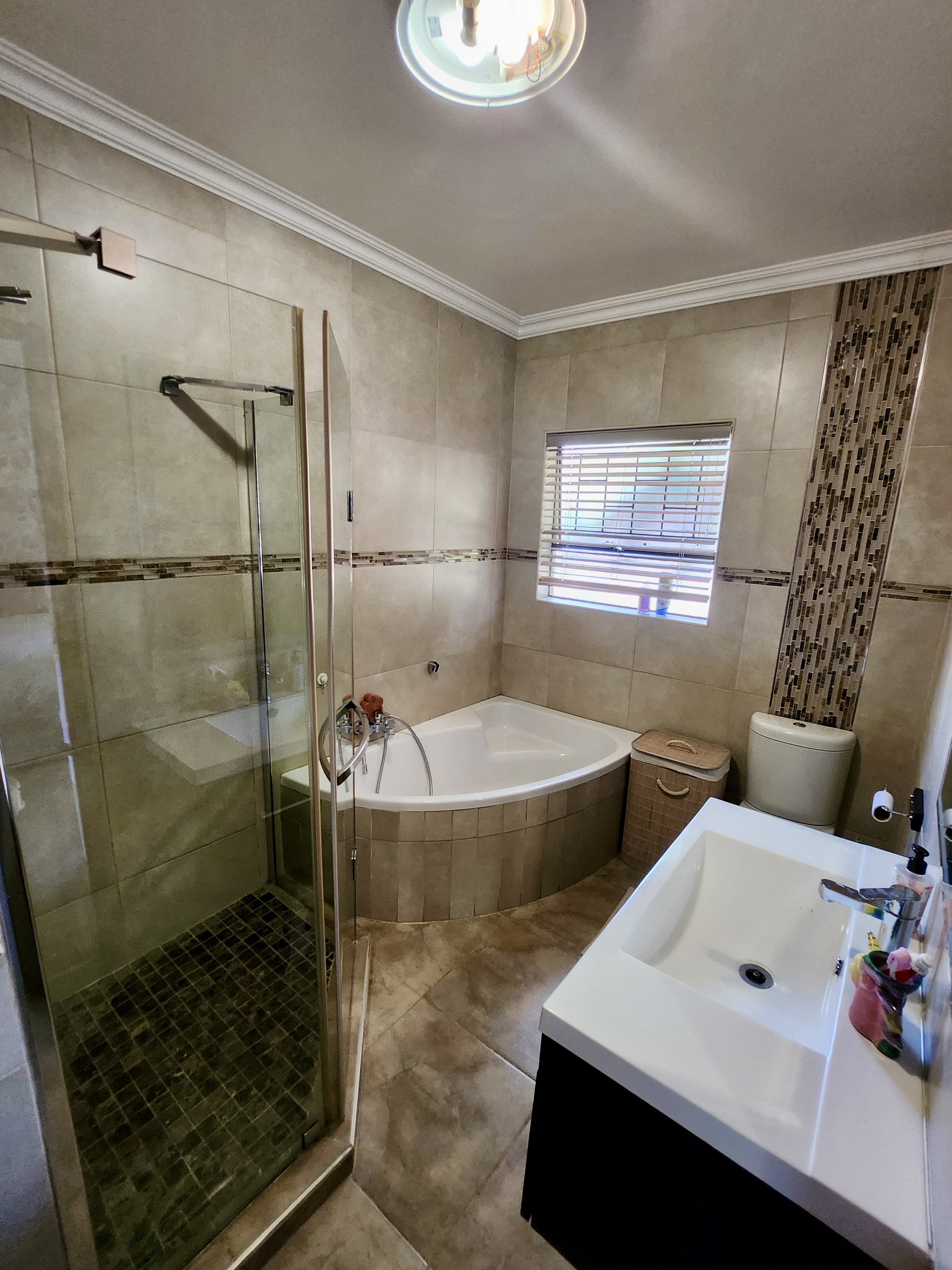 Upstairs, you’ll find the expansive main bedroom (25 m2 | 5 m x 5 m) with air-conditioning, an adjoining dressing area and a large en-suite bathroom. The second upstairs bedroom measures 14 m2 (4 m x 3.5 m) and also features its own en-suite. The third bedroom is located on the lower level and matches the size of the second bedroom, with a bathroom conveniently adjacent.