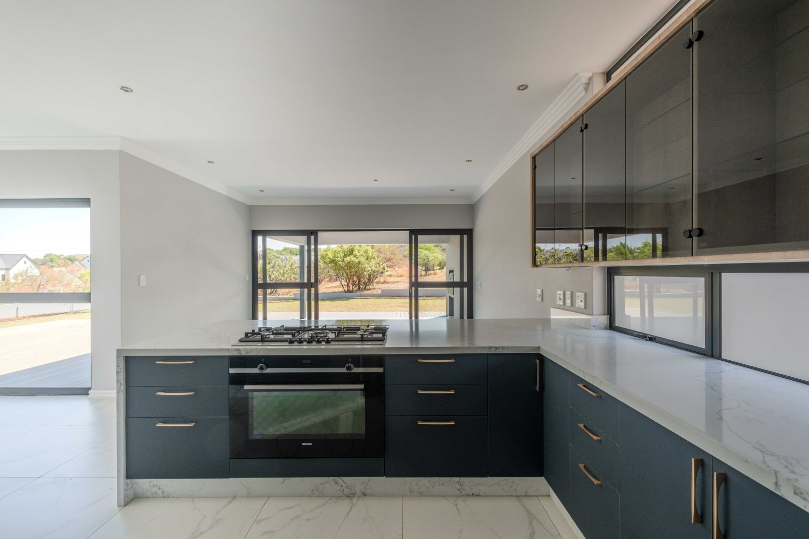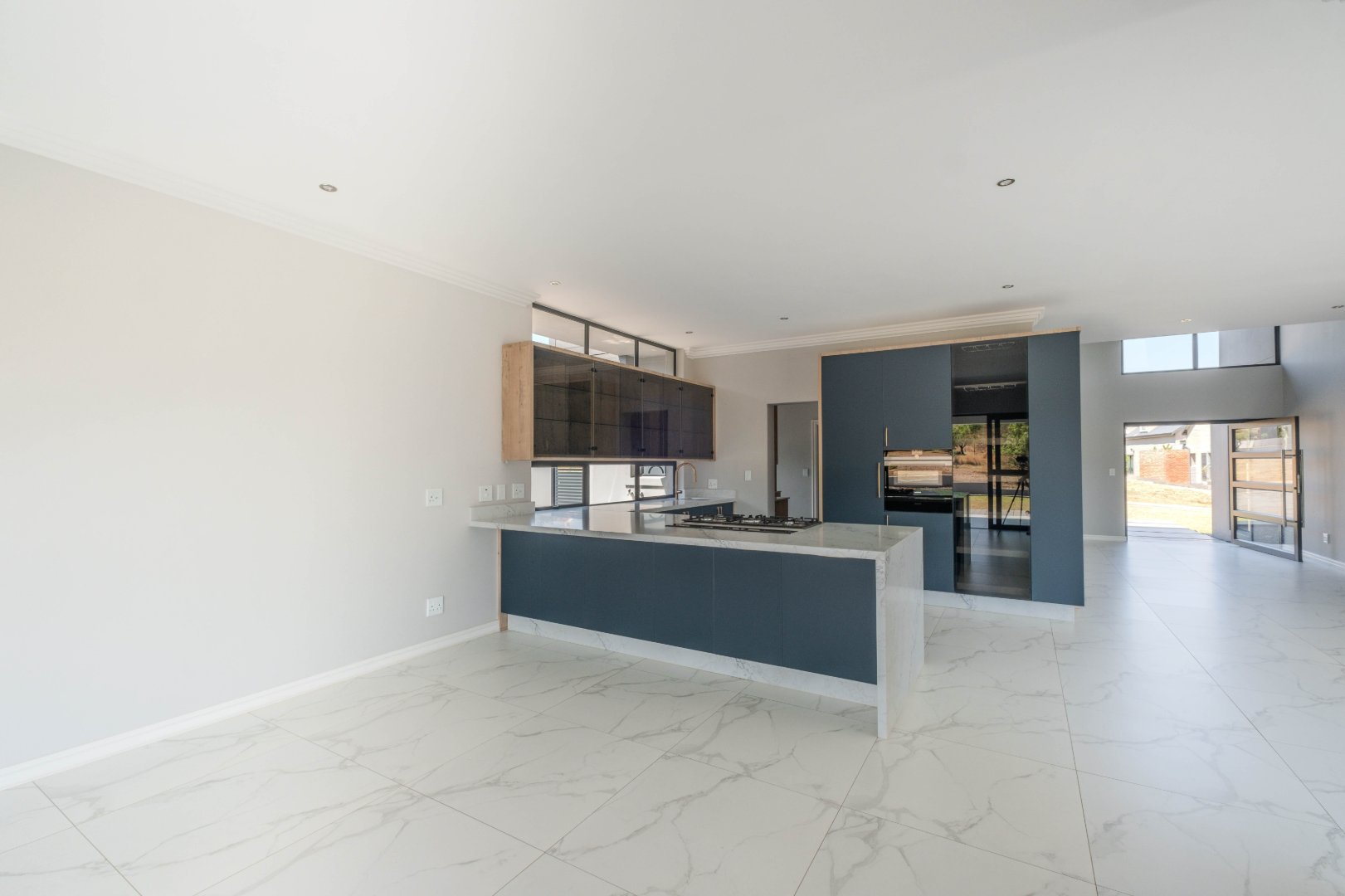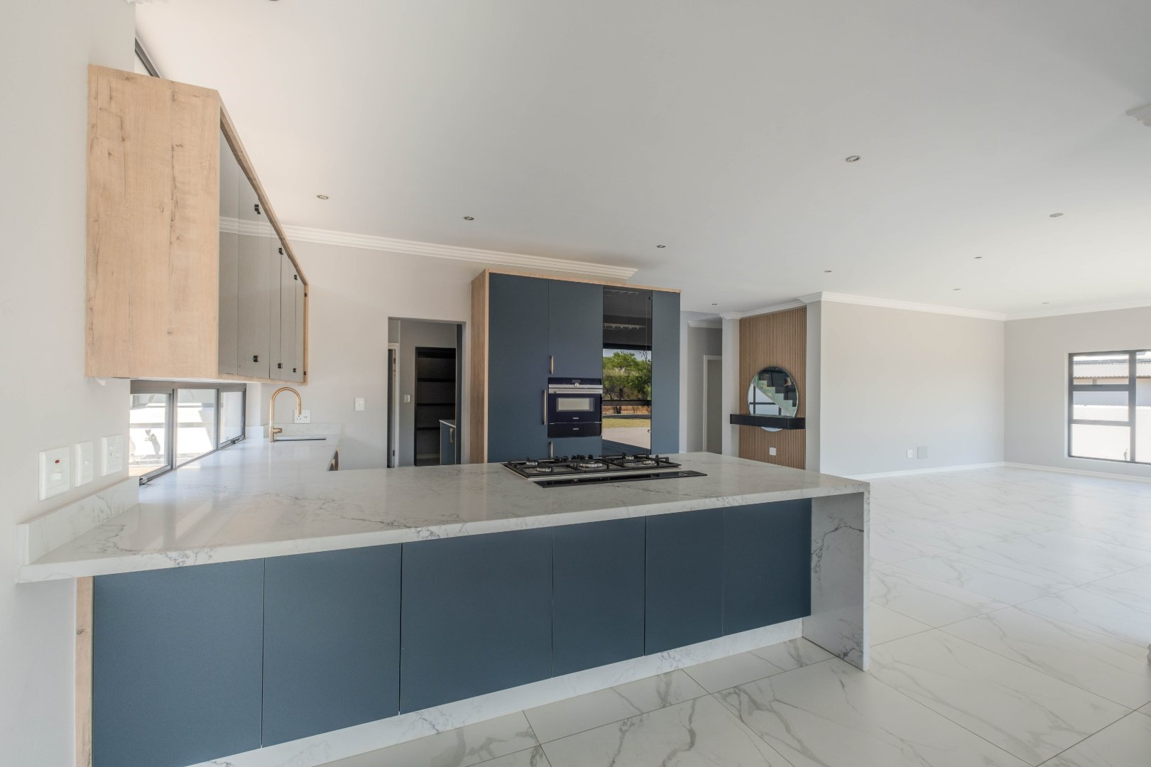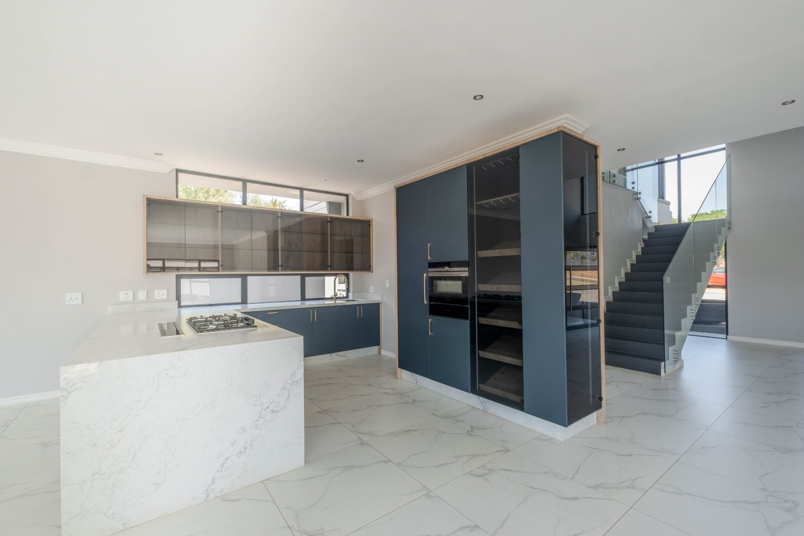 The open-plan kitchen is a chef’s dream, complete with a separate scullery, laundry room, and a cozy enclosed pantry. High-end finishes include a gas stove with a retractable vertical extractor, concealed fridge and freezer, and a built-in microwave, all seamlessly integrated into the sleek design.