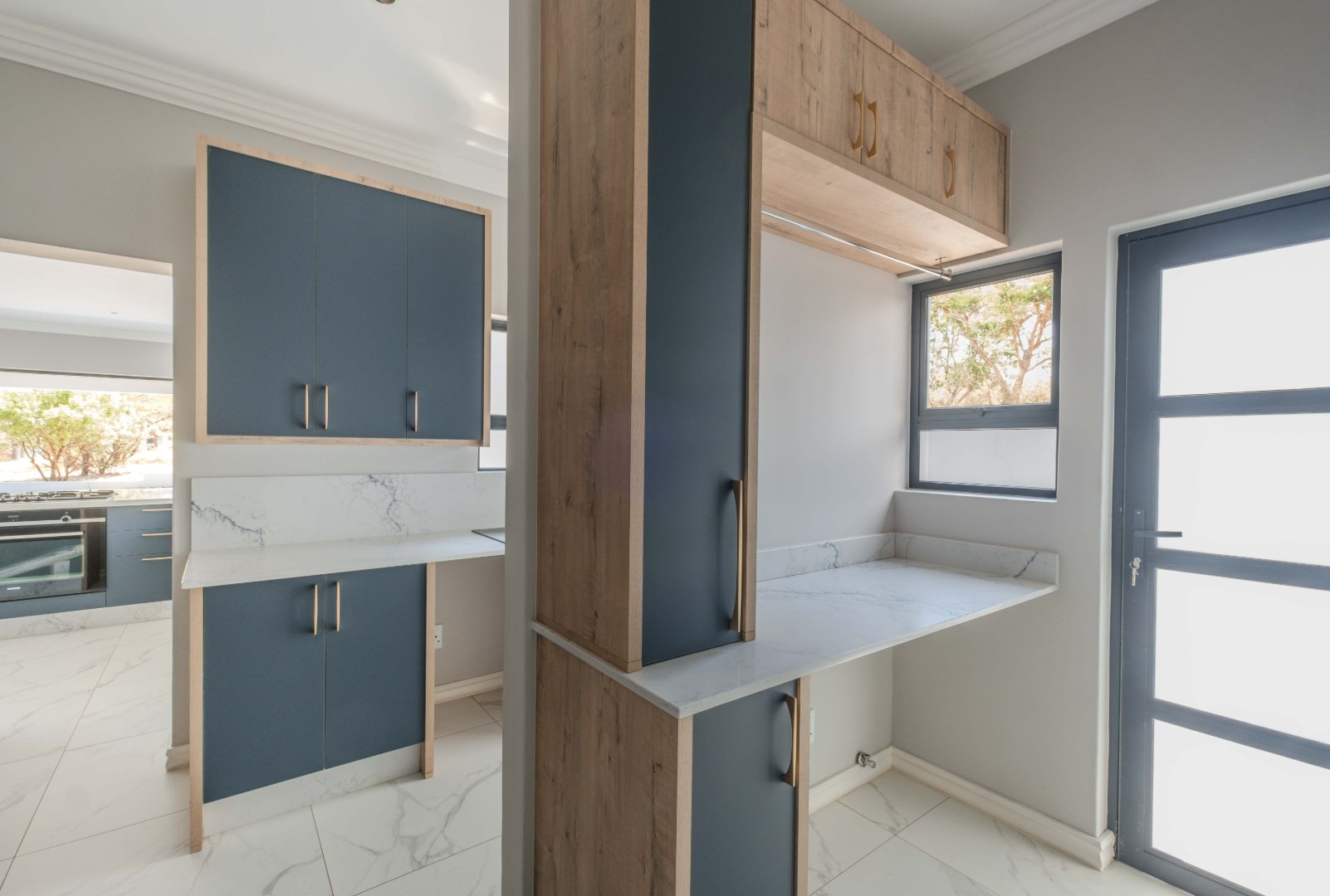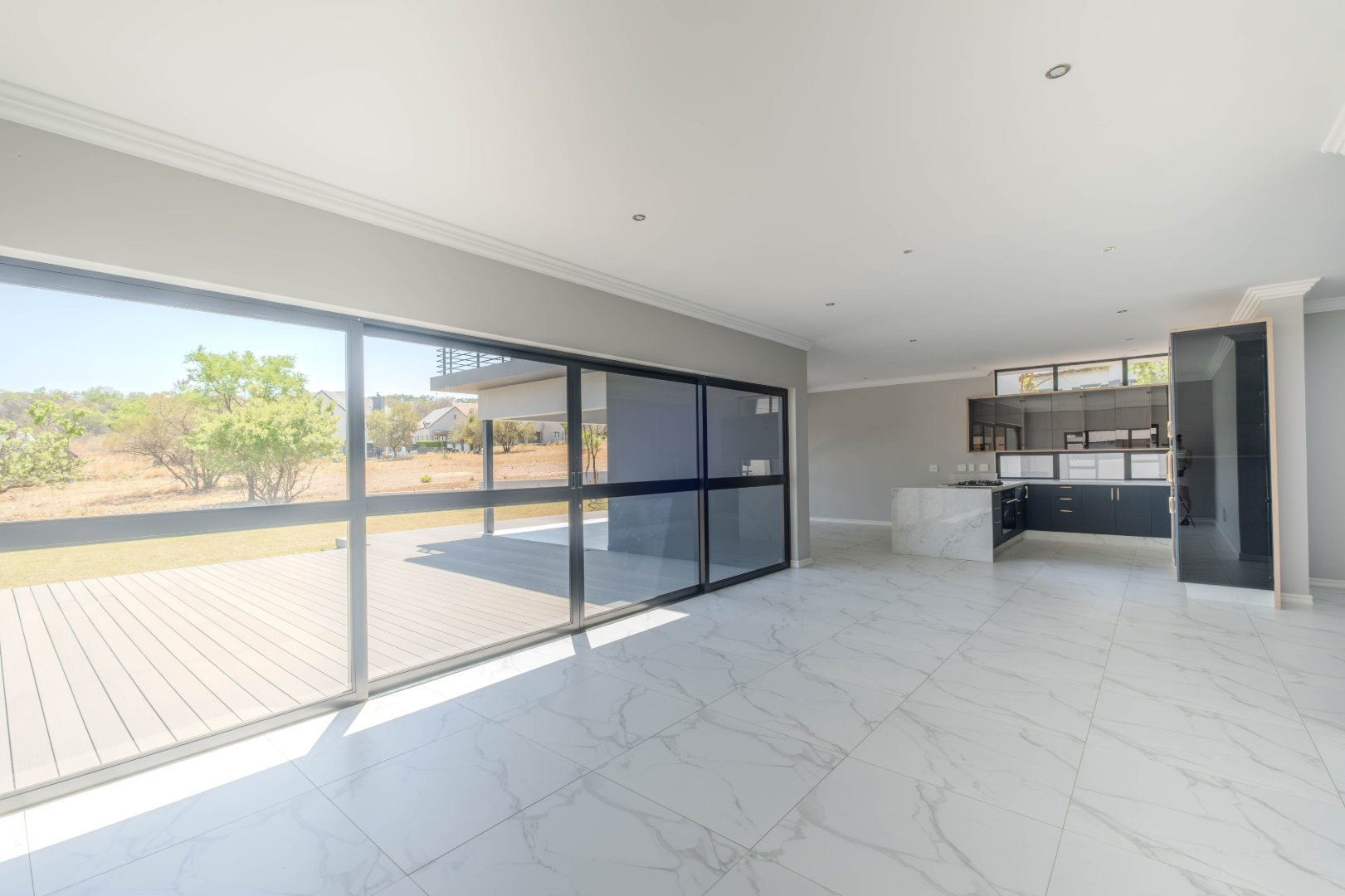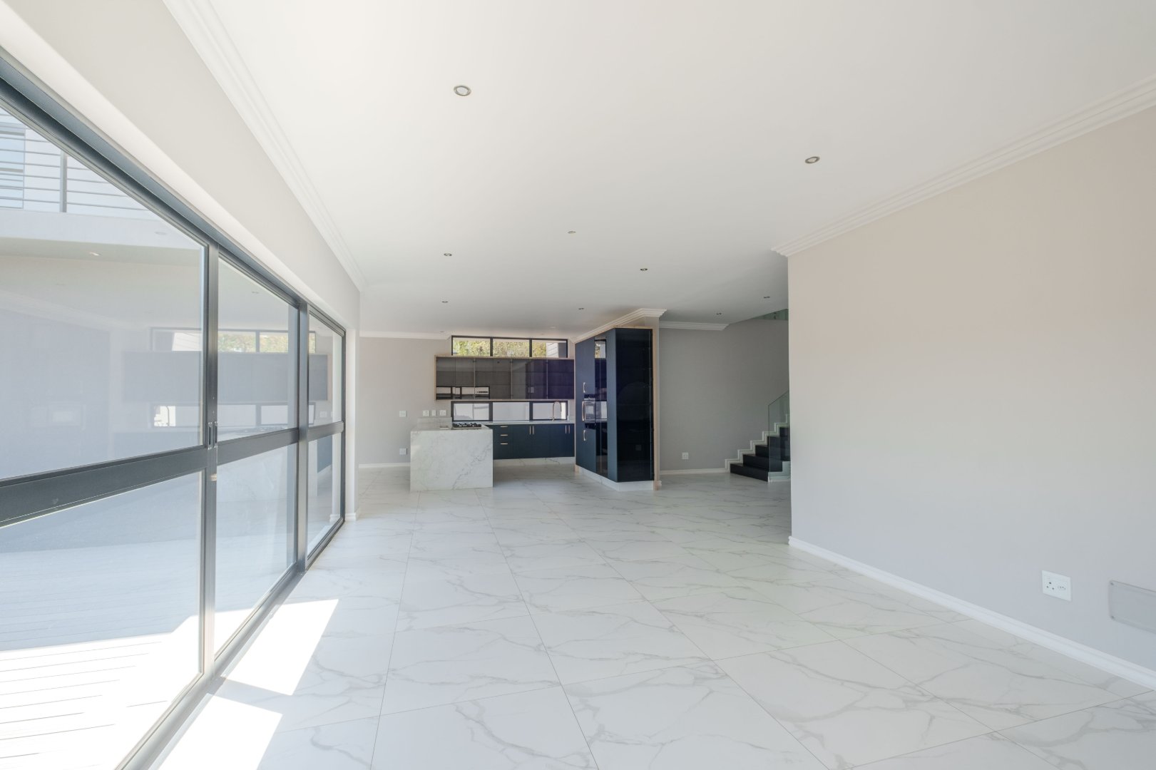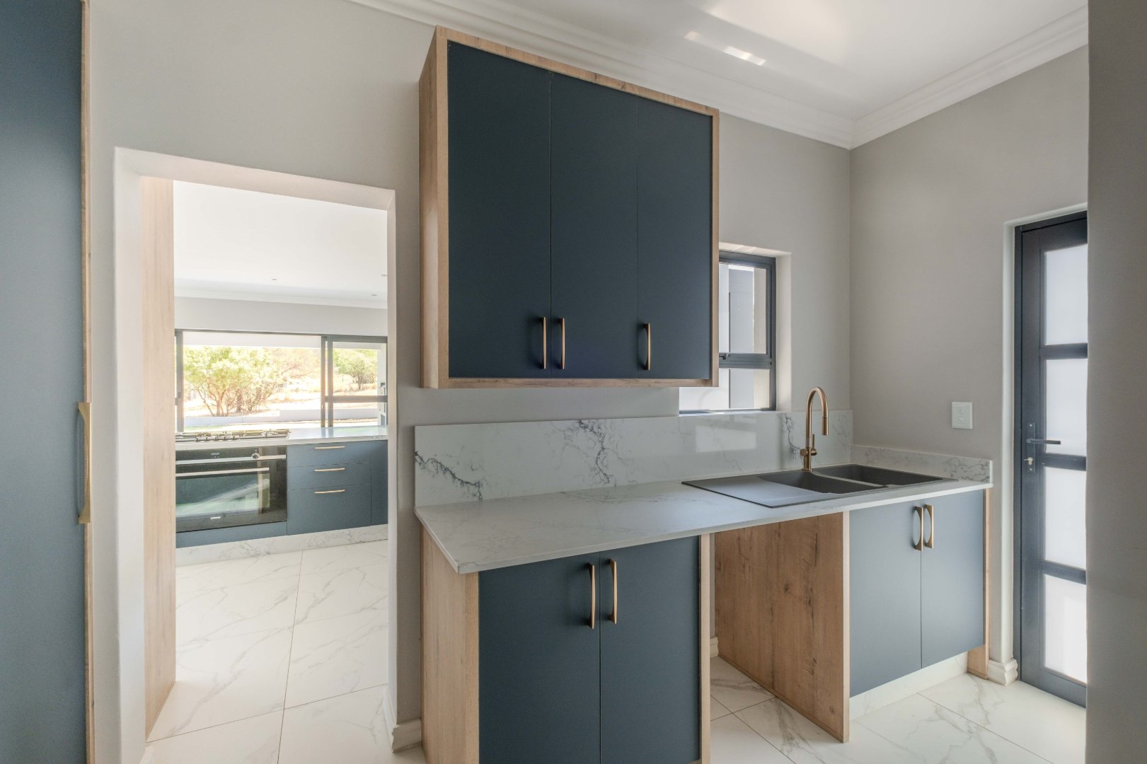 The open-plan kitchen is a chef’s dream, complete with a separate scullery, laundry room, and a cozy enclosed pantry. High-end finishes include a gas stove with a retractable vertical extractor, concealed fridge and freezer, and a built-in microwave, all seamlessly integrated into the sleek design.