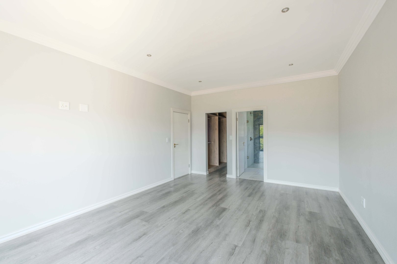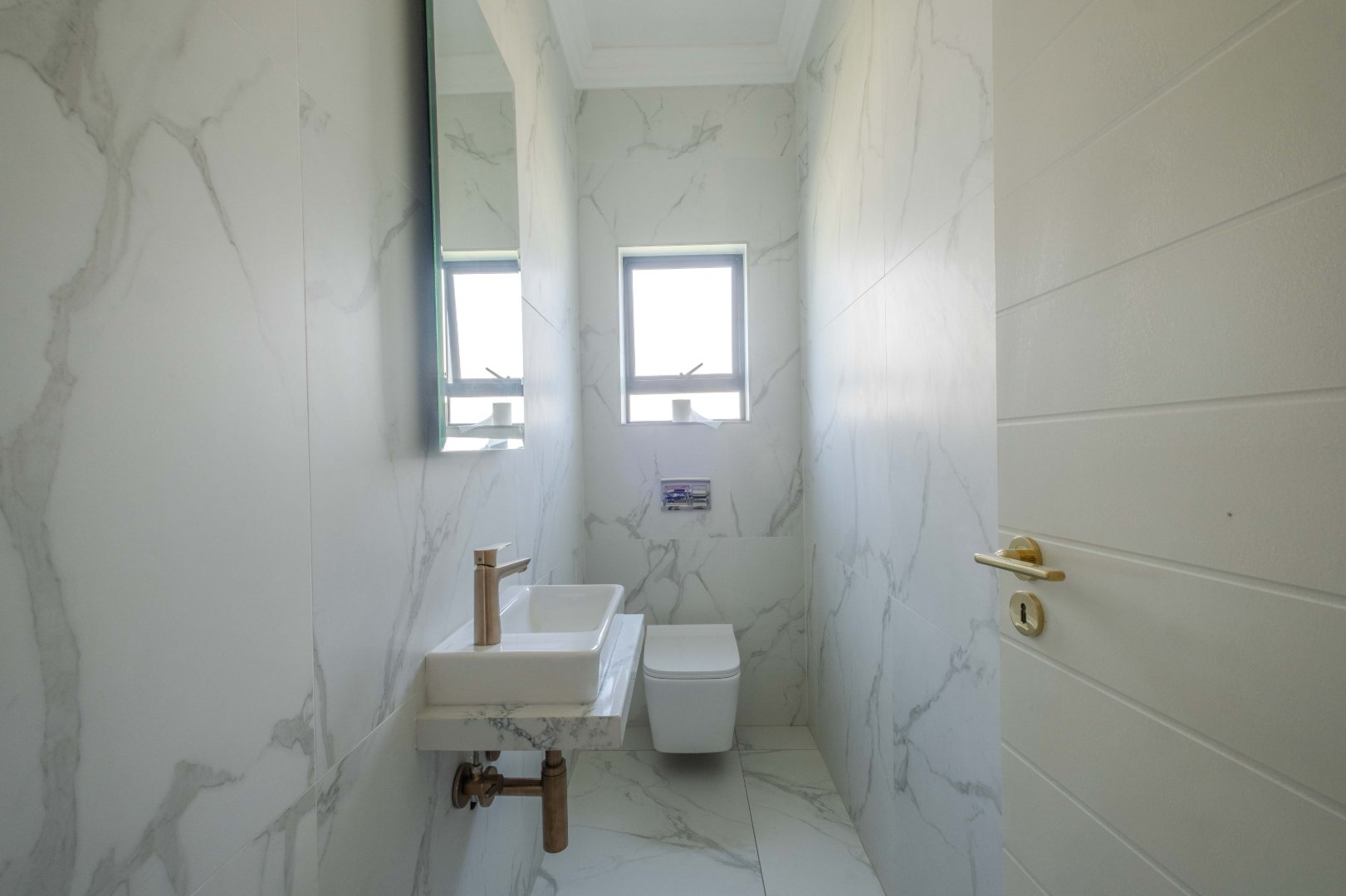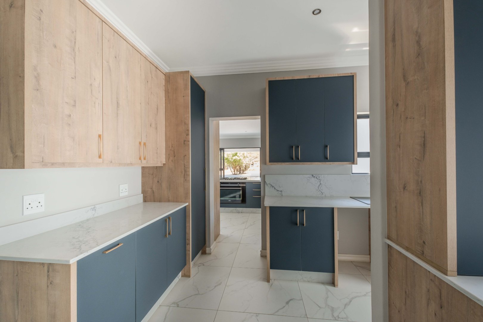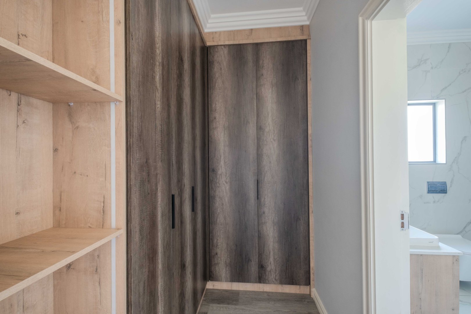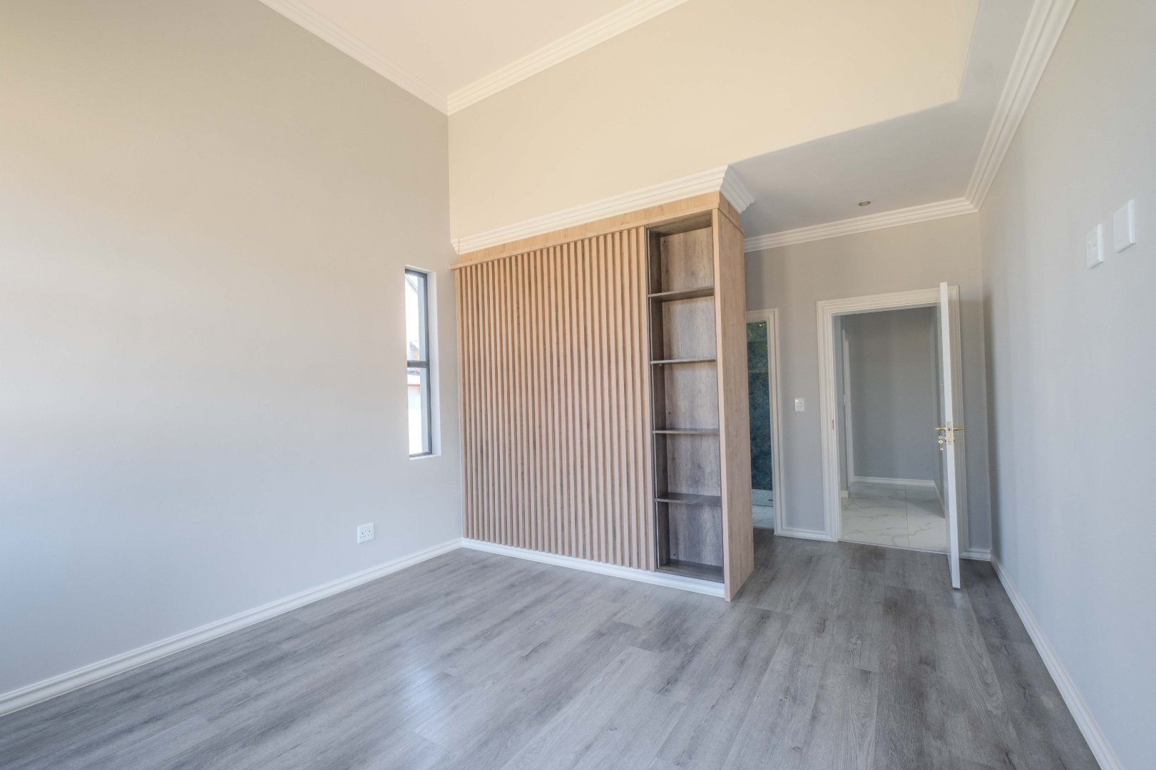 The open-plan kitchen is a chef’s dream, complete with a separate scullery, laundry room, and a cozy enclosed pantry. High-end finishes include a gas stove with a retractable vertical extractor, concealed fridge and freezer, and a built-in microwave, all seamlessly integrated into the sleek design.