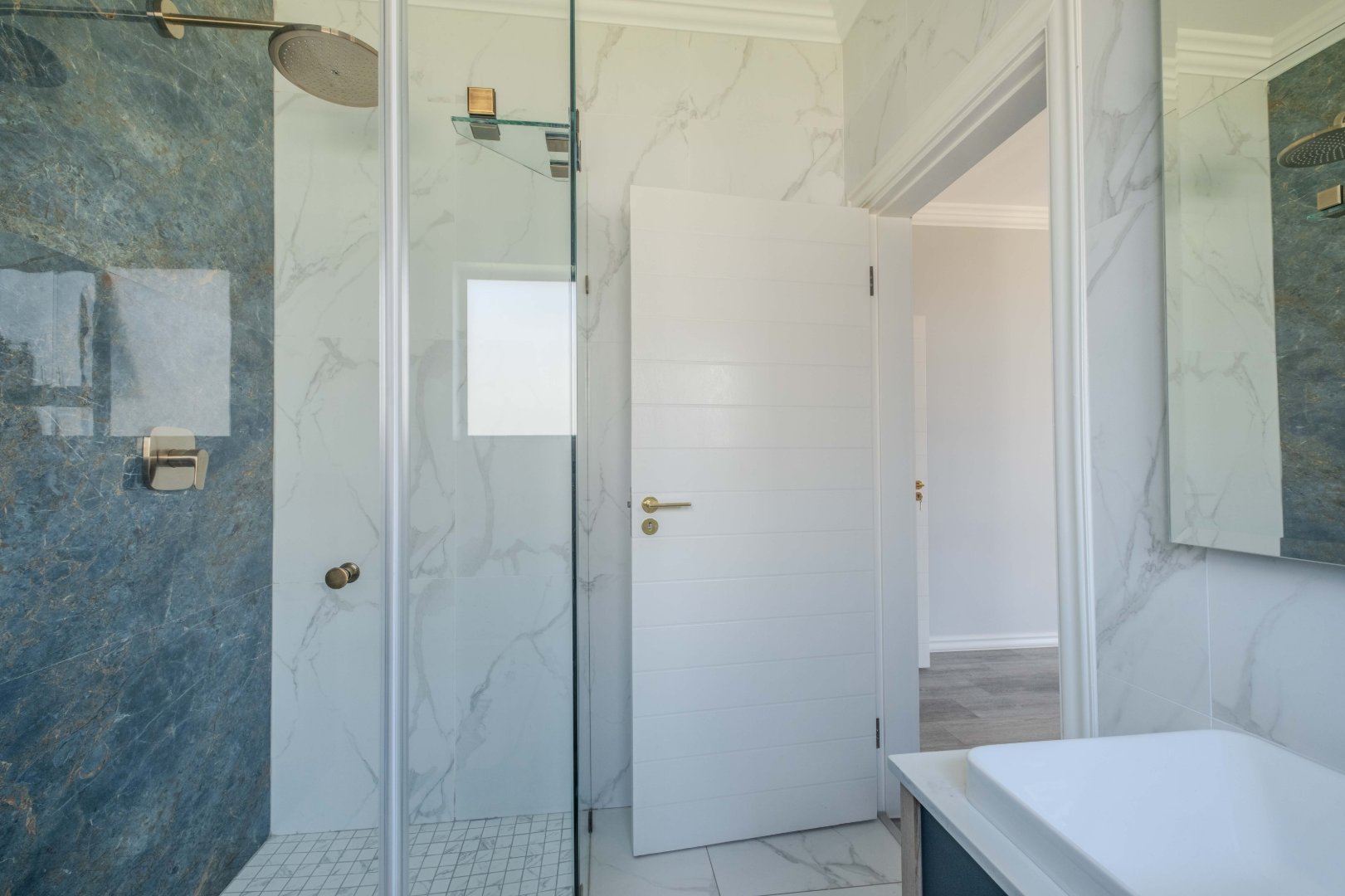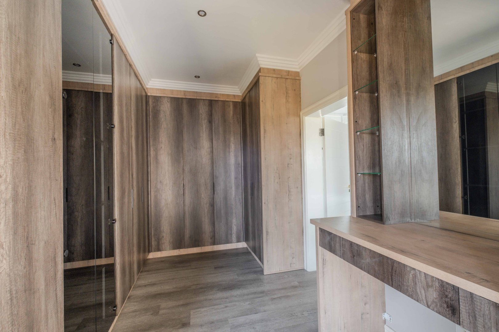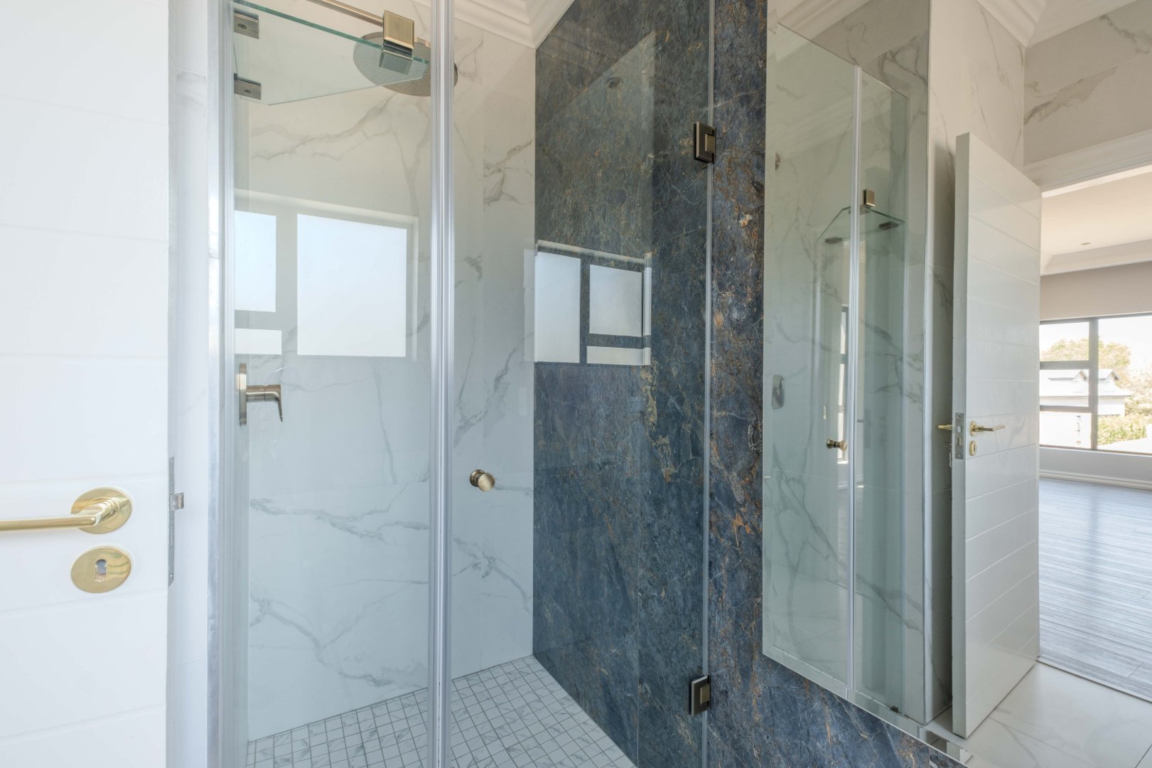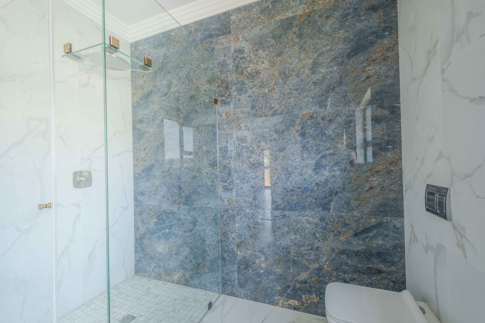 The open-plan kitchen is a chef’s dream, complete with a separate scullery, laundry room, and a cozy enclosed pantry. High-end finishes include a gas stove with a retractable vertical extractor, concealed fridge and freezer, and a built-in microwave, all seamlessly integrated into the sleek design.