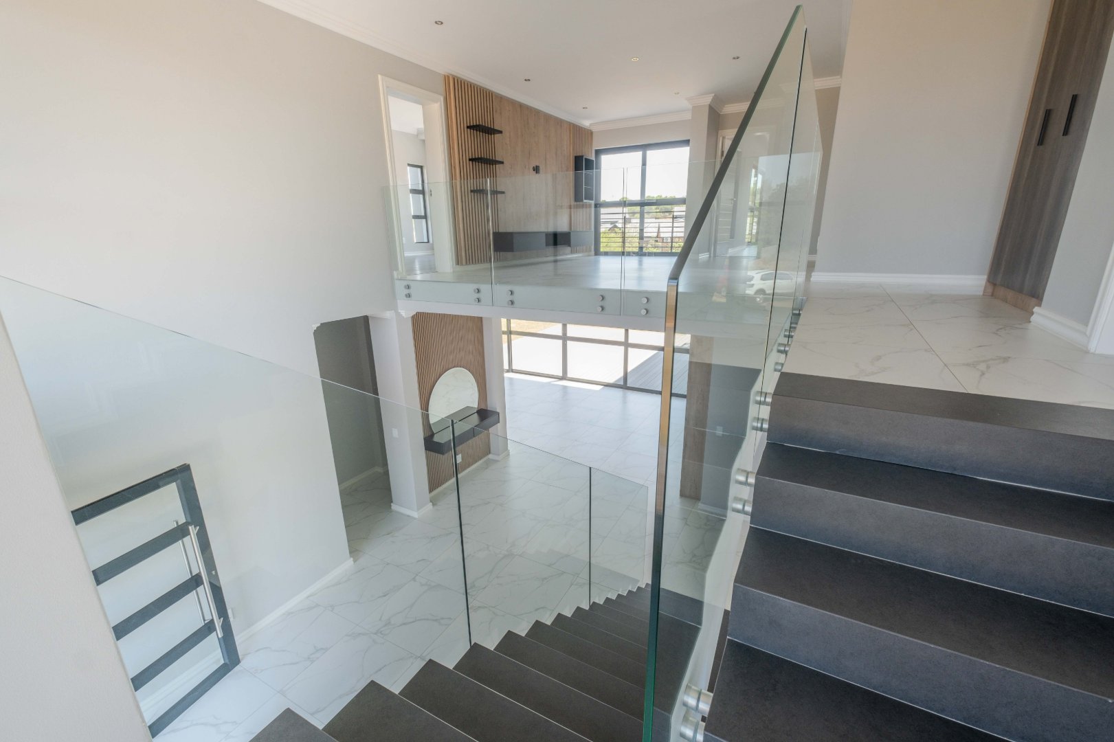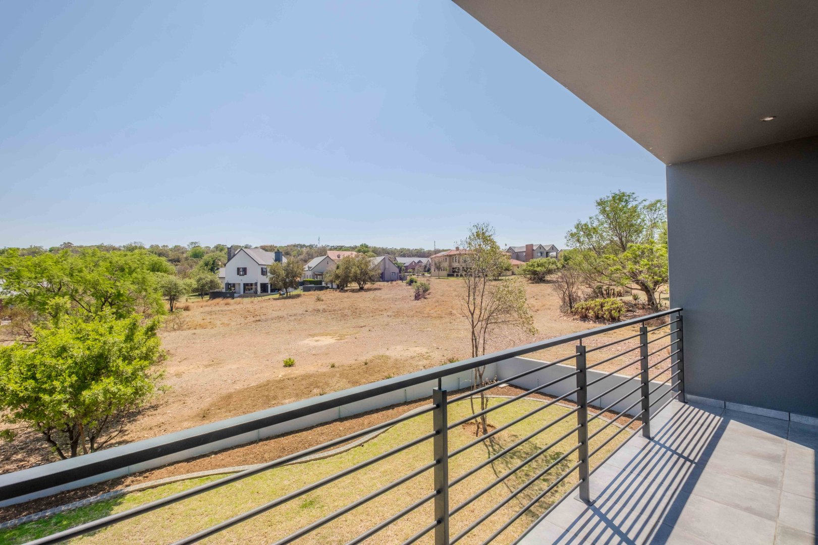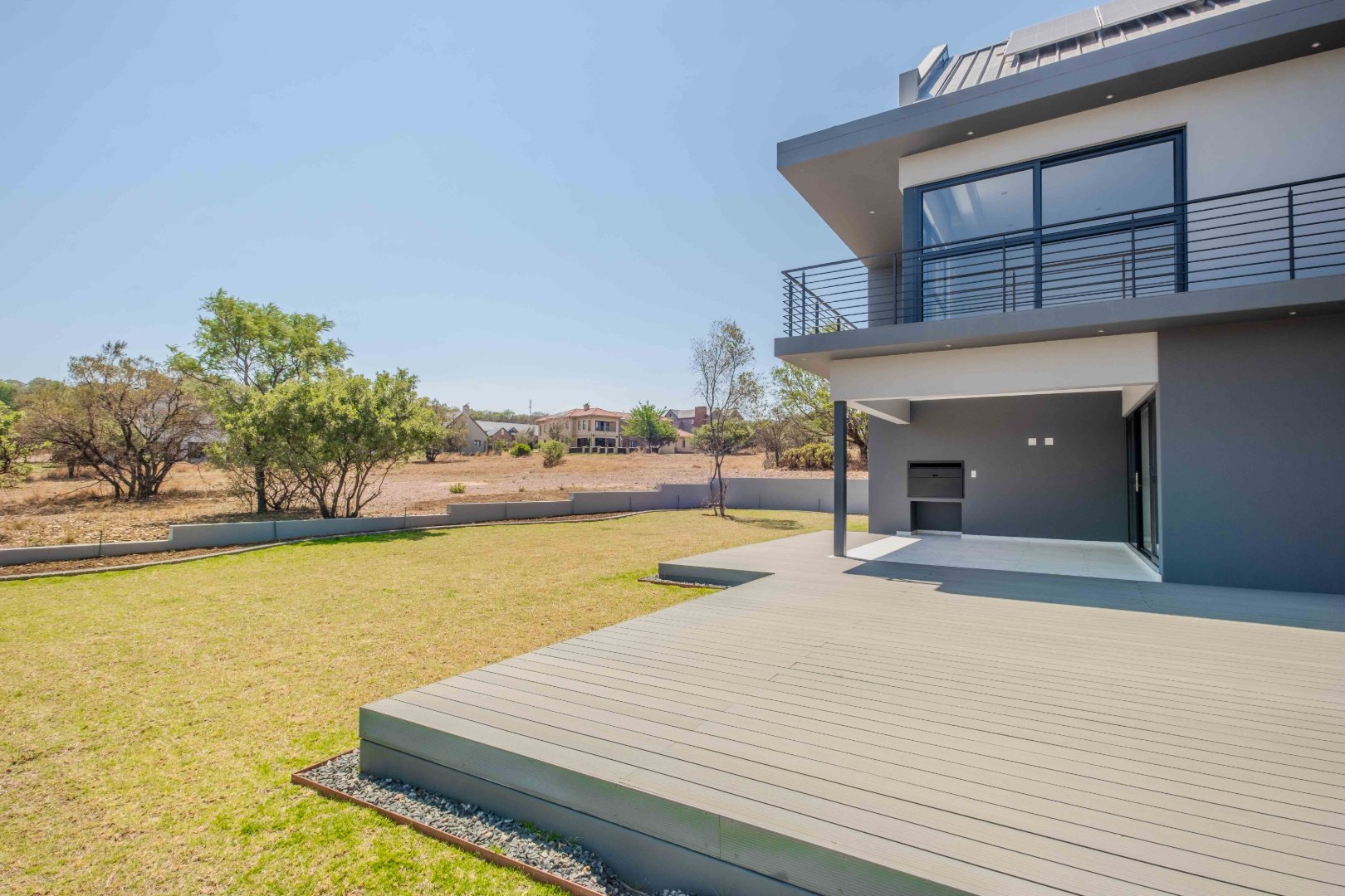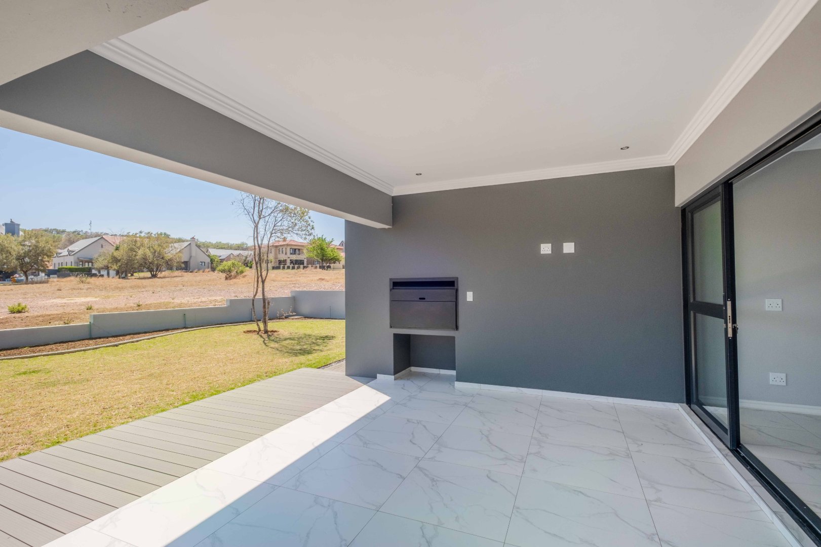 For outdoor living, a covered patio with a built-in braai area provides the perfect space for social gatherings. On the ground floor, there is also a well-appointed guest bedroom with an en-suite bathroom for added privacy and convenience.