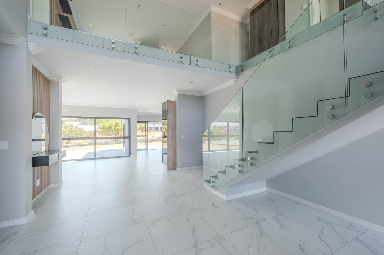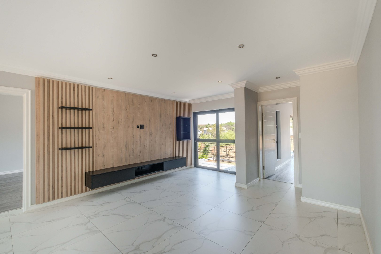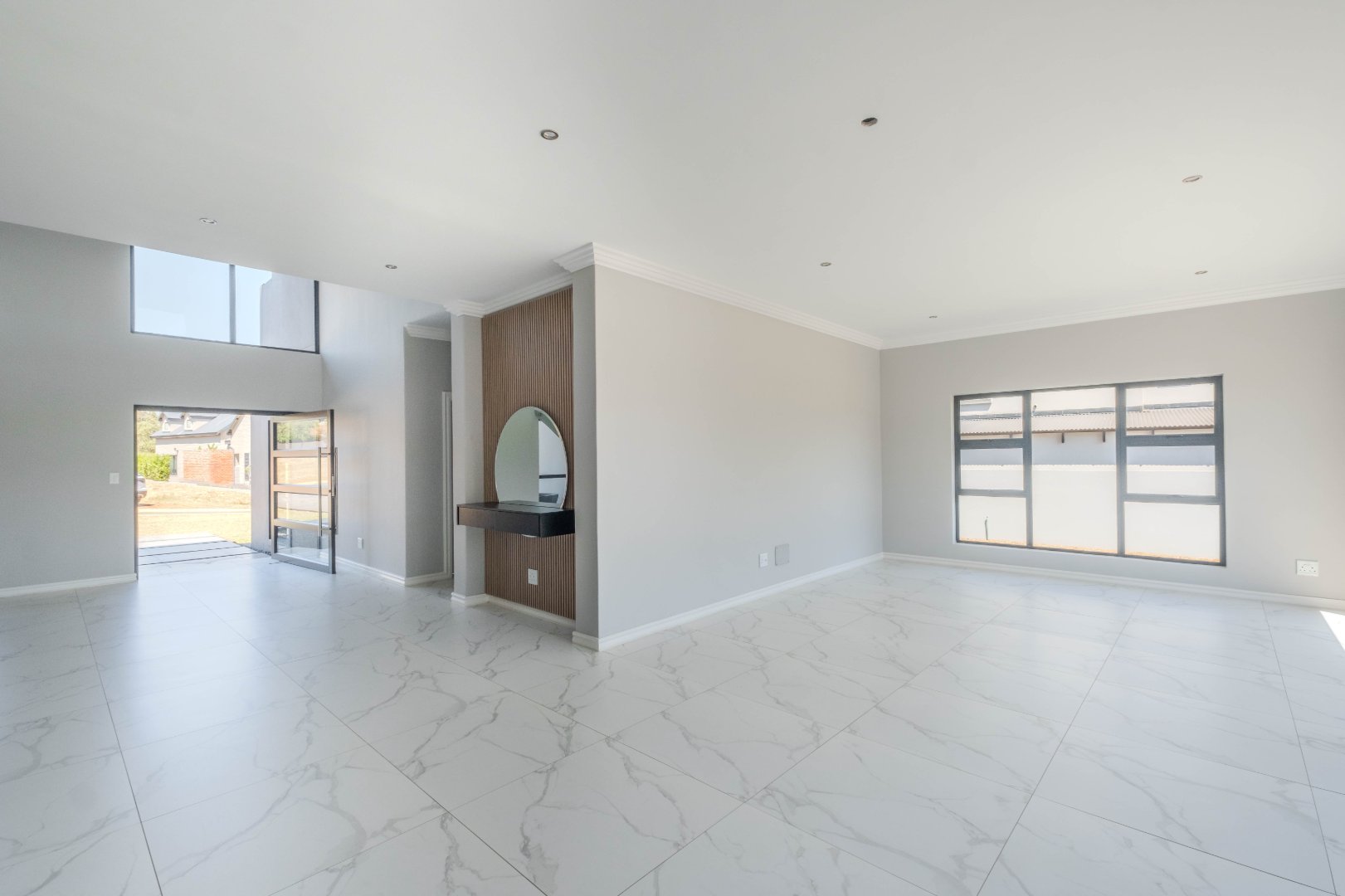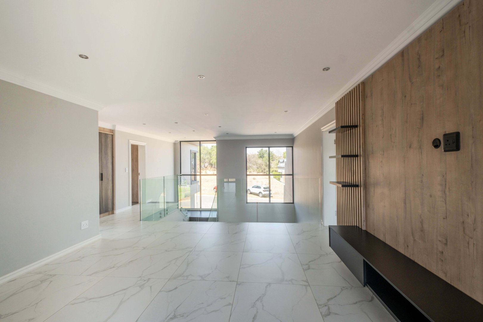 For outdoor living, a covered patio with a built-in braai area provides the perfect space for social gatherings. On the ground floor, there is also a well-appointed guest bedroom with an en-suite bathroom for added privacy and convenience.