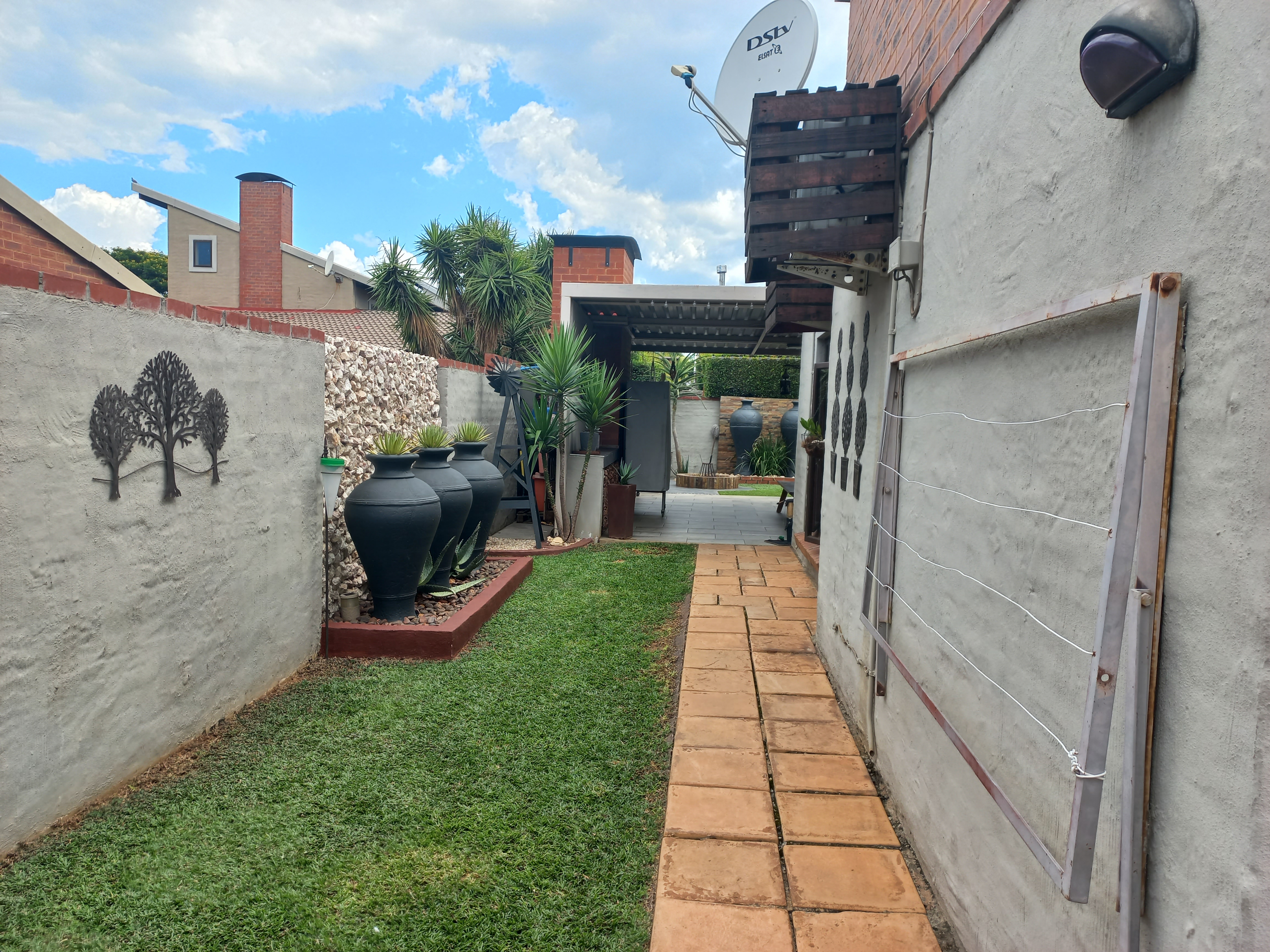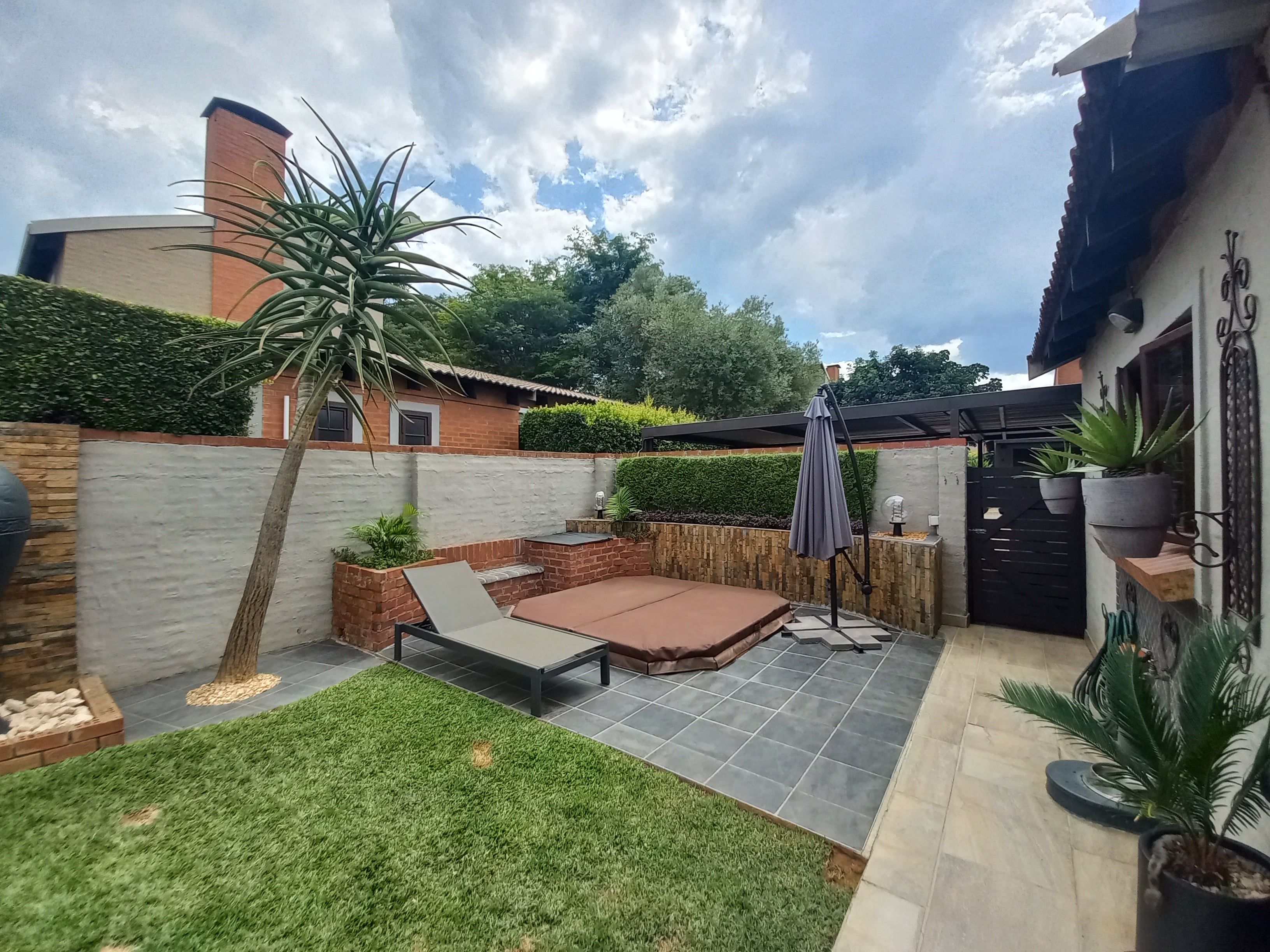 Outdoor living is well catered for with a covered patio and built-in braai, overlooking a neat garden that offers space to relax and entertain. A jacuzzi adds a touch of comfort and leisure, making this home ideal for unwinding at the end of the day.