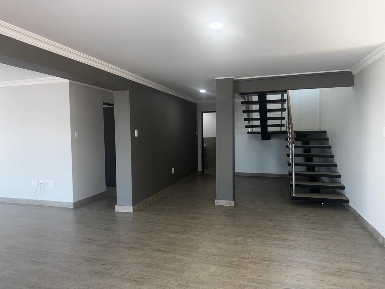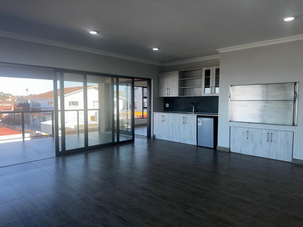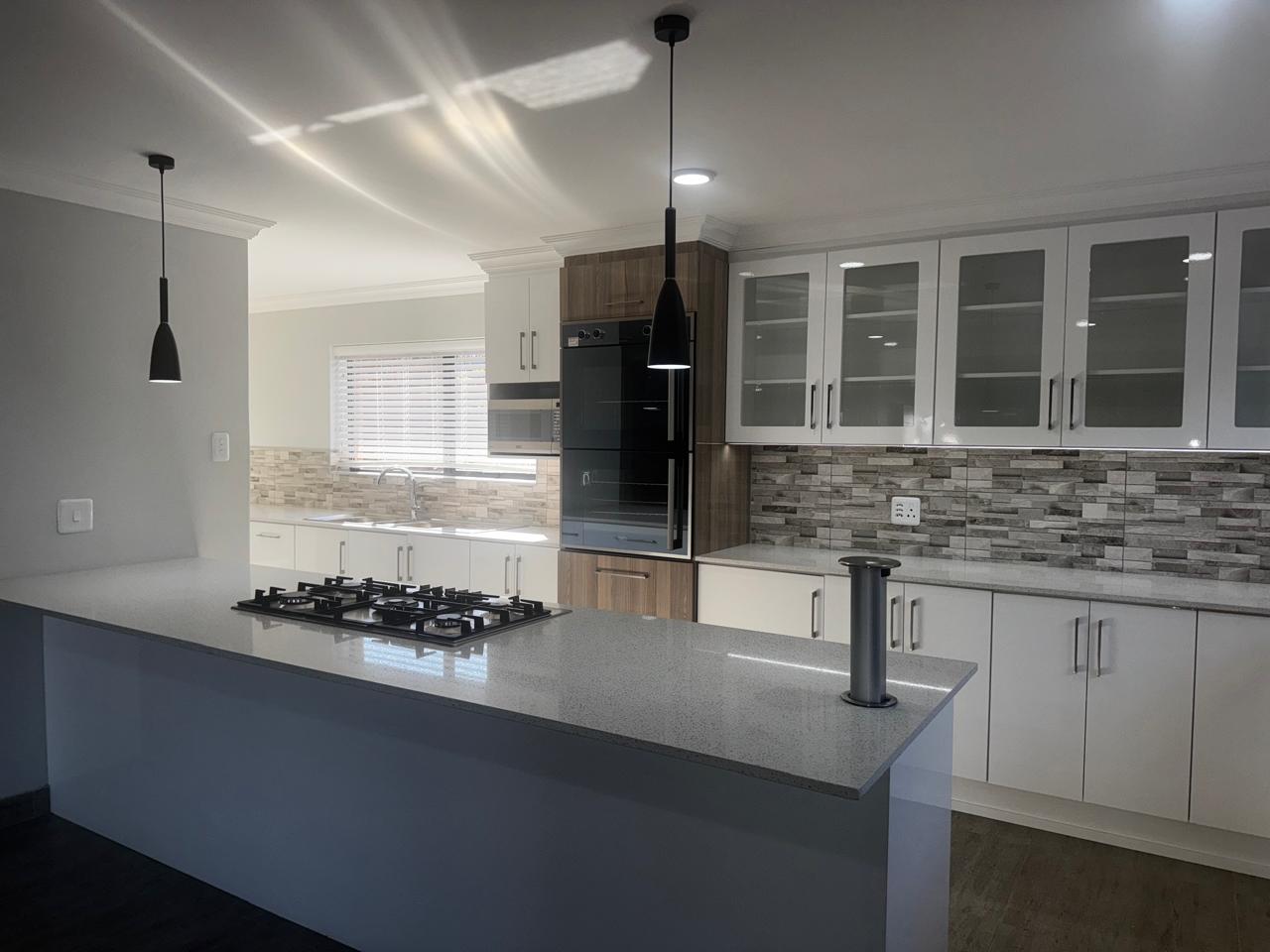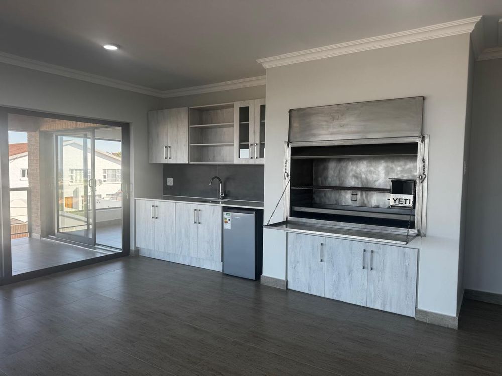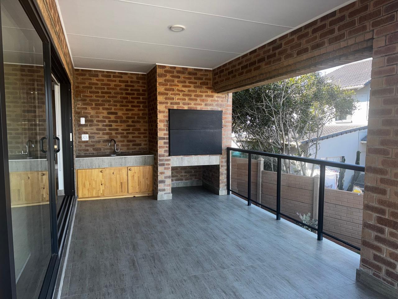 Upstairs: The heart of the home awaits – a spacious lounge with built-in braai and stacker doors that open both sides, creating seamless indoor-outdoor flow. A sleek open-plan kitchen with gas stove, electric oven, prep bowl, and separate scullery connects to a covered patio. Three bedrooms and two bathrooms complete the level, including a luxurious en-suite.