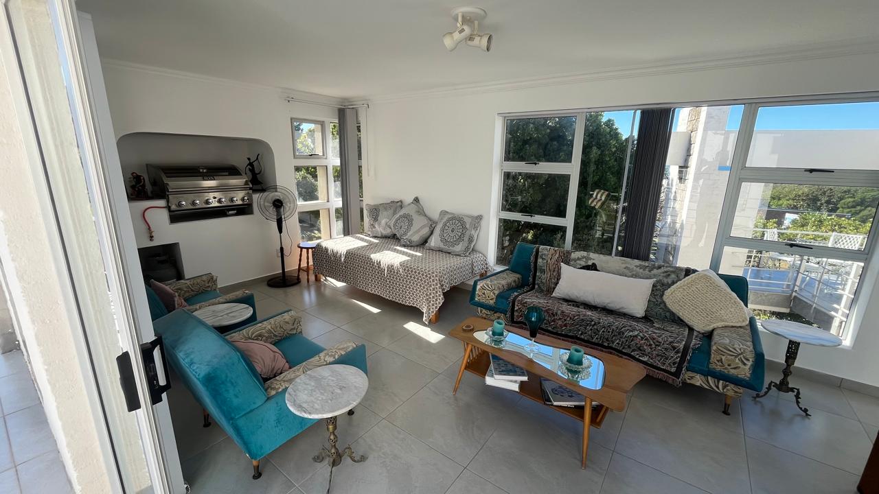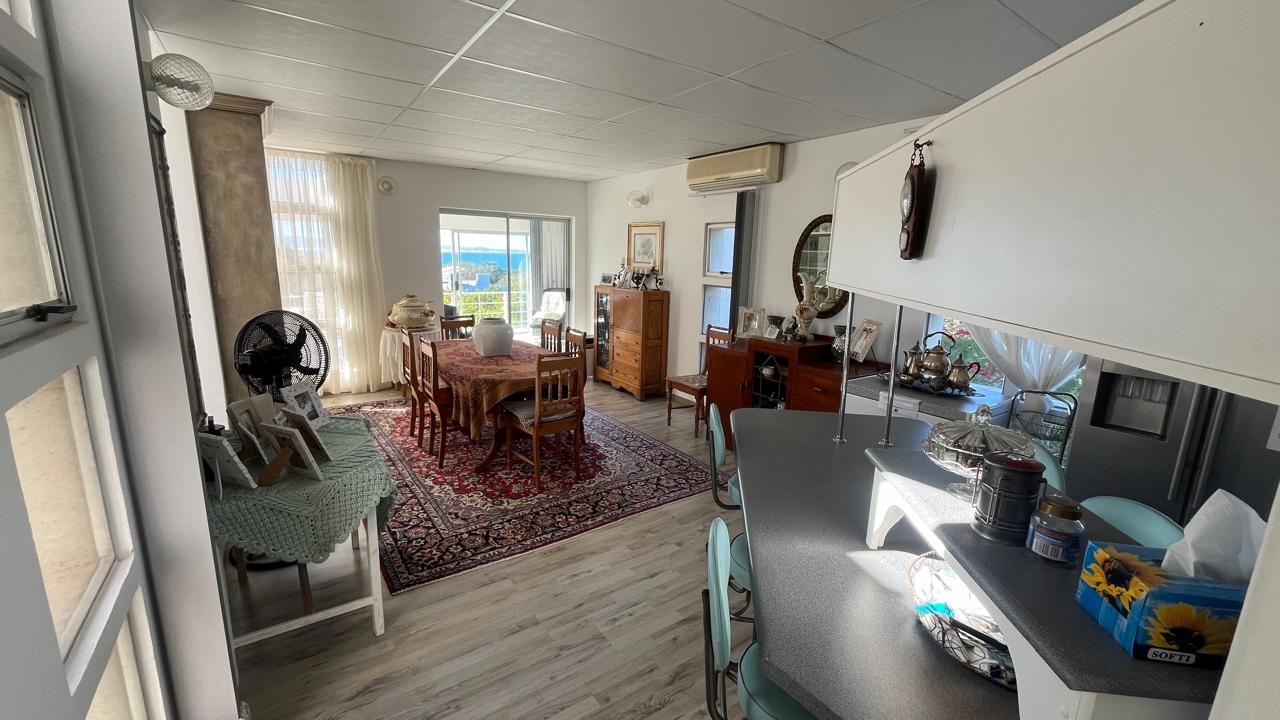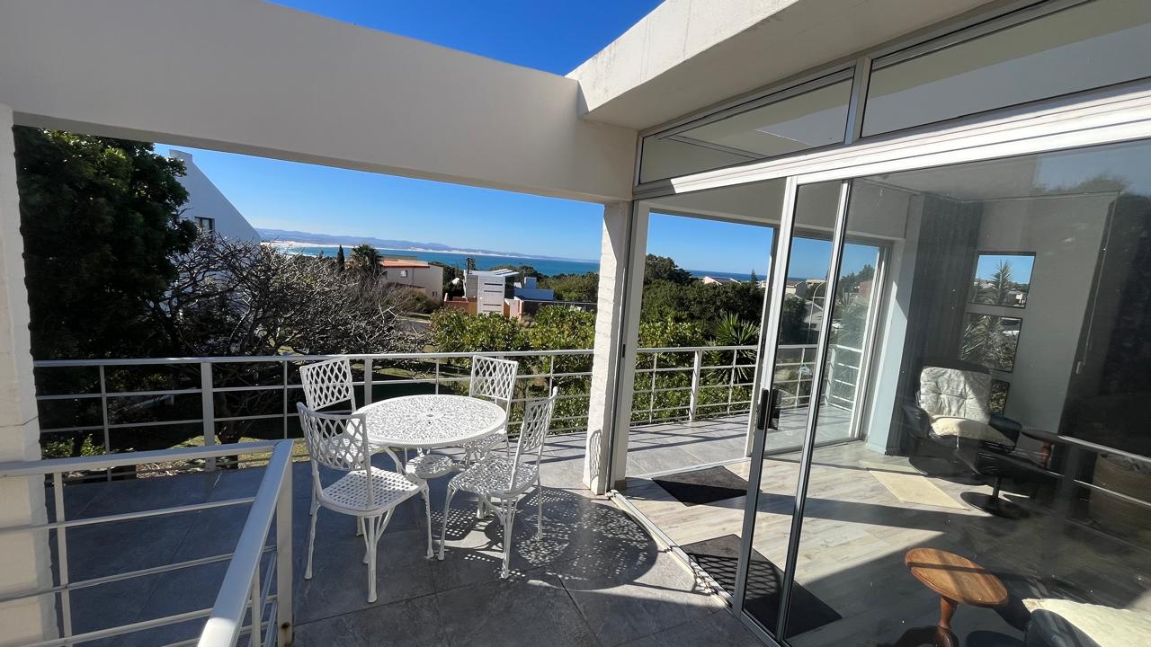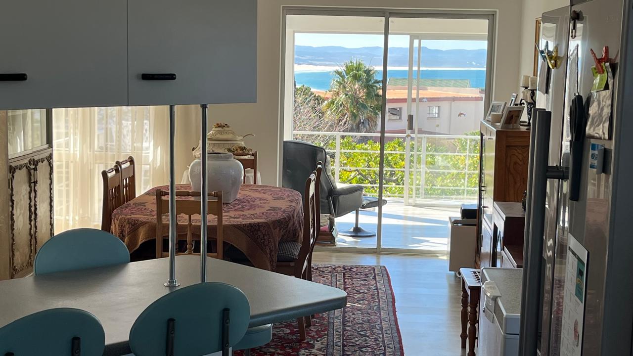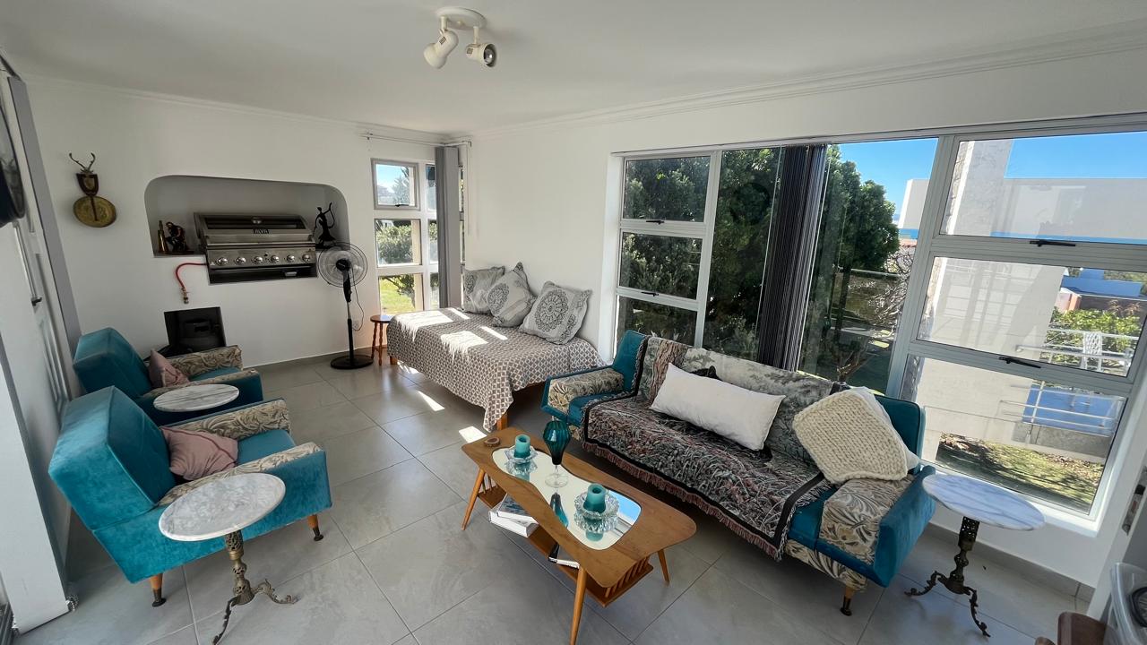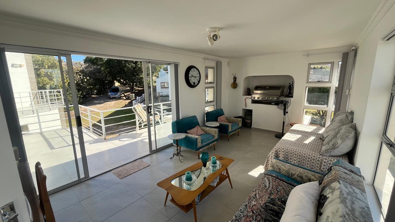 The dining room is fitted with air conditioning and laminate flooring, offering a comfortable space for meals and family gatherings. The adjacent braai room includes a built-in gas braai and opens through a sliding door to a balcony, perfect for entertaining. A second lounge on this level also features laminate flooring, a ceiling fan and light, and access to the balcony, which boasts scenic sea views.