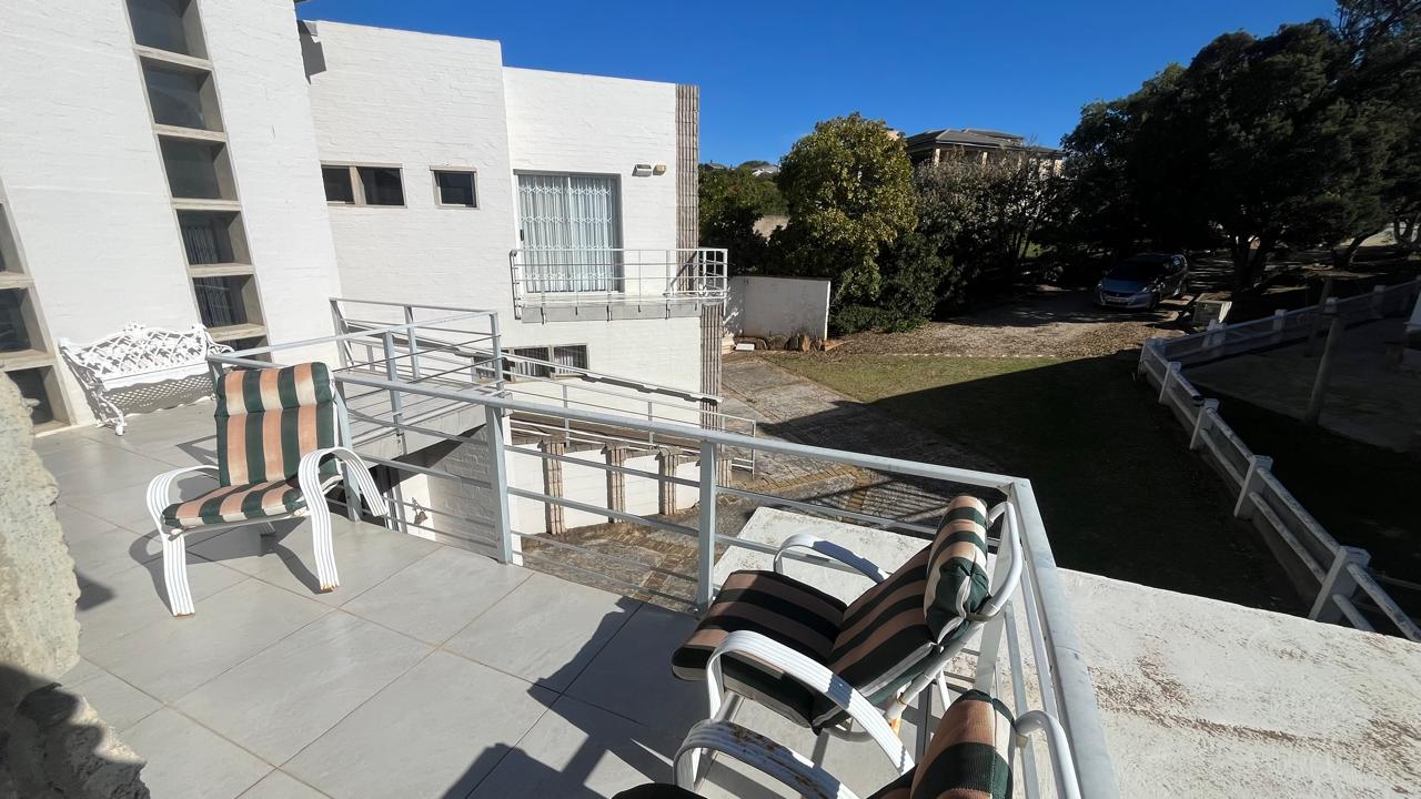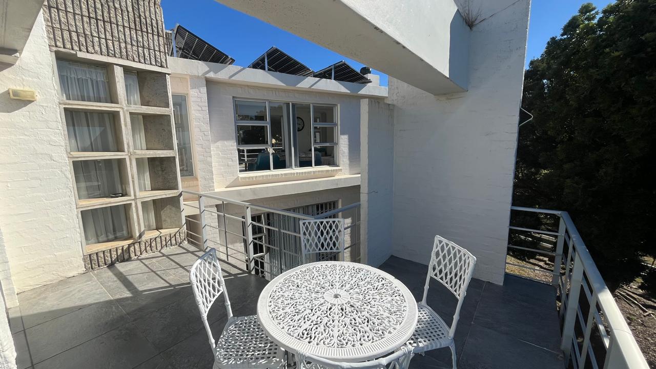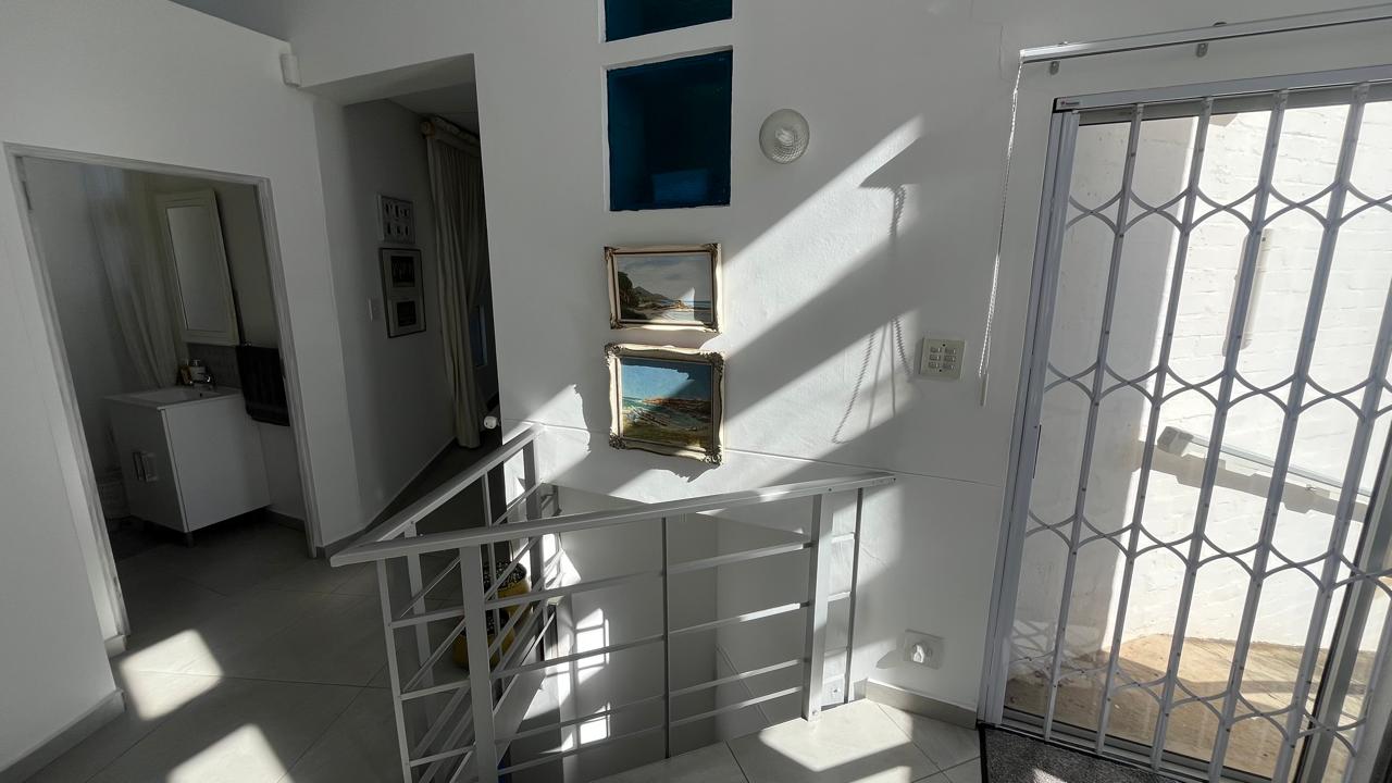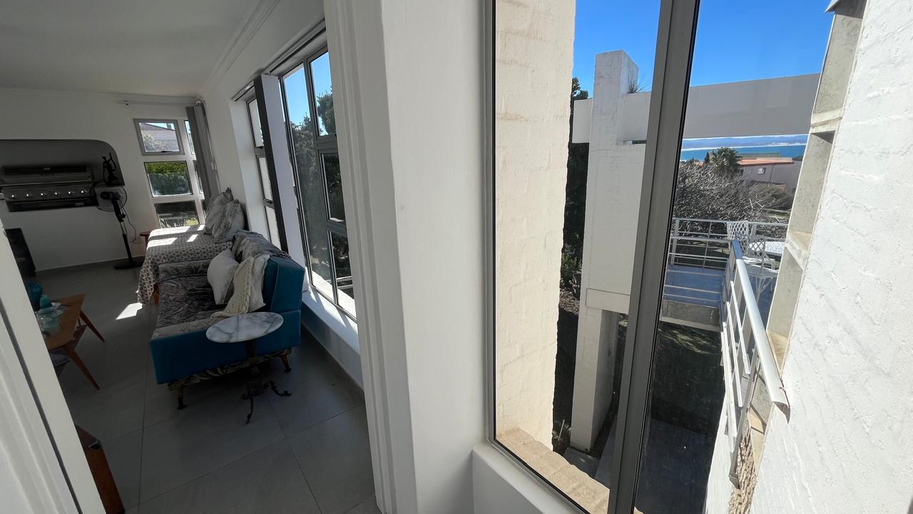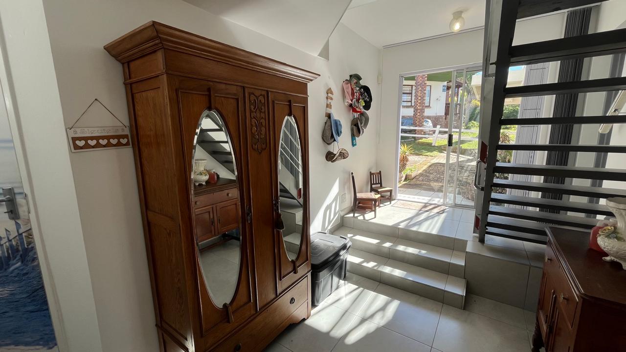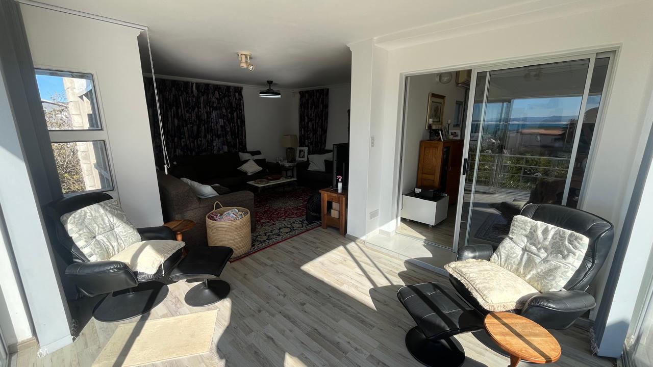 The dining room is fitted with air conditioning and laminate flooring, offering a comfortable space for meals and family gatherings. The adjacent braai room includes a built-in gas braai and opens through a sliding door to a balcony, perfect for entertaining. A second lounge on this level also features laminate flooring, a ceiling fan and light, and access to the balcony, which boasts scenic sea views.