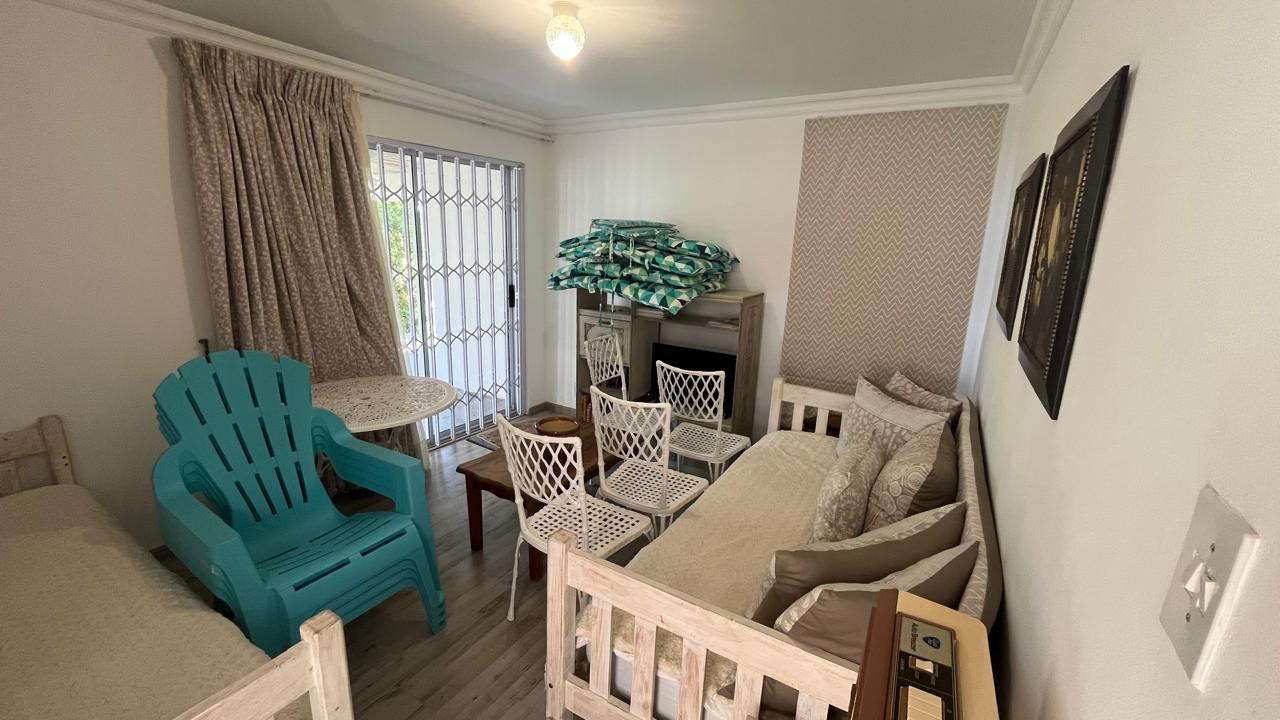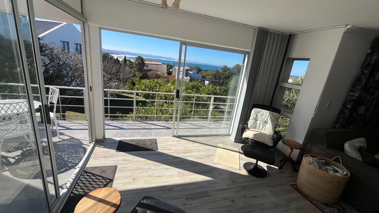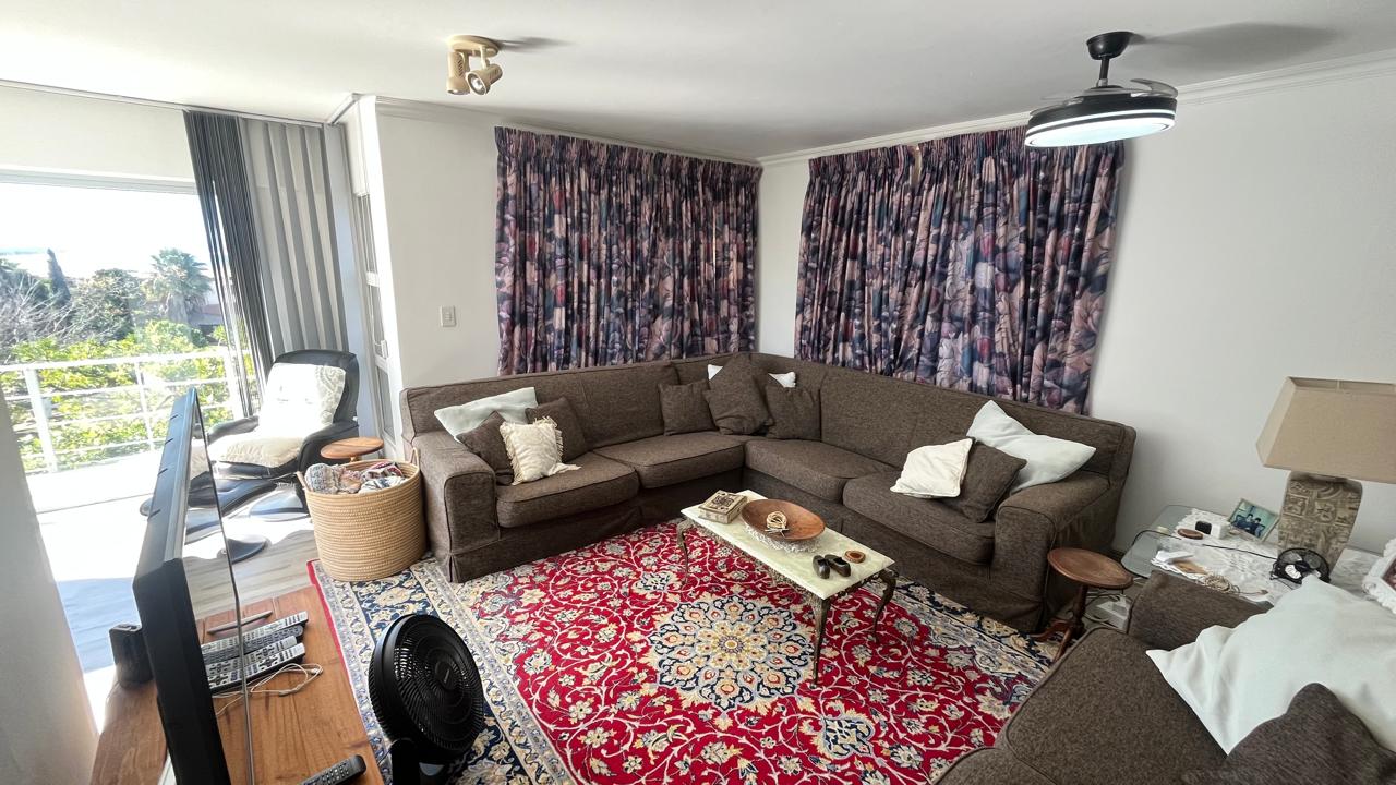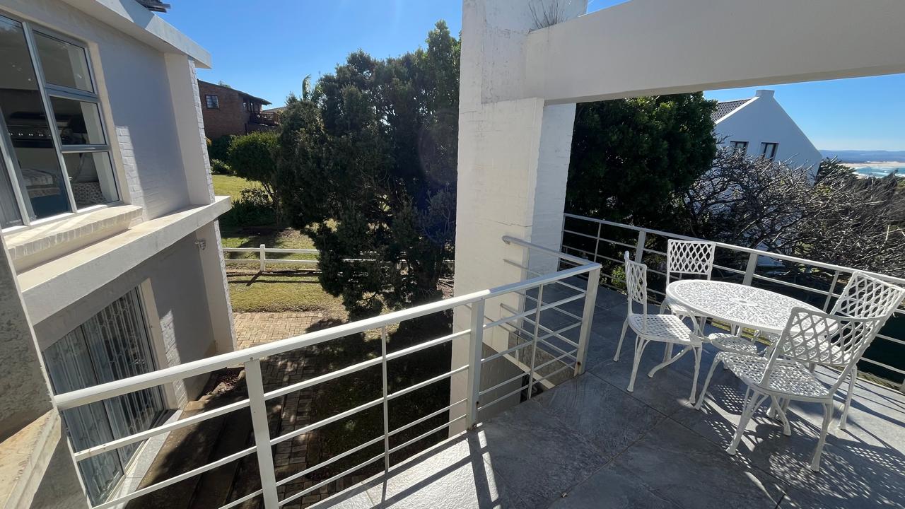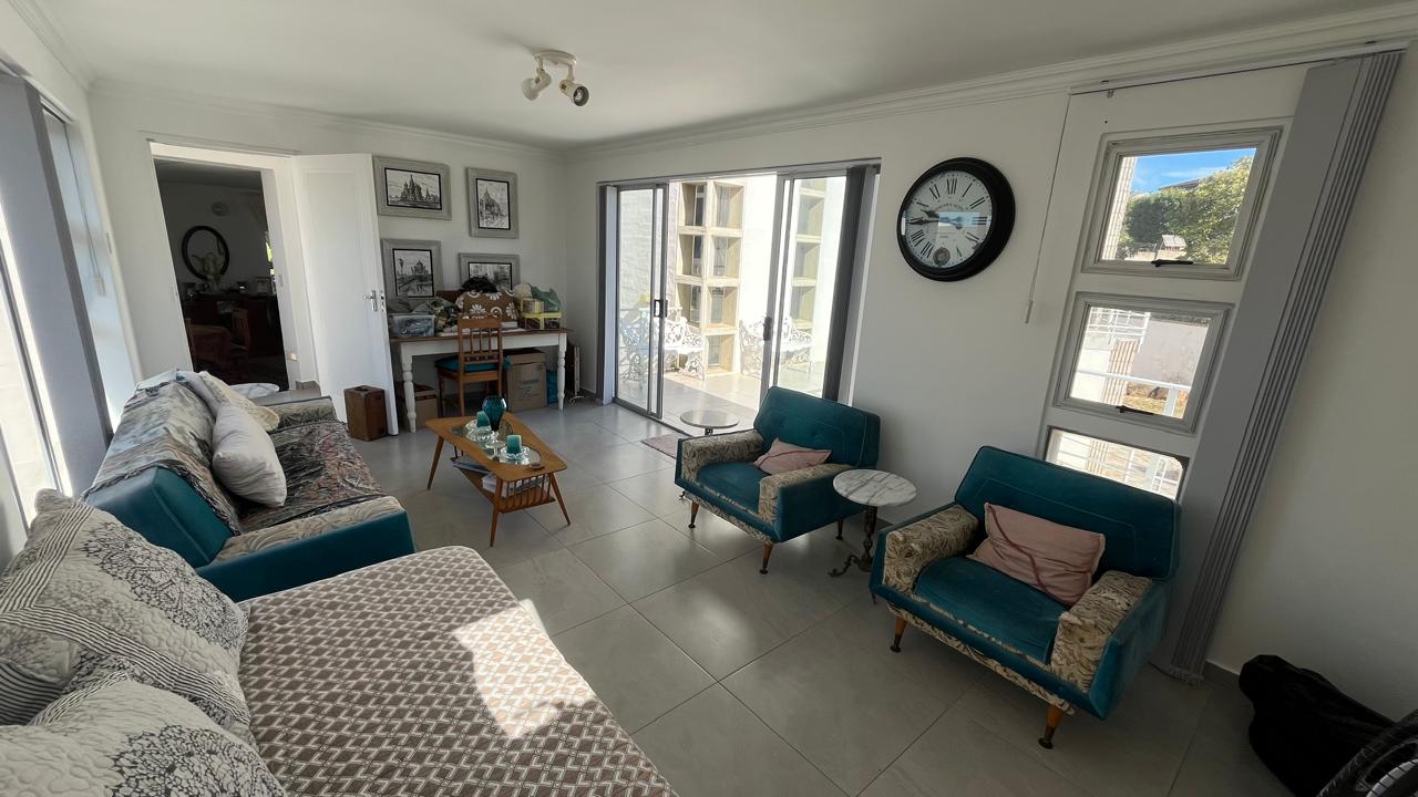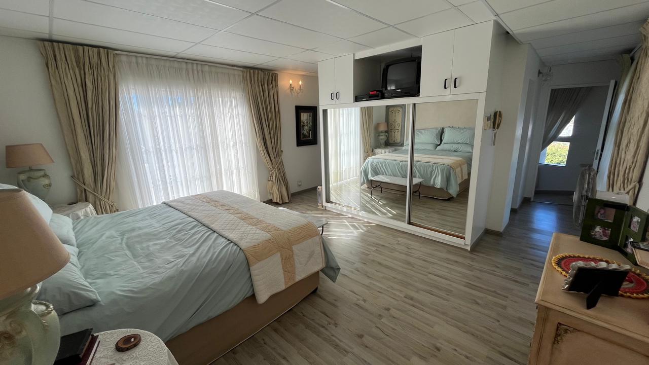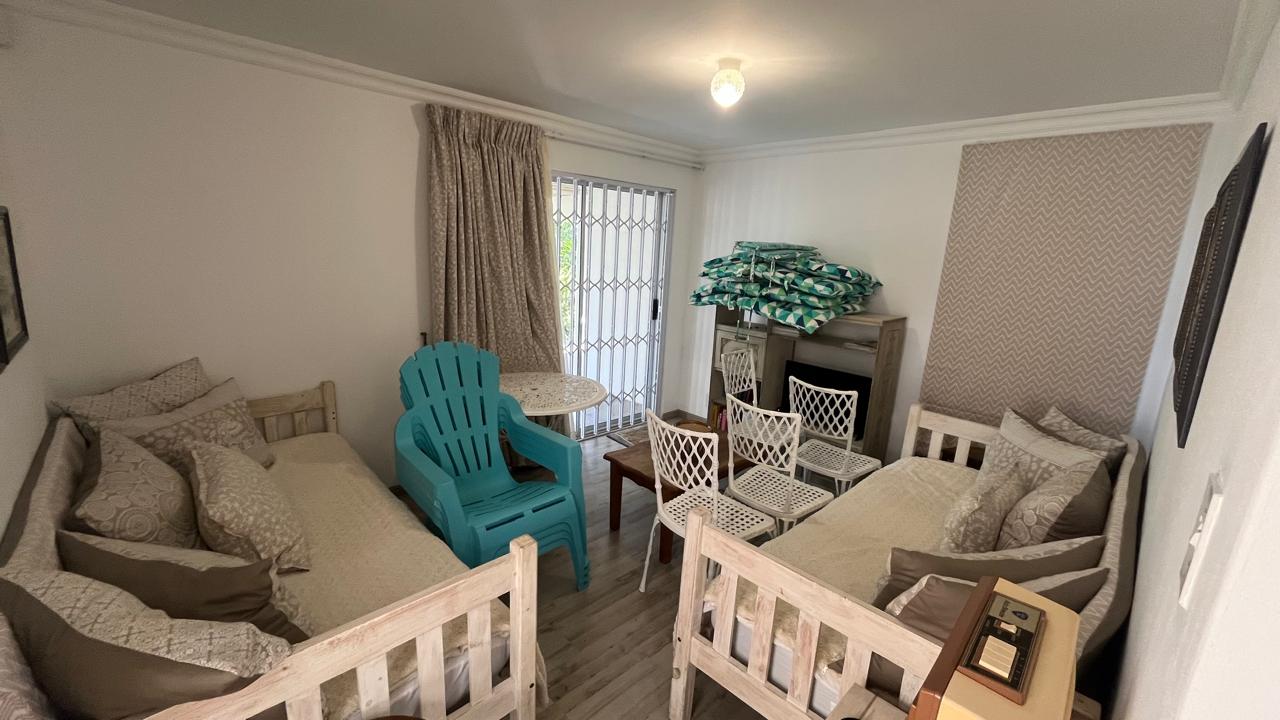 The dining room is fitted with air conditioning and laminate flooring, offering a comfortable space for meals and family gatherings. The adjacent braai room includes a built-in gas braai and opens through a sliding door to a balcony, perfect for entertaining. A second lounge on this level also features laminate flooring, a ceiling fan and light, and access to the balcony, which boasts scenic sea views.