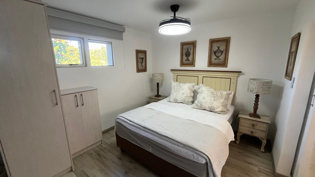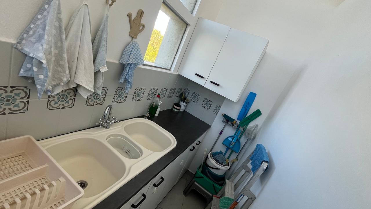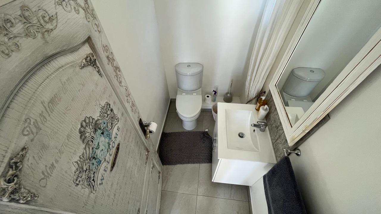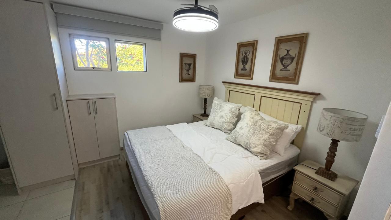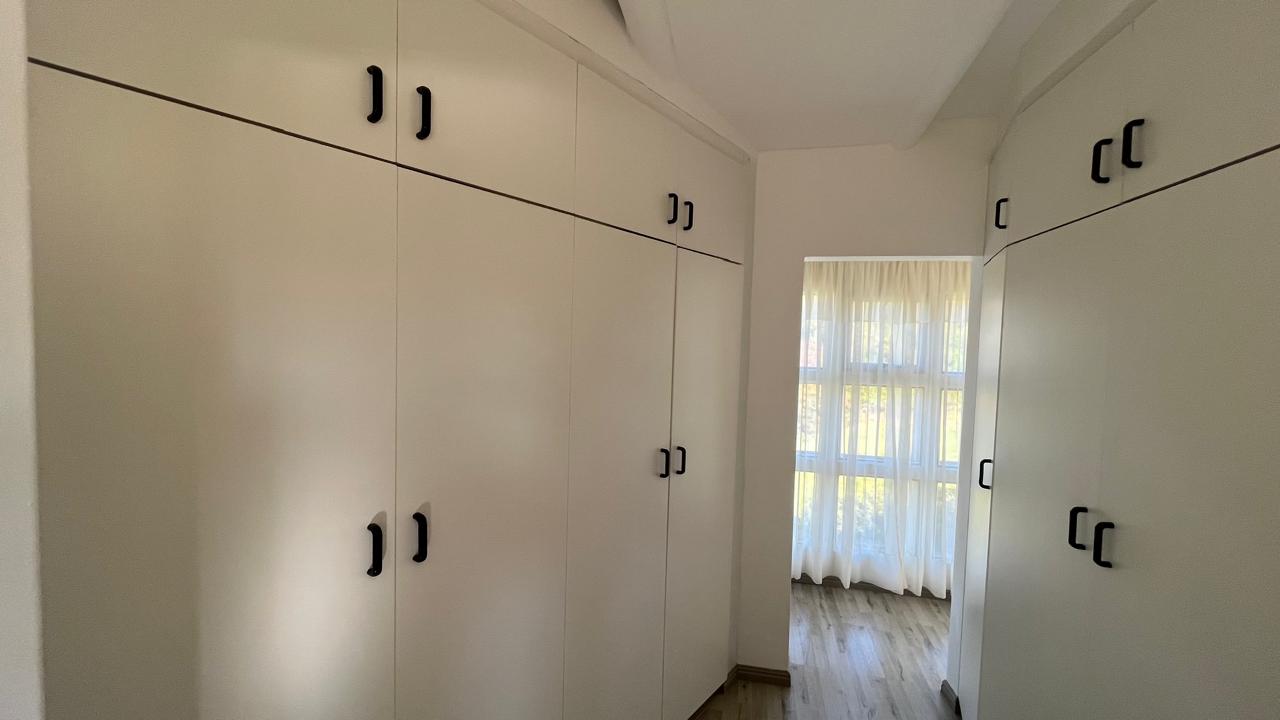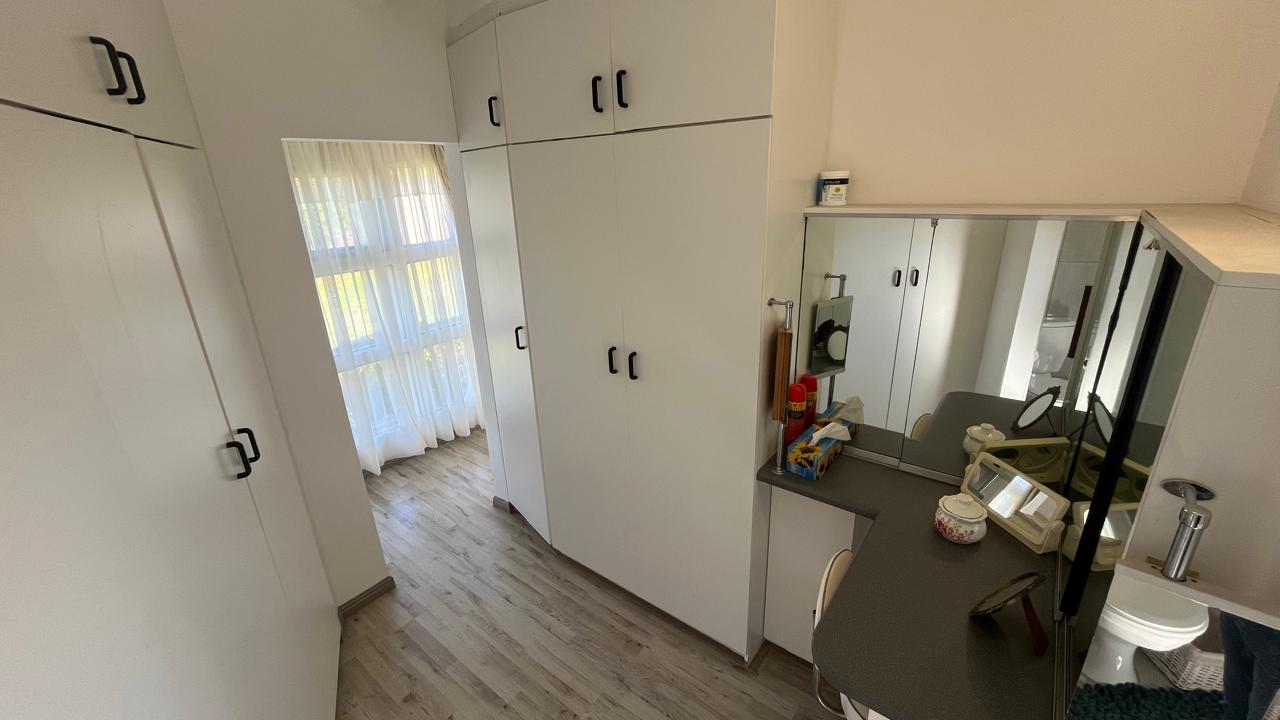 Upstairs, the home welcomes you with an entry hall and a guest toilet. The third bedroom on this level is spacious and air-conditioned, featuring built-in cupboards, a walk-in closet, and laminate flooring. The en-suite bathroom includes a bath, shower, toilet, and double basin, finished in a modern and neutral palette. The kitchen is practical and well-fitted, with melamine countertops, electric hob, extractor fan, eye-level oven, and plenty of cupboard space. A separate scullery adds convenience and extra storage.