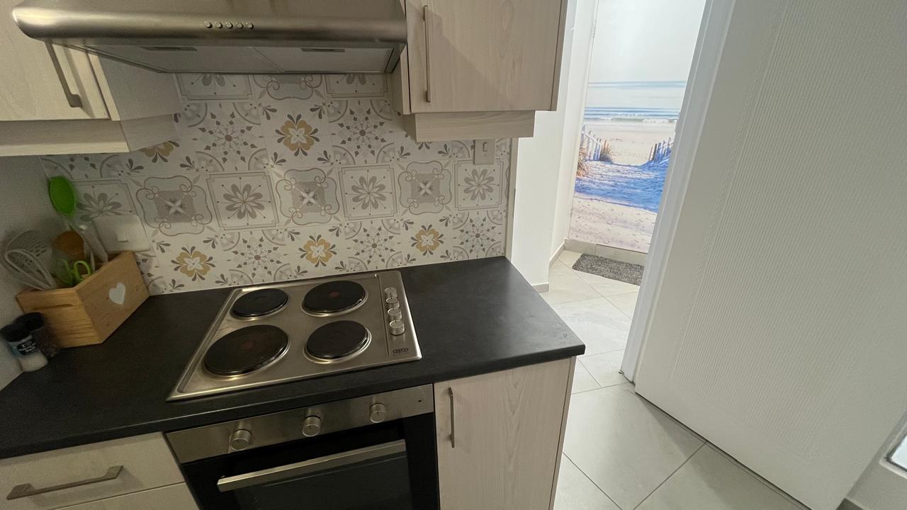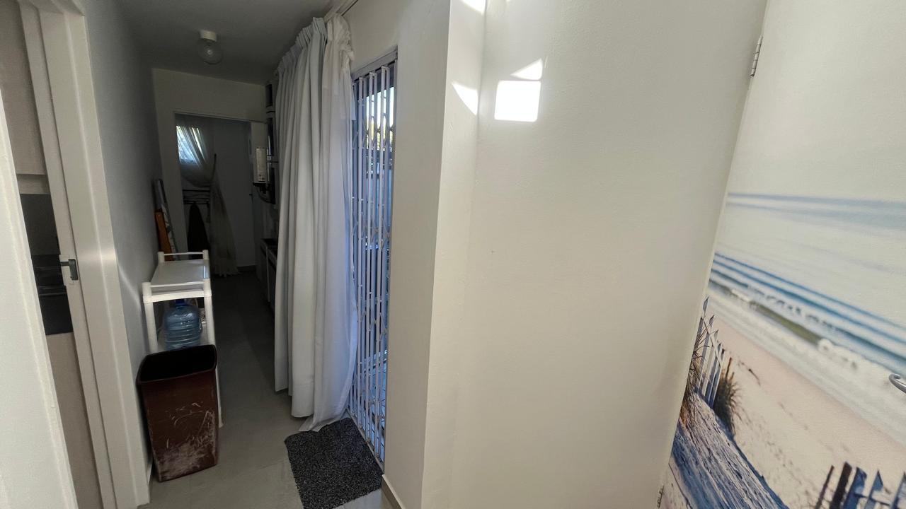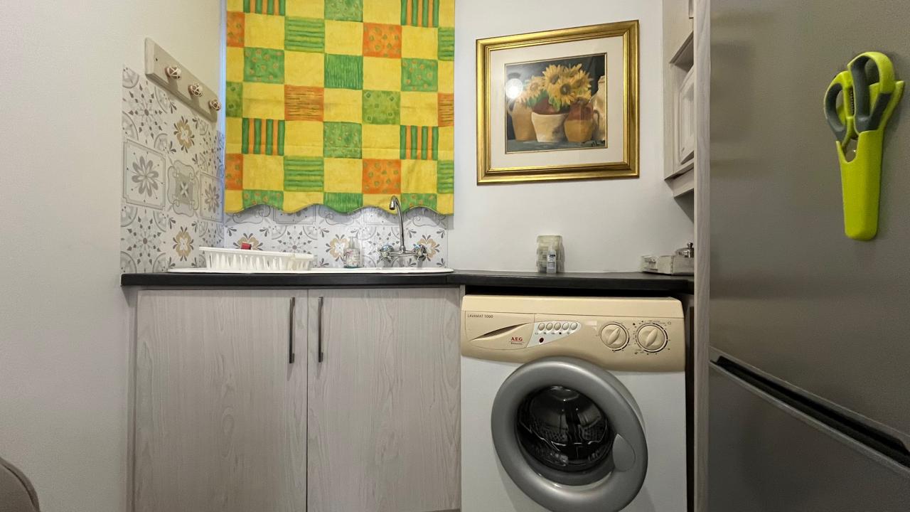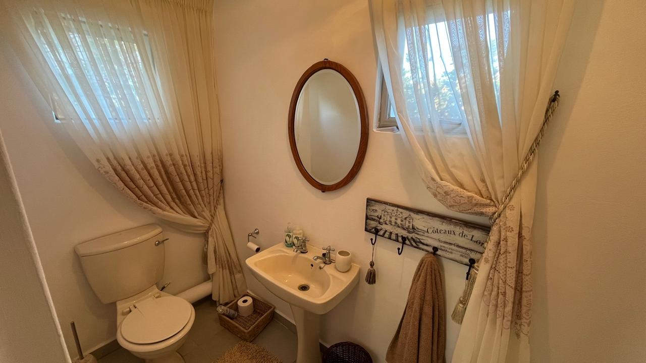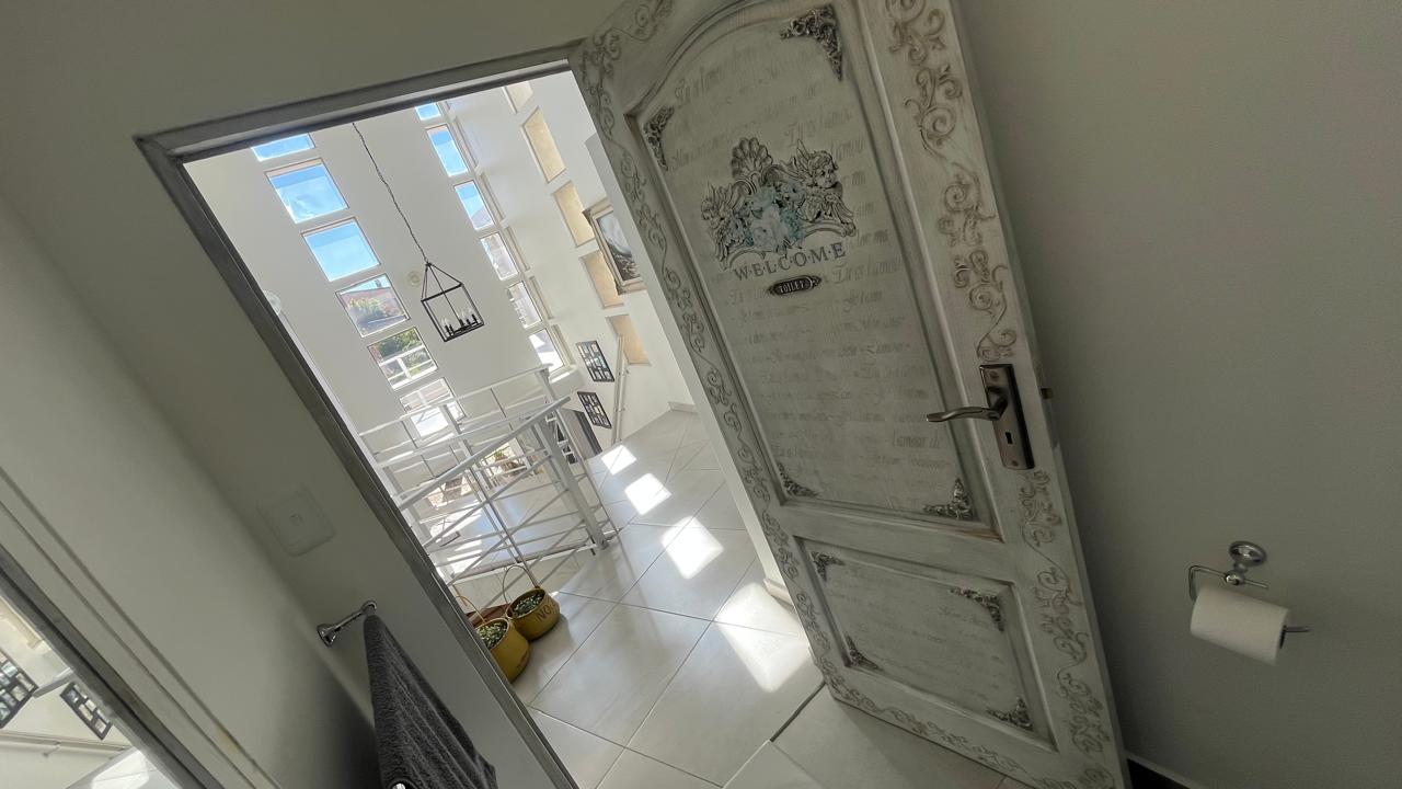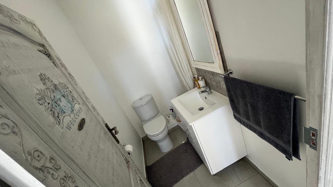 Upstairs, the home welcomes you with an entry hall and a guest toilet. The third bedroom on this level is spacious and air-conditioned, featuring built-in cupboards, a walk-in closet, and laminate flooring. The en-suite bathroom includes a bath, shower, toilet, and double basin, finished in a modern and neutral palette. The kitchen is practical and well-fitted, with melamine countertops, electric hob, extractor fan, eye-level oven, and plenty of cupboard space. A separate scullery adds convenience and extra storage.