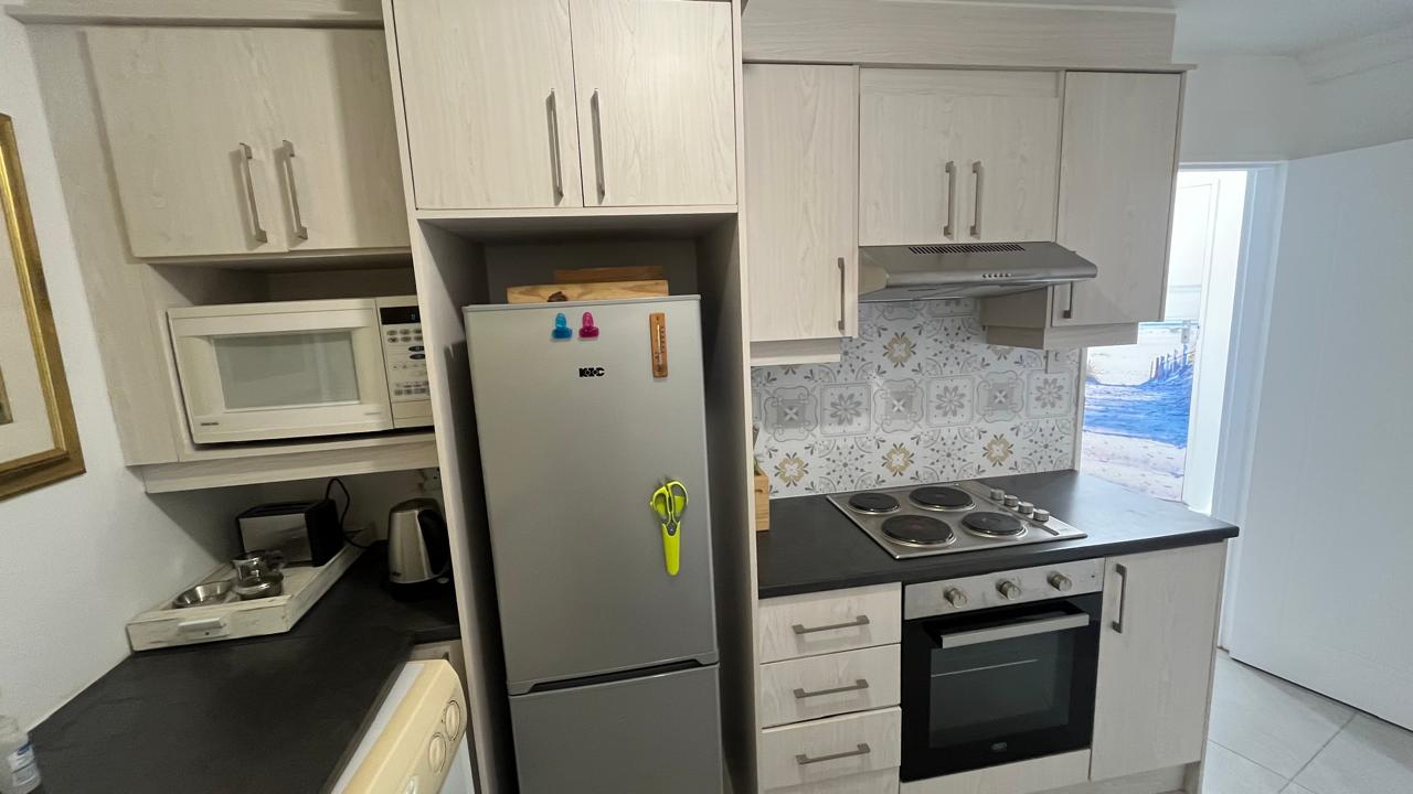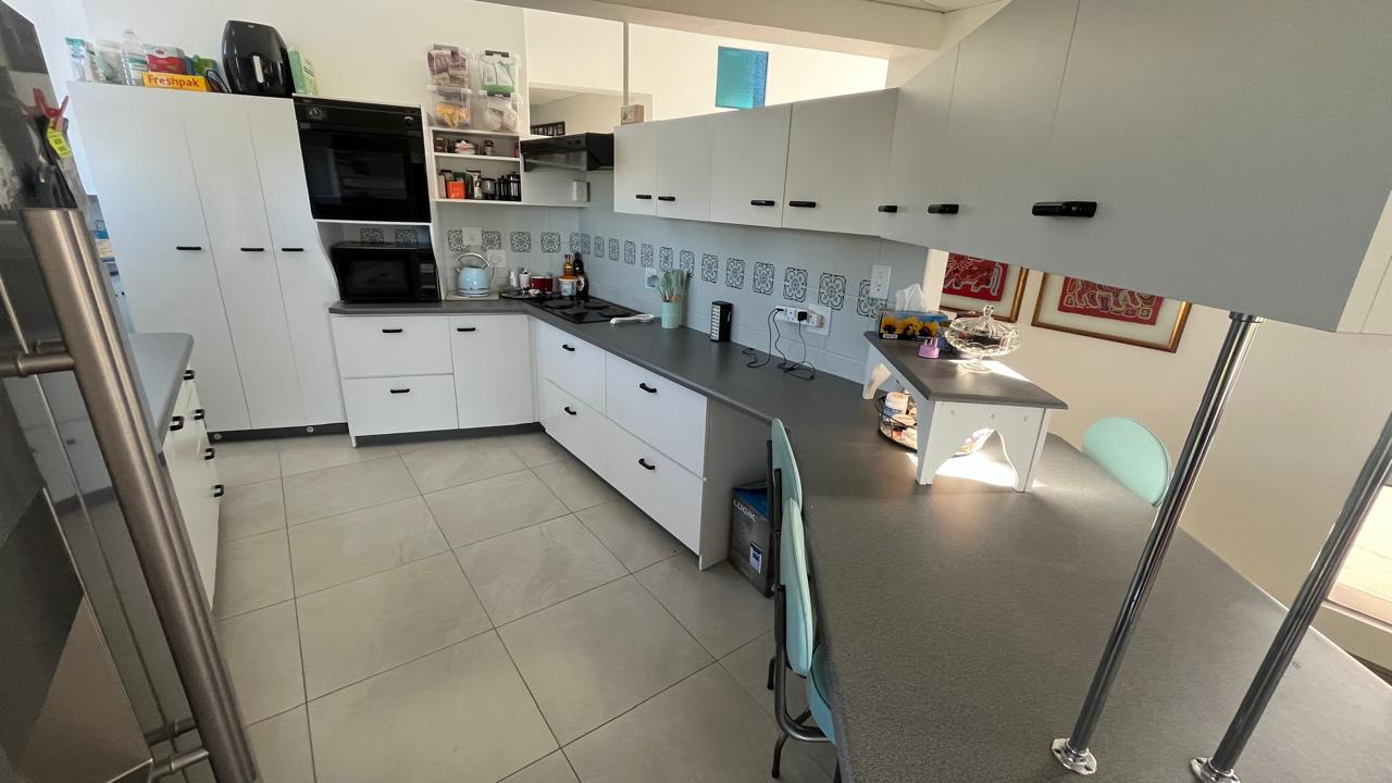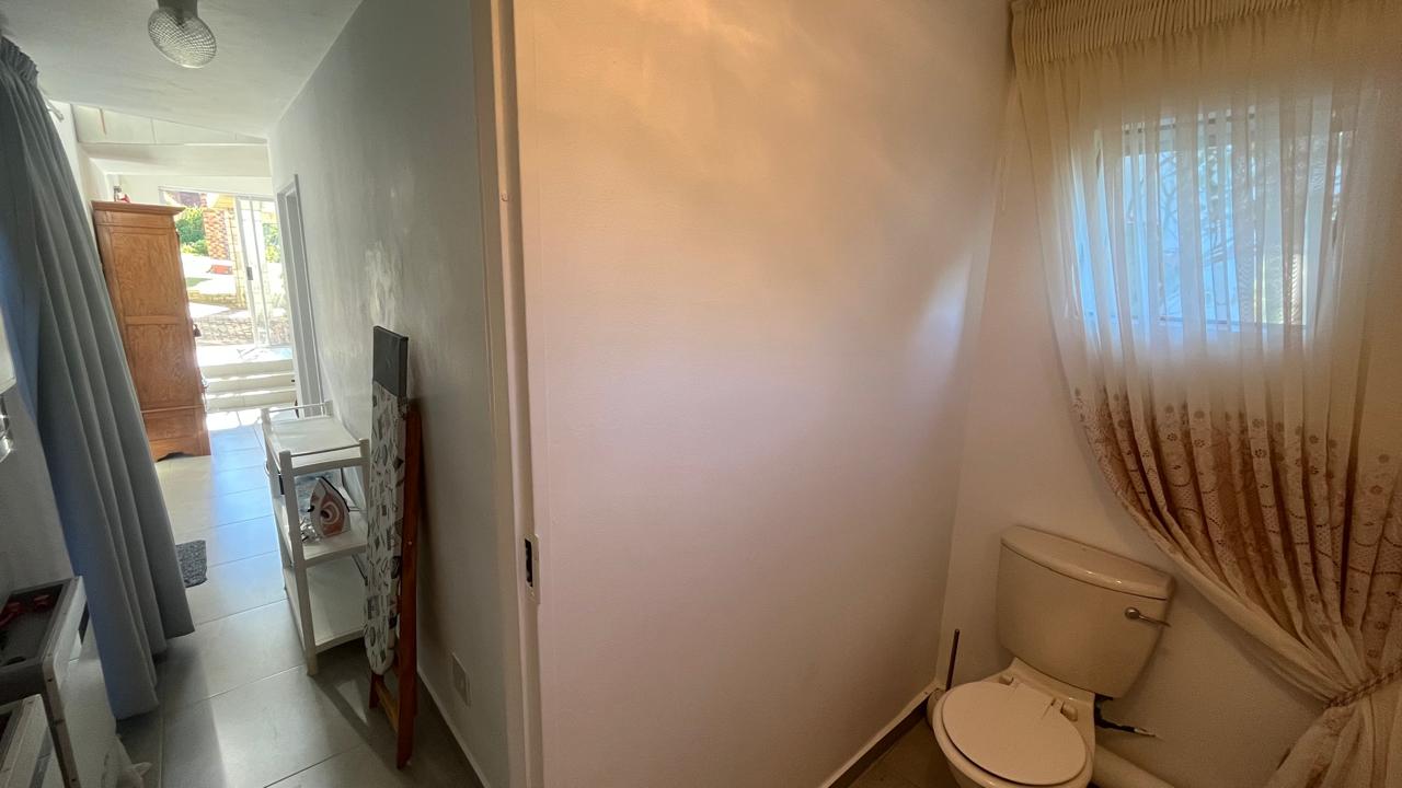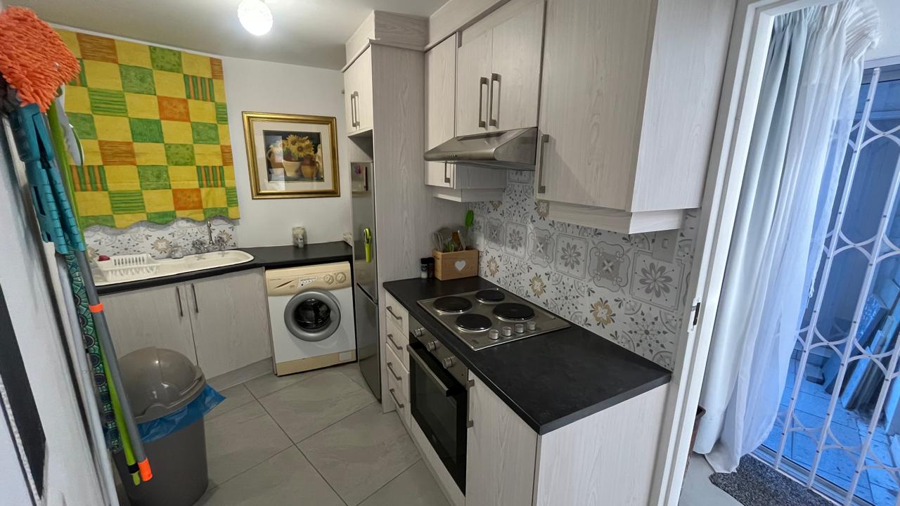 A small kitchenette serves the ground floor, making it ideal for use as a self-contained flatlet. It is fitted with an electric hob, under-counter oven, extractor fan, and ample cupboards. A guest toilet, storeroom, and an outside laundry with an additional toilet add to the convenience of this level. The lounge area features laminate flooring and opens through a sliding door to a covered patio, offering a relaxing space for everyday living.