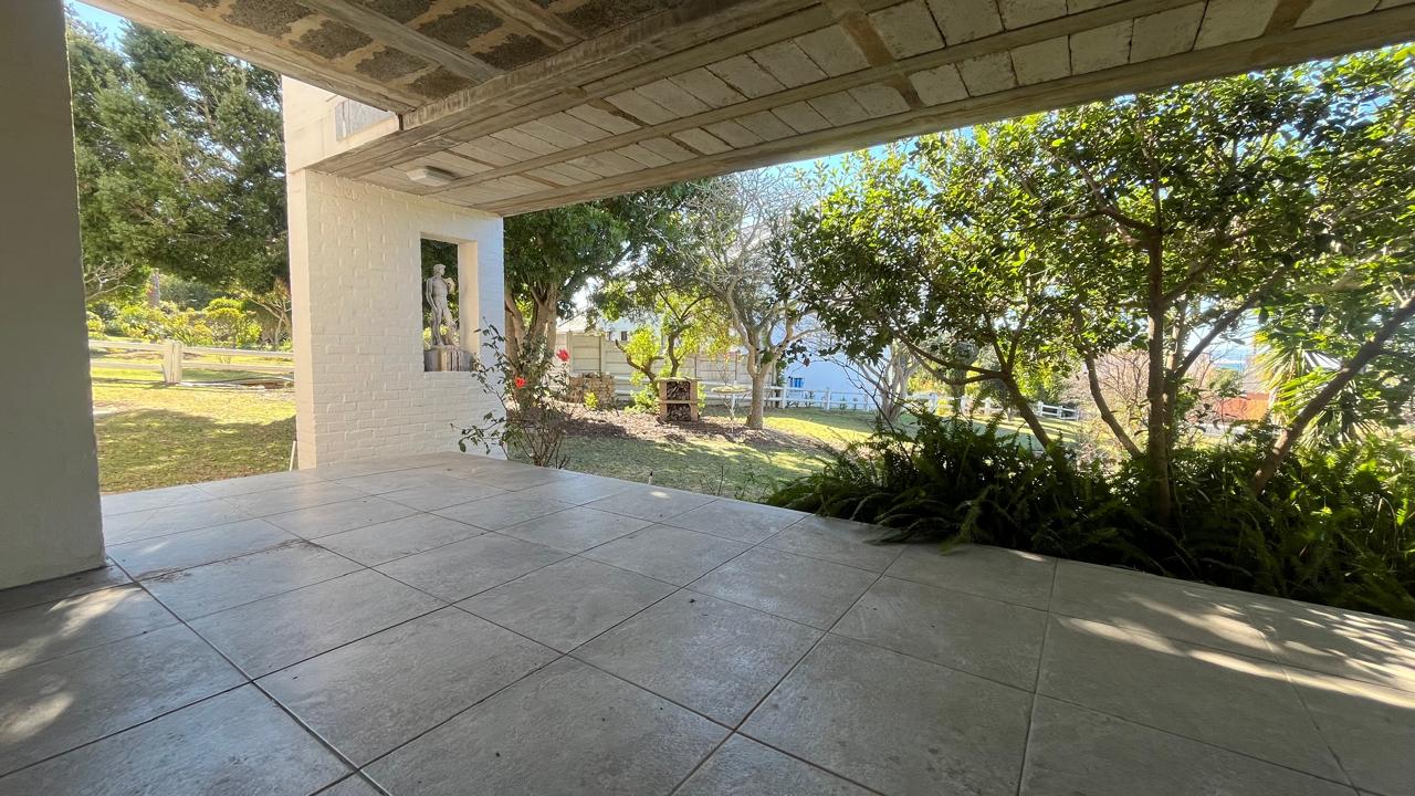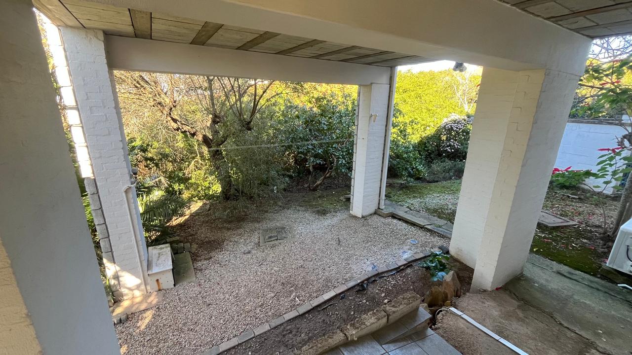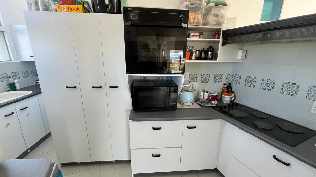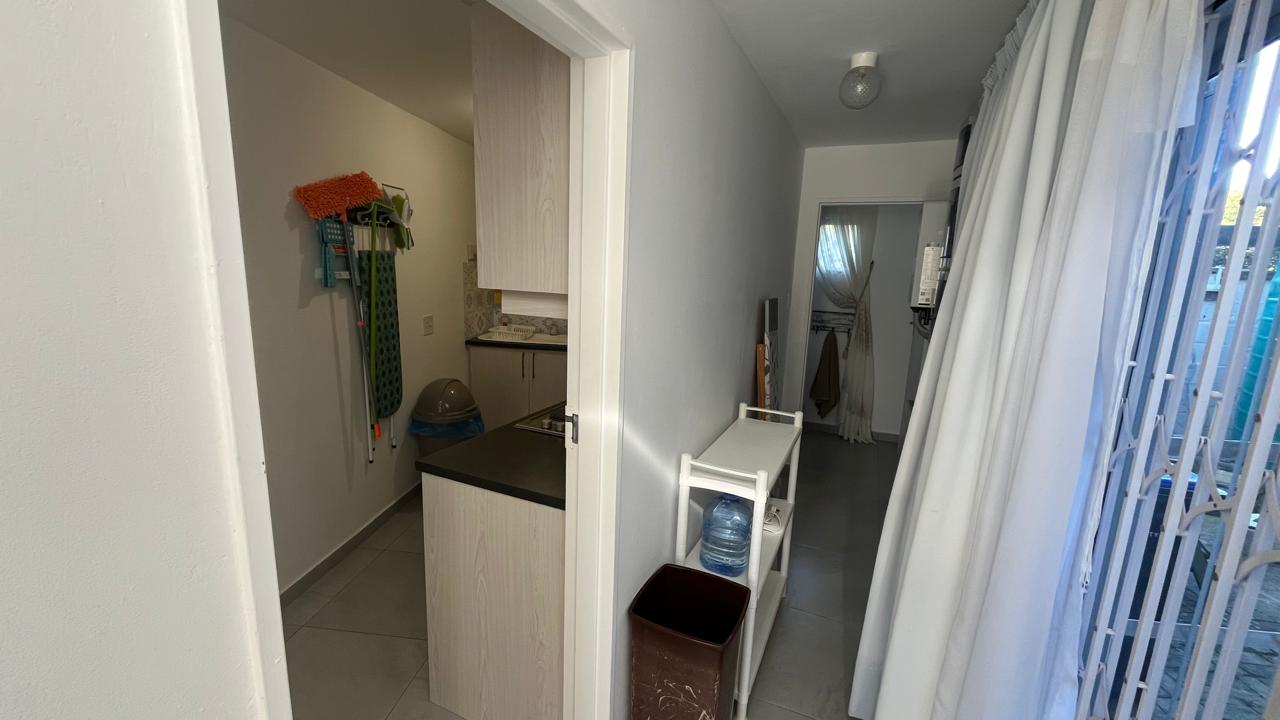 A small kitchenette serves the ground floor, making it ideal for use as a self-contained flatlet. It is fitted with an electric hob, under-counter oven, extractor fan, and ample cupboards. A guest toilet, storeroom, and an outside laundry with an additional toilet add to the convenience of this level. The lounge area features laminate flooring and opens through a sliding door to a covered patio, offering a relaxing space for everyday living.