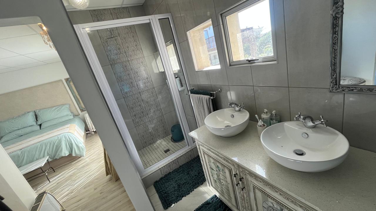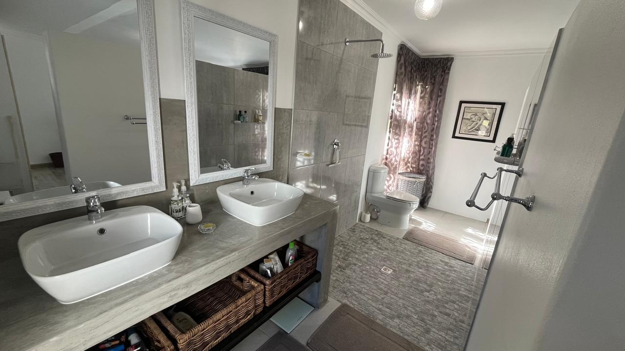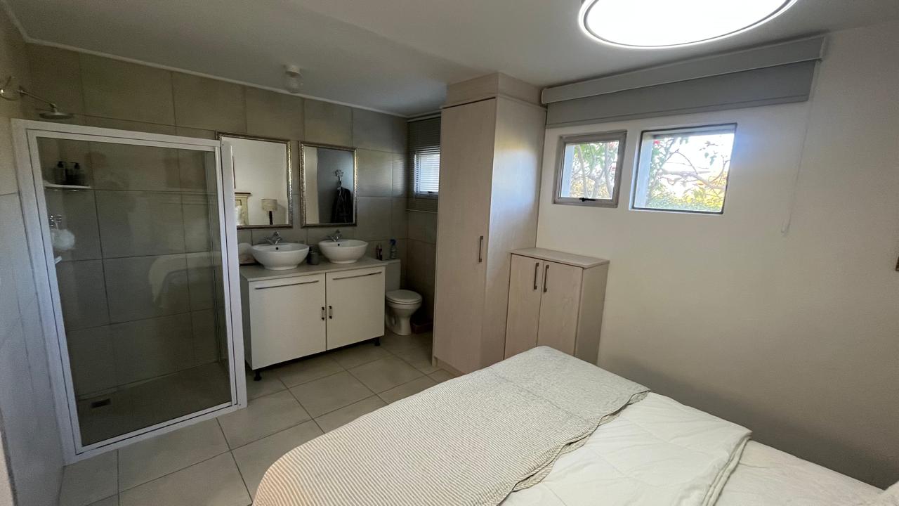 On the ground floor, the home features two generously sized en-suite bedrooms with laminate flooring. The first bedroom includes built-in cupboards and an en-suite bathroom fitted with tiled finishes, a shower, toilet, and his and hers basins. A sliding door opens directly to the outside, creating a seamless indoor-outdoor connection. The second bedroom also includes a light and ceiling fan, and its en-suite bathroom is finished with a shower, toilet, and dual basins.