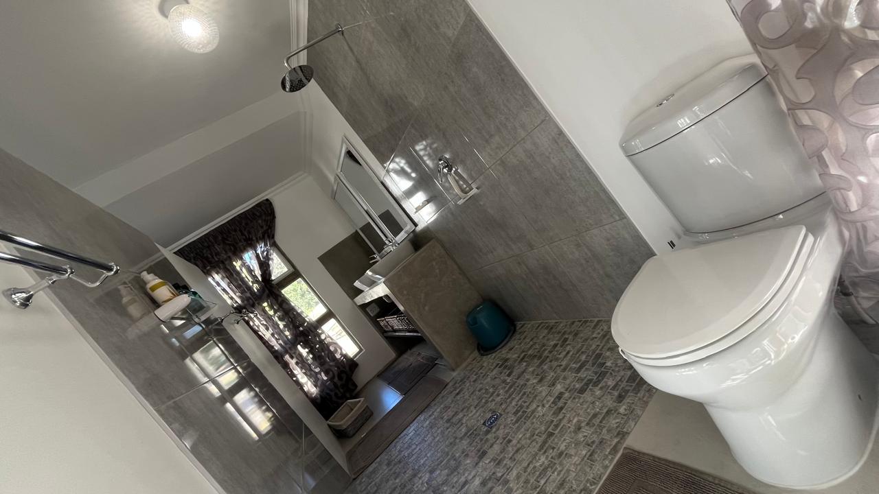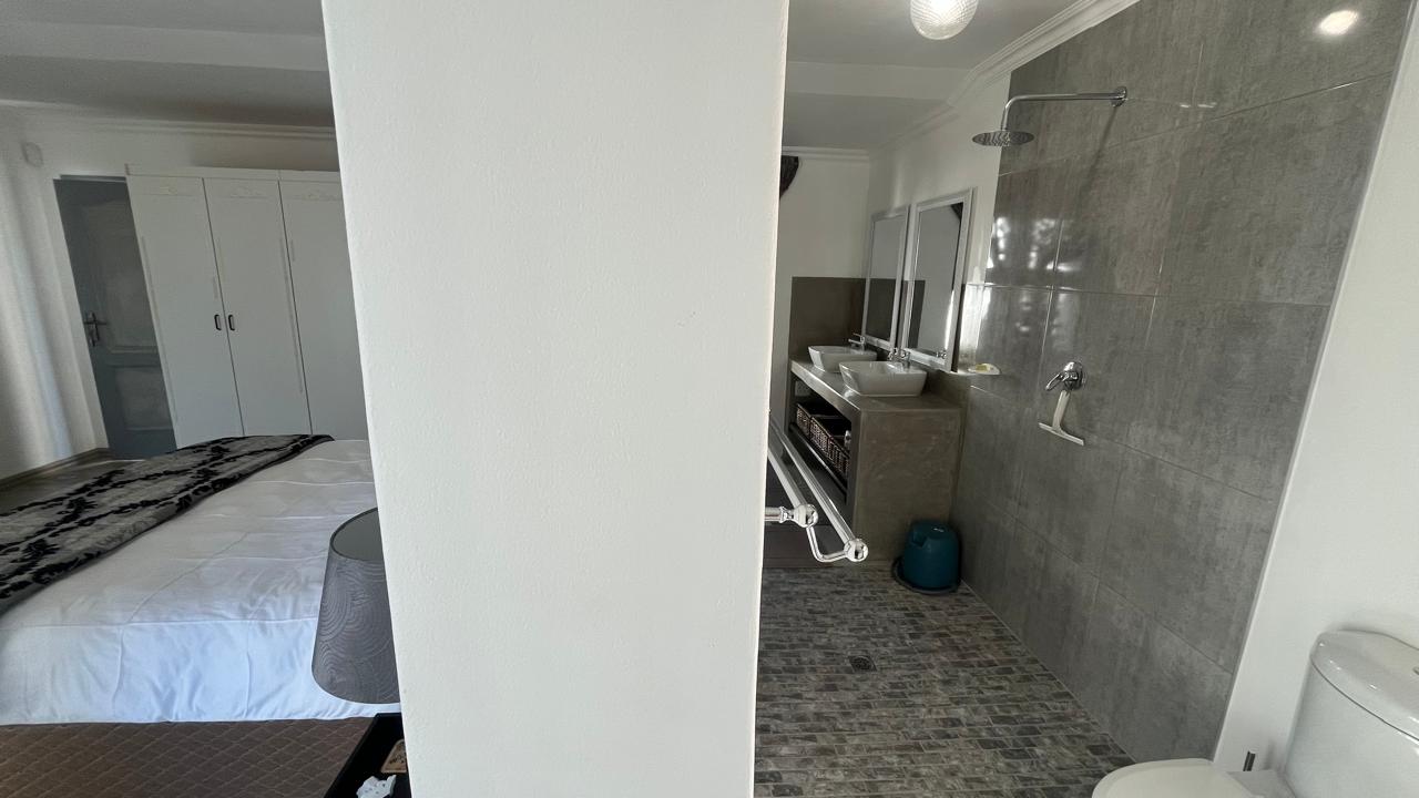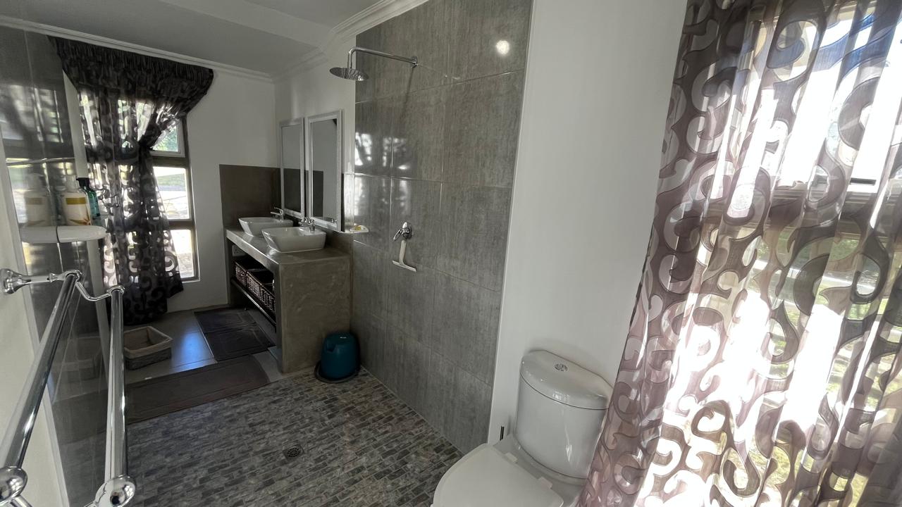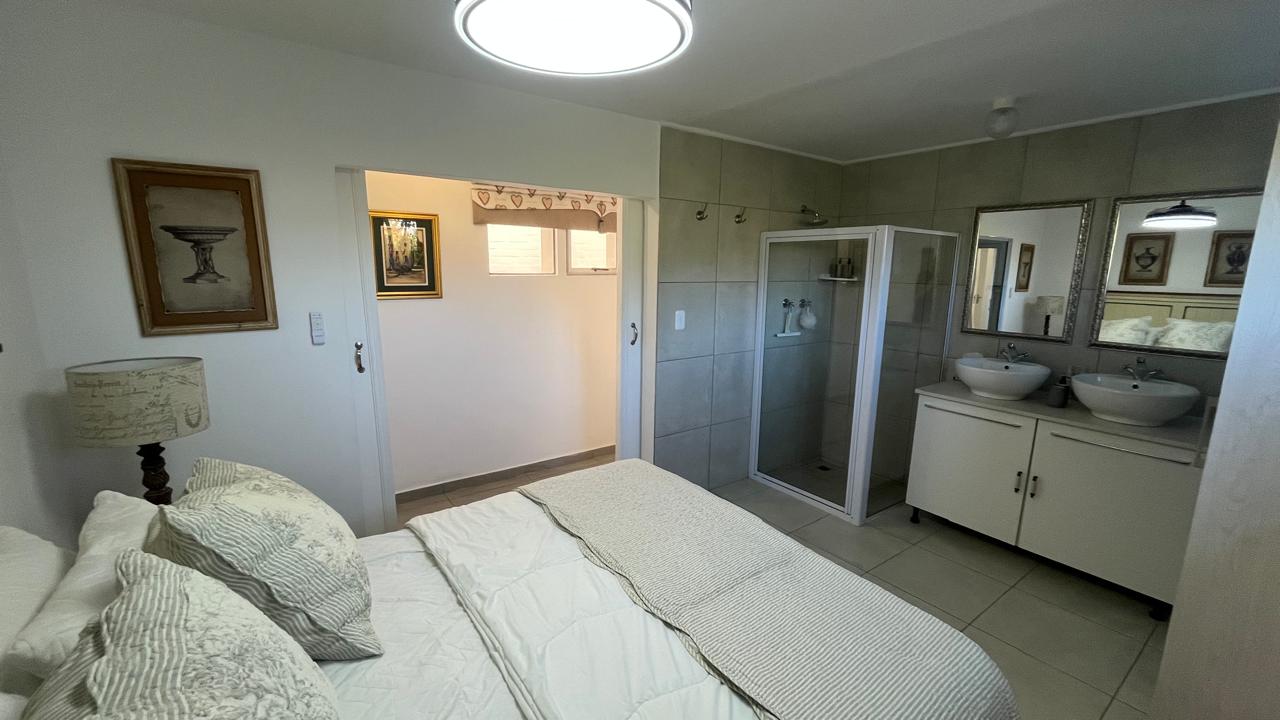 On the ground floor, the home features two generously sized en-suite bedrooms with laminate flooring. The first bedroom includes built-in cupboards and an en-suite bathroom fitted with tiled finishes, a shower, toilet, and his and hers basins. A sliding door opens directly to the outside, creating a seamless indoor-outdoor connection. The second bedroom also includes a light and ceiling fan, and its en-suite bathroom is finished with a shower, toilet, and dual basins.