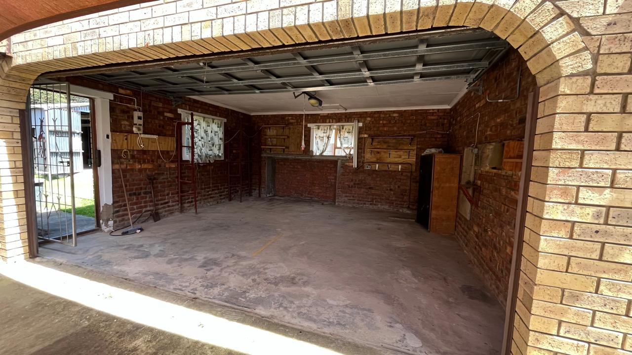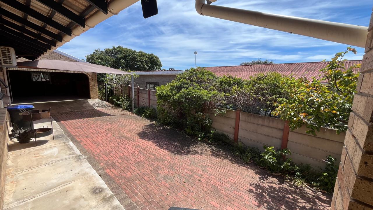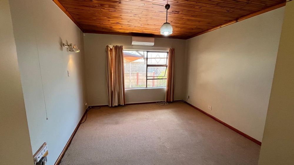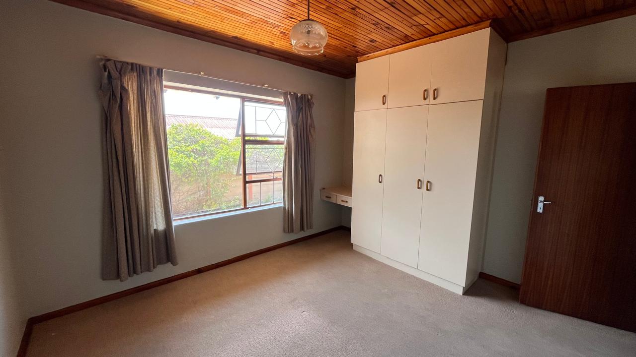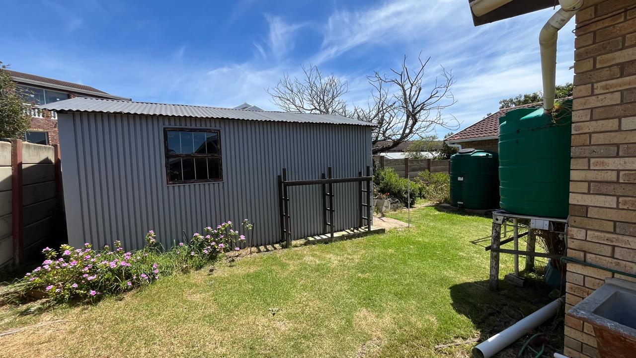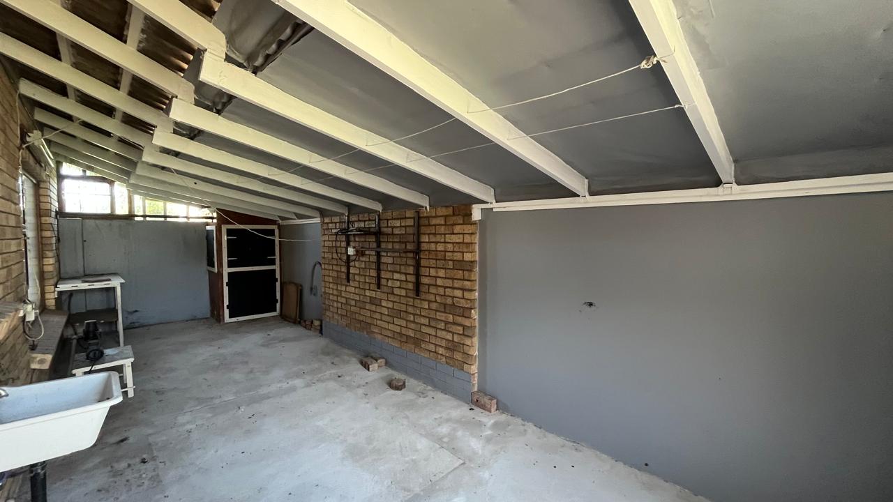 The property continues to impress outdoors with an inviting braai area perfectly positioned for relaxed gatherings. The double garage is fitted with an automated door, and the yard is fully enclosed, offering secure space for pets and children. A 2,500L water tank, supported by additional tanks, ensures practical water storage. There is also a Wendy house, not included on the plans, that provides extra storage for tools or garden equipment. The home is fitted with an alarm system for added peace of mind and features knotty pine ceilings, wooden window frames and comfortable carpeting throughout.