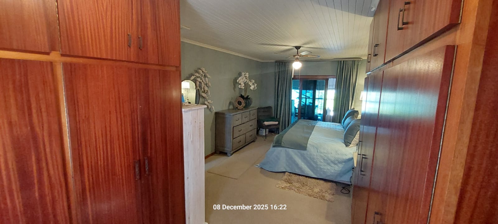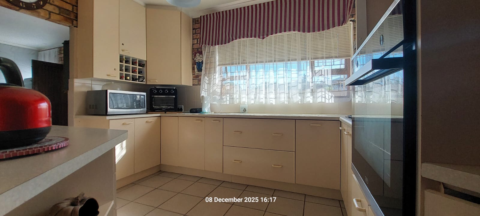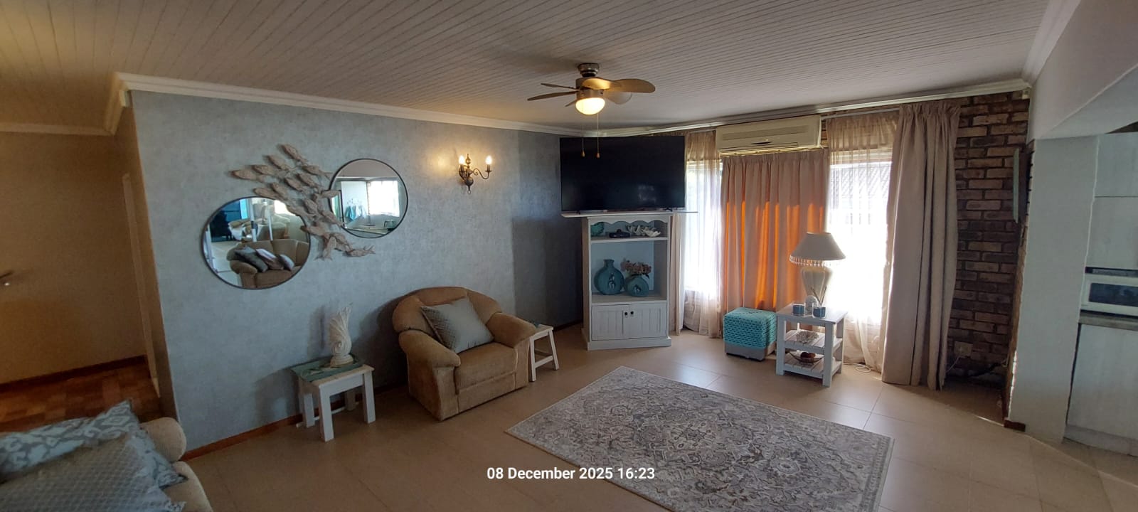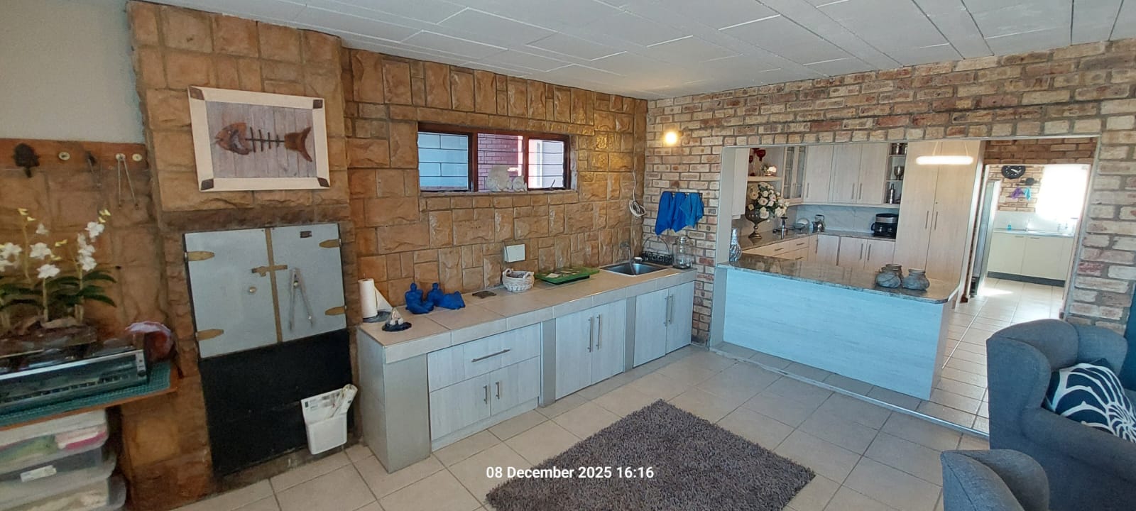 The ground floor welcomes you with a sense of space and convenience, offering a fully equipped solar backup system, an automated double garage, and an adjoining workshop that any hobbyist or handyman will appreciate. Security has been carefully prioritized with burglar bars, security doors and an alarm system. The property is further enhanced by a strong borehole supplying 6000 liters per hour, JoJo tanks, neat paving, a well-maintained garden and an outside shower for those sandy beach days. Inside, the lower level features two generous bedrooms with tiled floors, built-in cupboards and air-conditioning where needed. A tiled dining area with tasteful cabinetry flows toward a charming braai room fitted with a built-in braai, ideal for relaxed family gatherings. The kitchen is supported by a separate scullery and laundry and includes melamine countertops, built-in cupboards, a gas hob, extractor fan and an eye-level oven. A neat bathroom with a toilet, basin and shower completes the downstairs layout. The first floor continues to impress with four comfortable bedrooms, each thoughtfully finished to ensure a restful retreat. Two of the rooms open onto a patio, inviting you to step outside and enjoy the fresh coastal air. The main bedroom offers an en-suite bathroom with a bath, shower, basin and toilet. The family bathroom includes a bath, basin and toilet. This level also hosts a bright and spacious open-plan lounge, dining area and kitchen where tiled floors, built-in cupboards, melamine tops, an air-conditioner and ceiling fans create an easy, relaxed atmosphere. A covered braai patio fitted with canvas wind blockers extends the living space and makes year-round entertaining a pleasure.