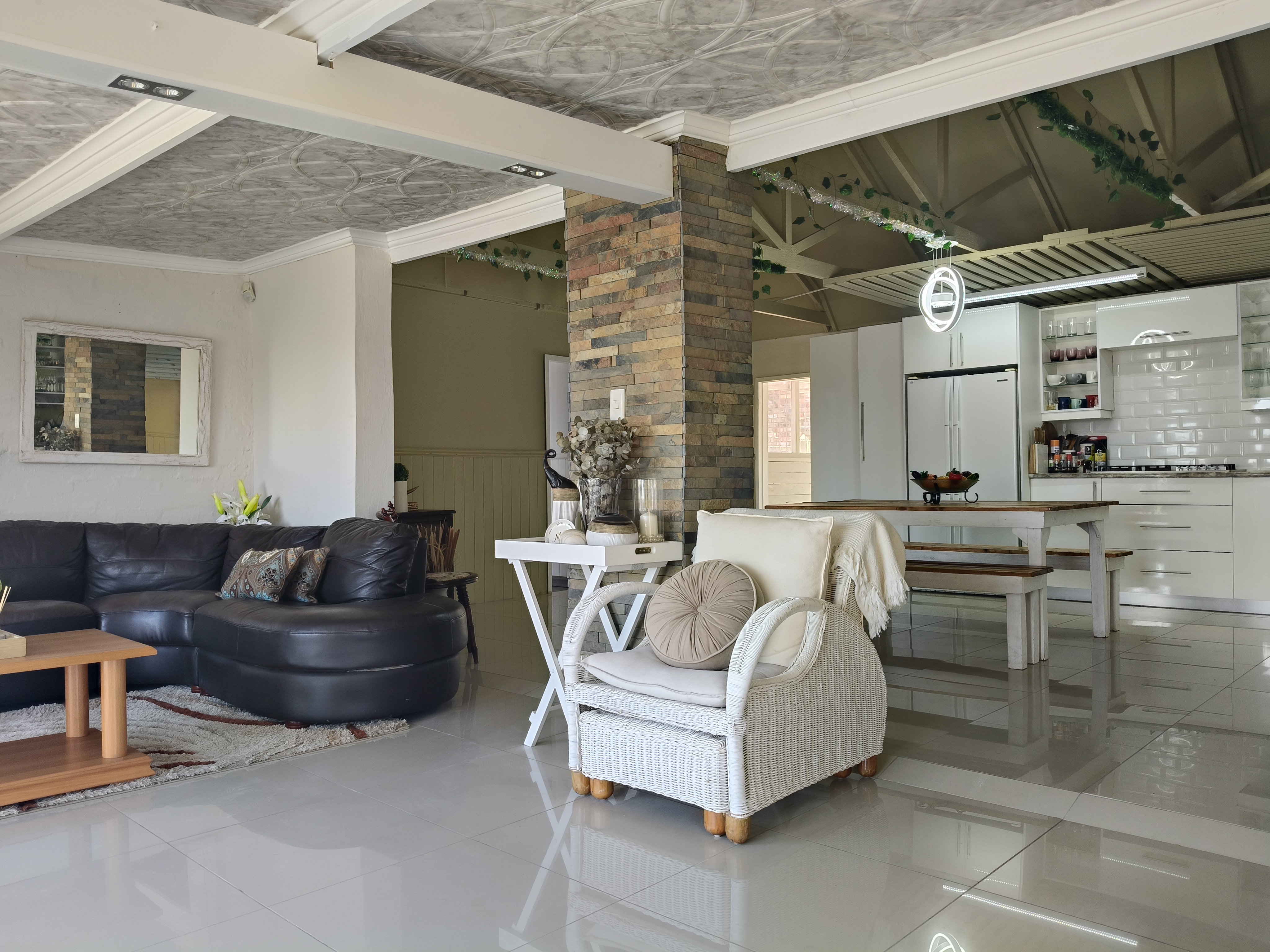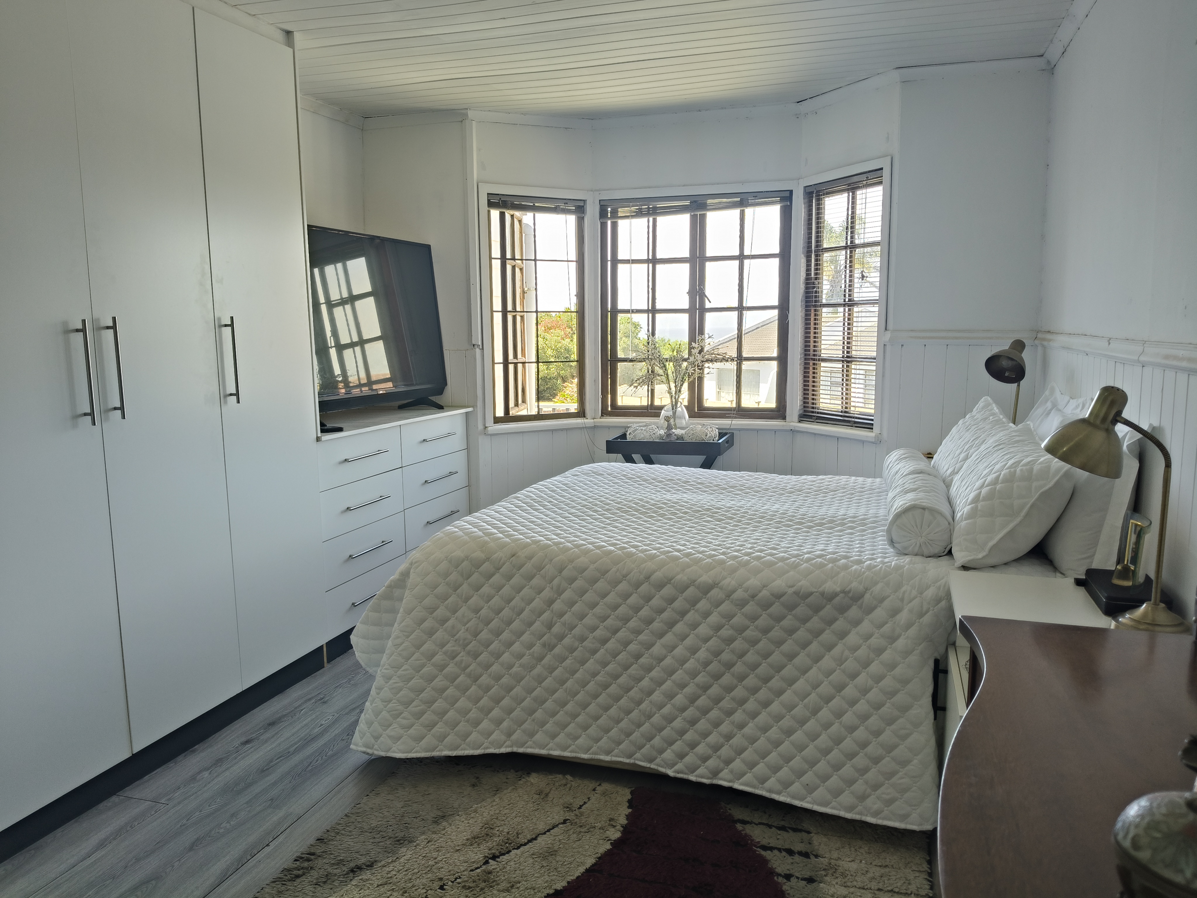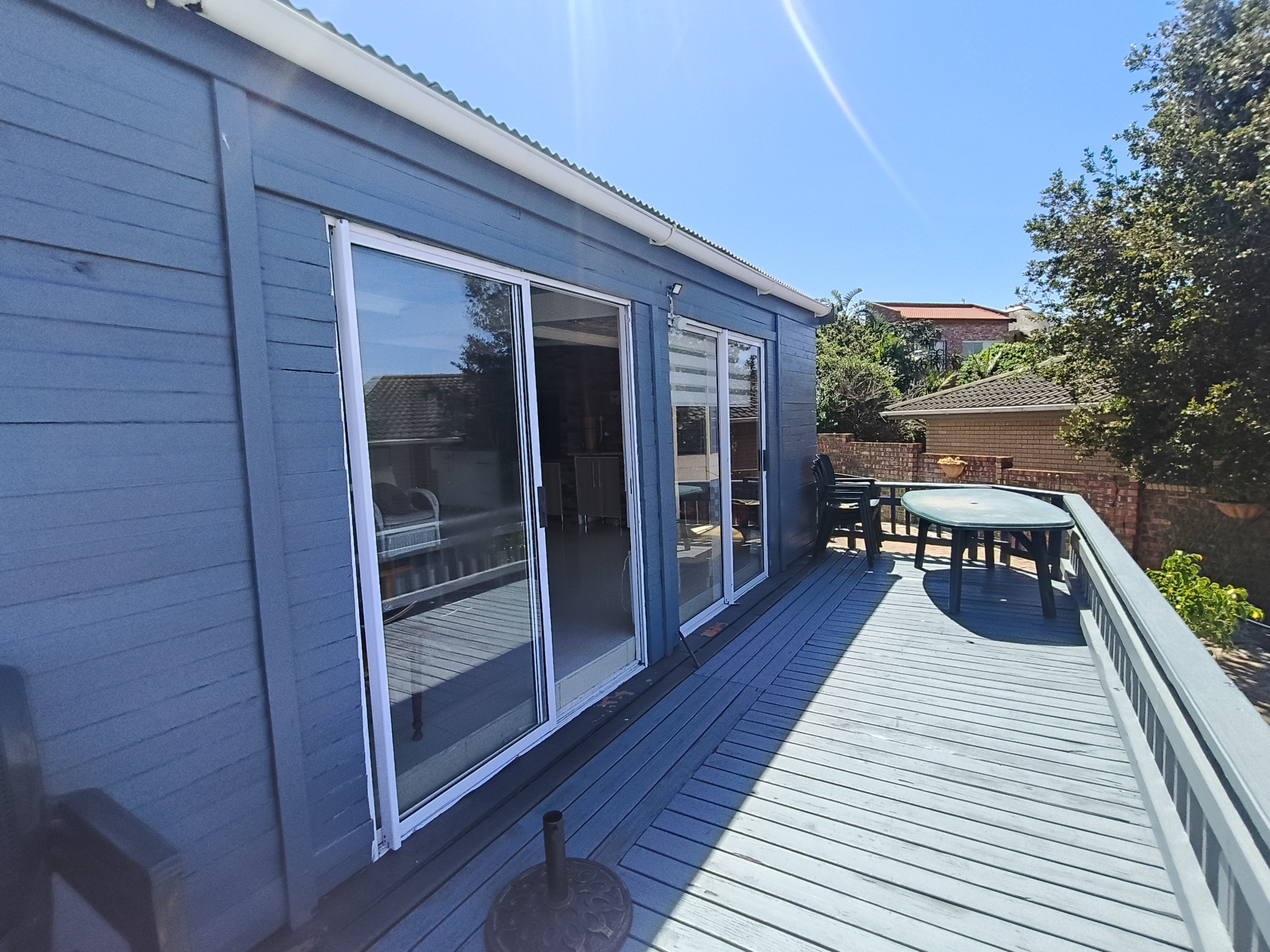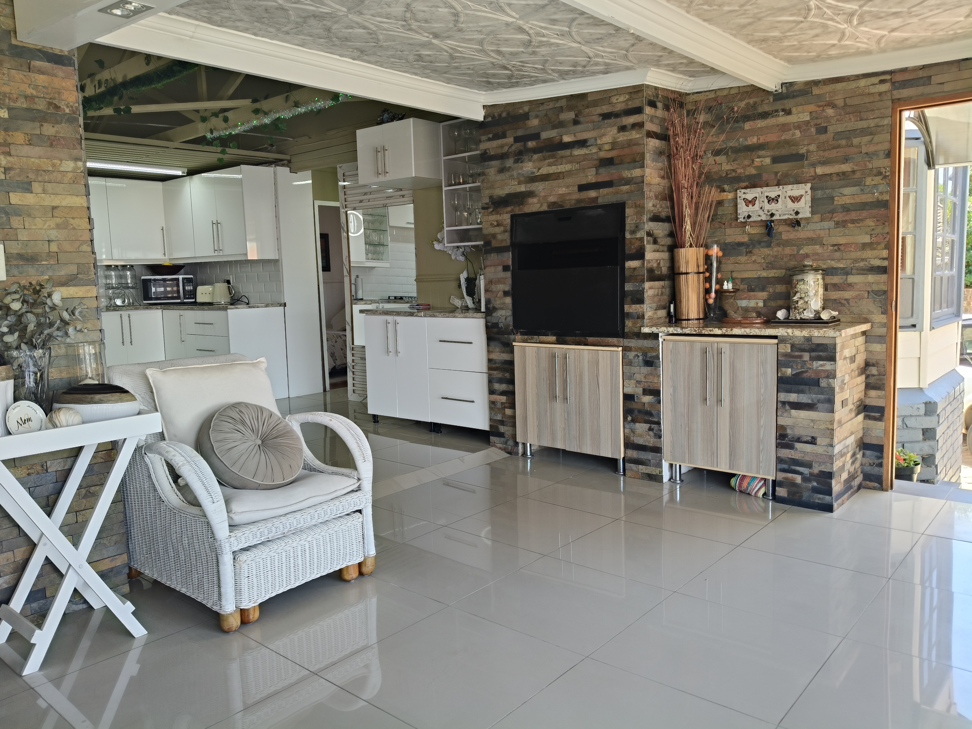 This unique home offers a delightful surprise as you step through the front door. The modern open-plan living area features a beautiful kitchen with a built-in braai, perfect for entertaining. Enjoy sea views from the patio. To the right of the living area, you'll find two bedrooms sharing a family bathroom. To the left of the living area, the main bedroom with an en-suite bathroom and sea view offers a private retreat. A separate single garage for extra security and ease. Furniture available as an optional extra.