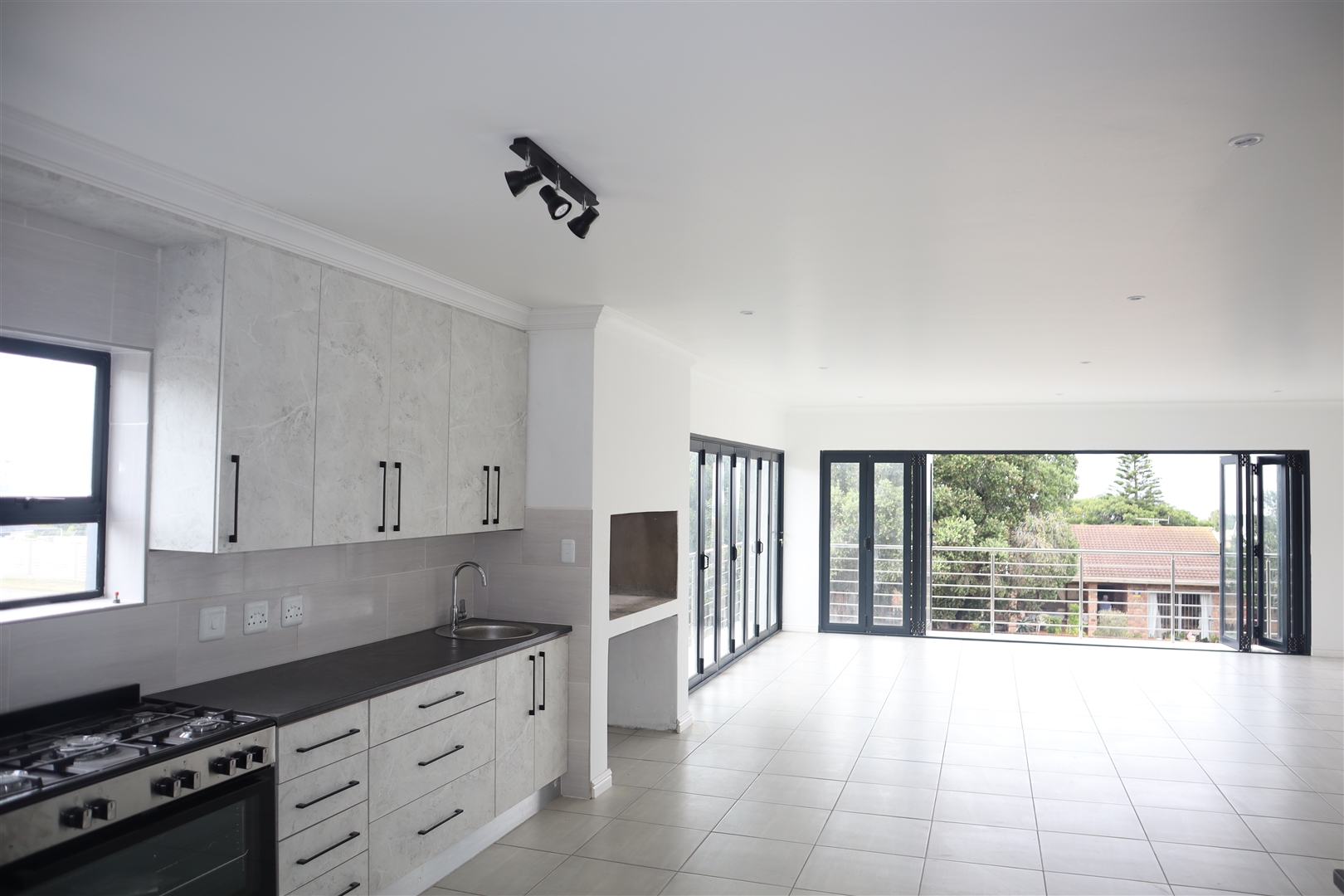 -Spacious open plan living area with indoor braai and stacker doors