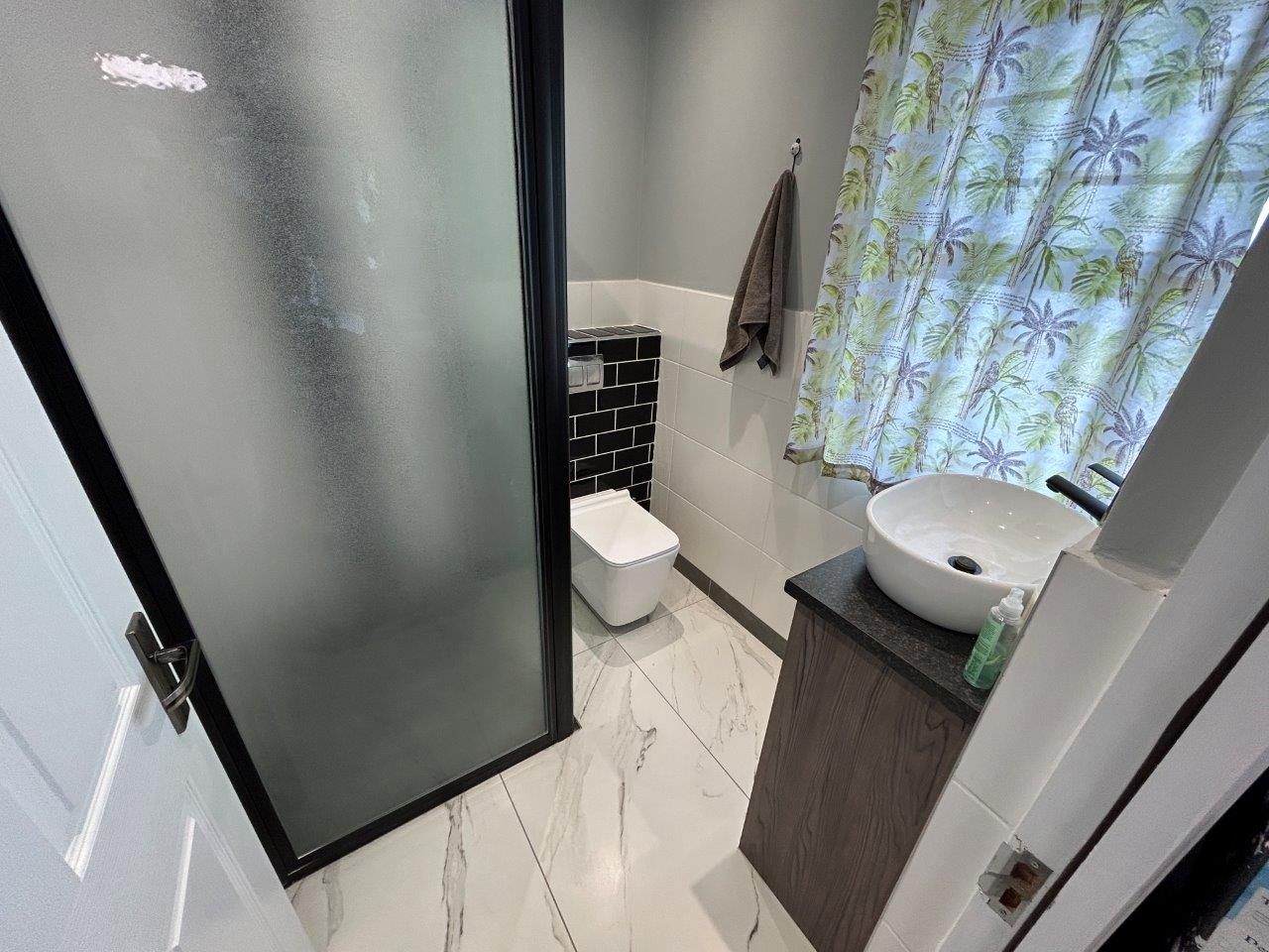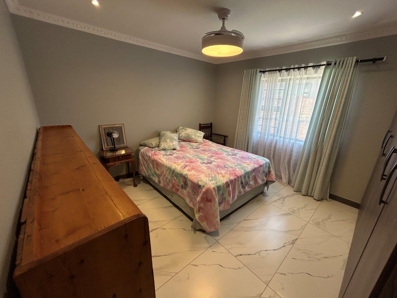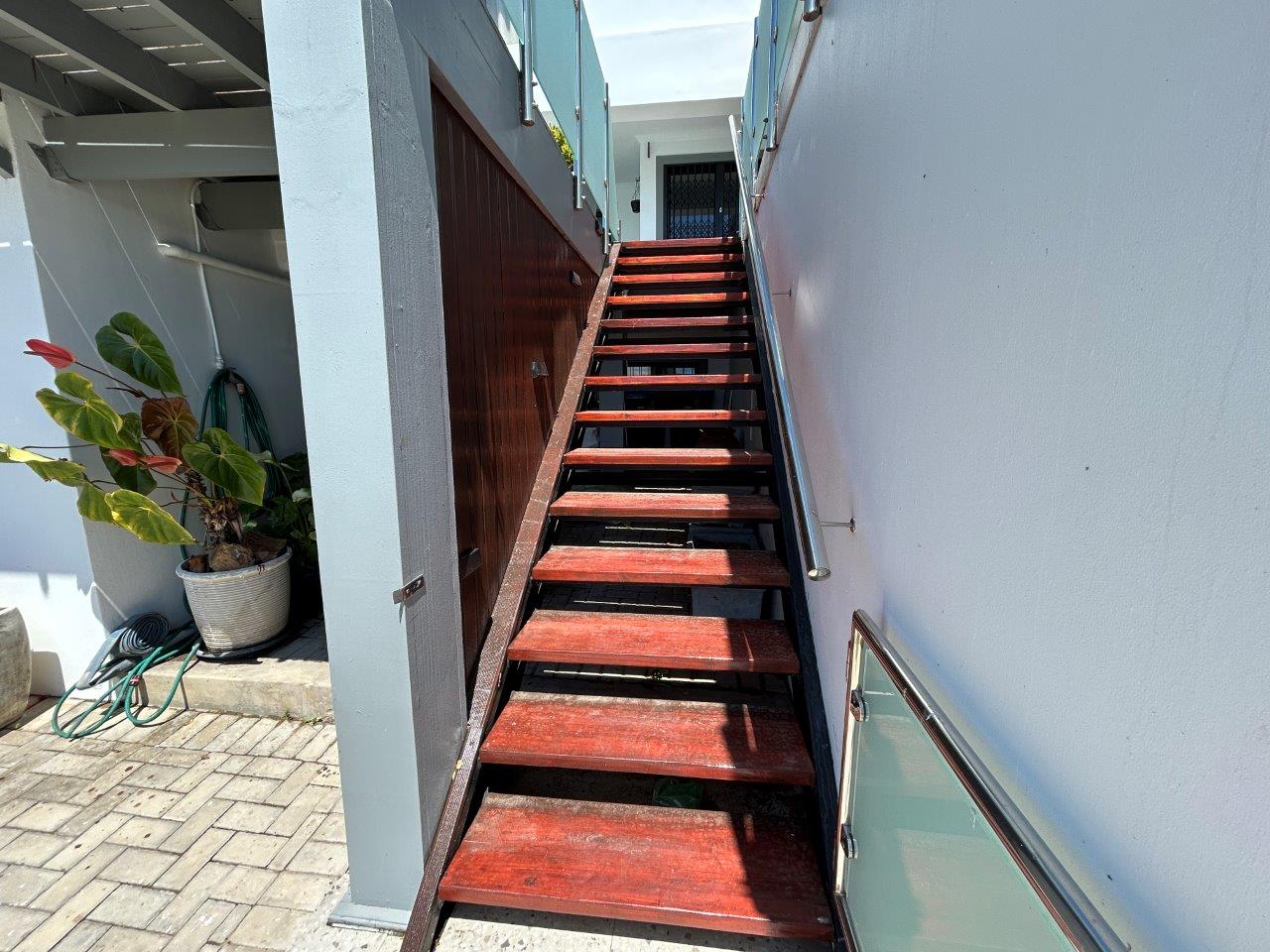 This level also includes a guest toilet and a well-appointed main bedroom with built-in cupboards, and own private en-suite bathroom, and its own side entrance leading onto the pool area.