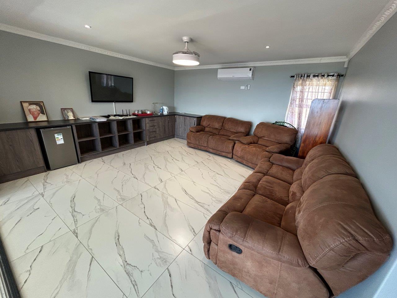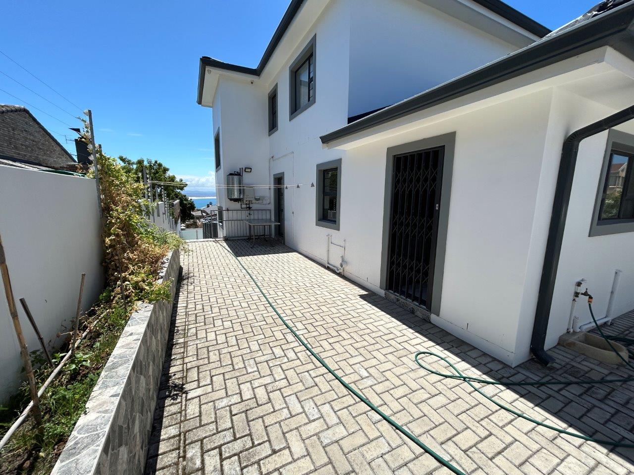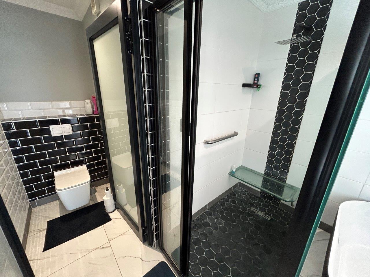This level also includes a guest toilet and a well-appointed main bedroom with built-in cupboards, and own private en-suite bathroom, and its own side entrance leading onto the pool area.