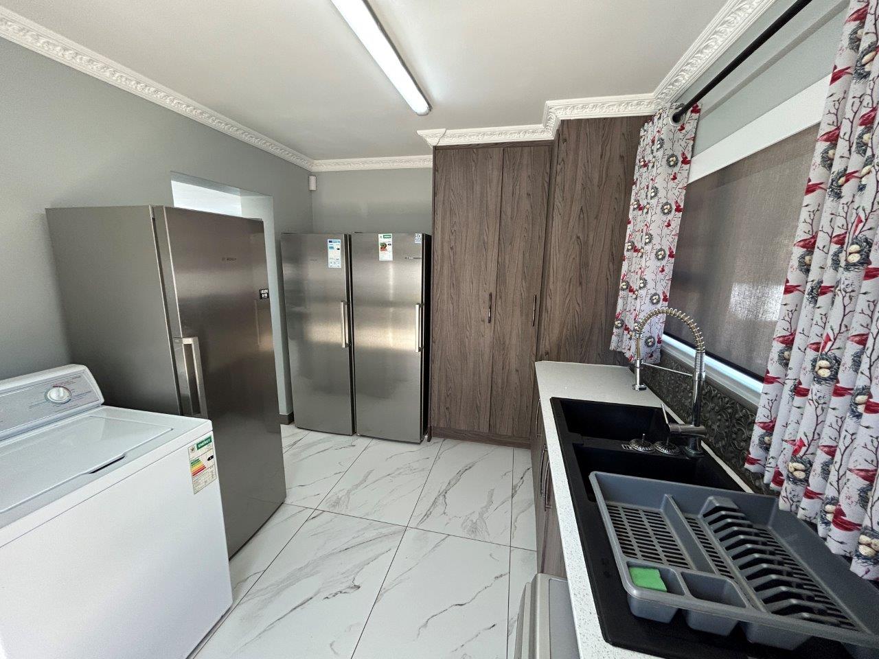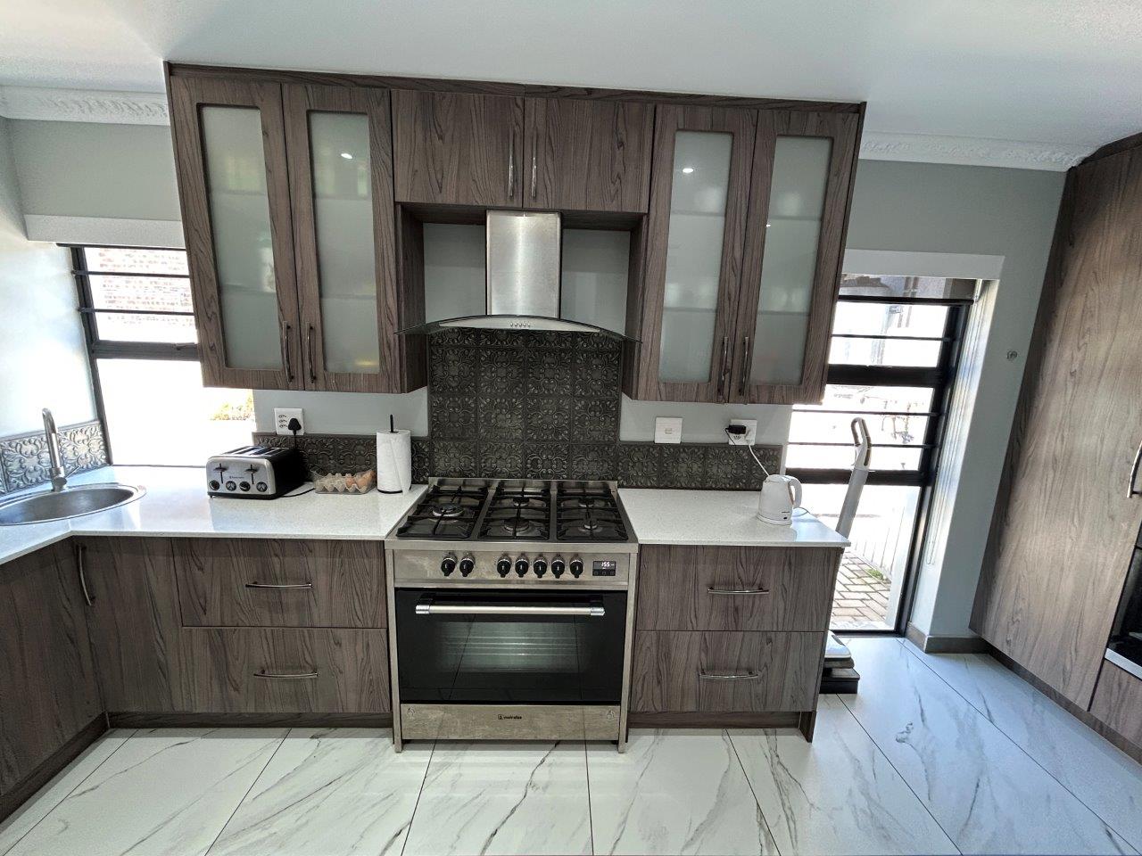 The modern kitchen features brand-new cabinetry, engineered stone countertops, a gas stove with electric oven, extractor fan, additional electric ovens, prep bowl, separate scullery with a double basin, pantry cupboard, and ample space for a large fridge, Speed Queen washing machine, and a tumble dryer and any additional appliances.