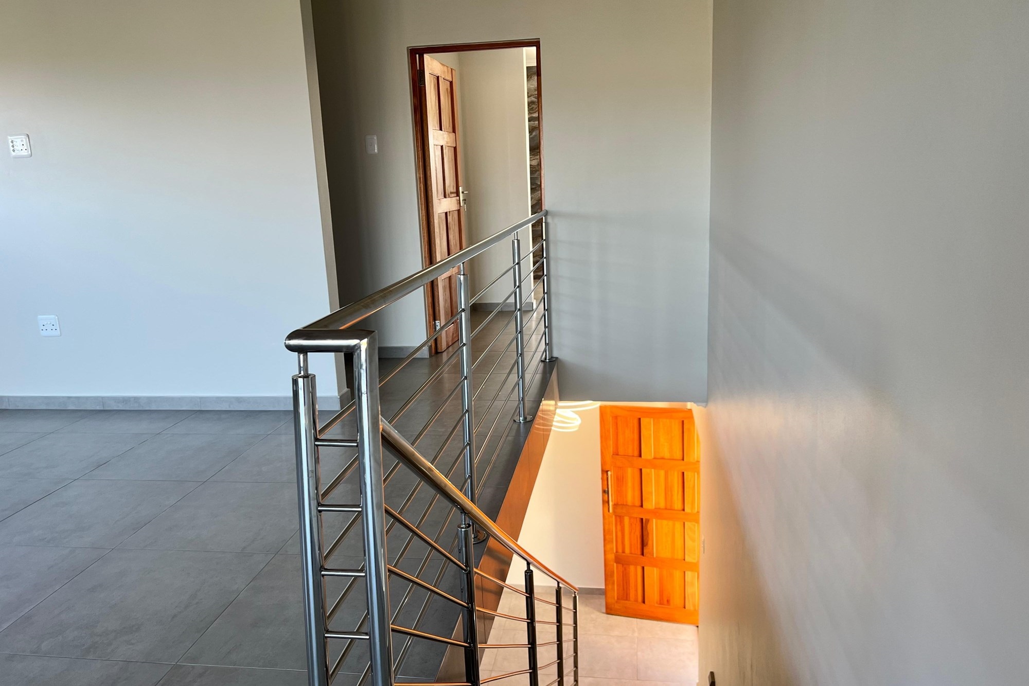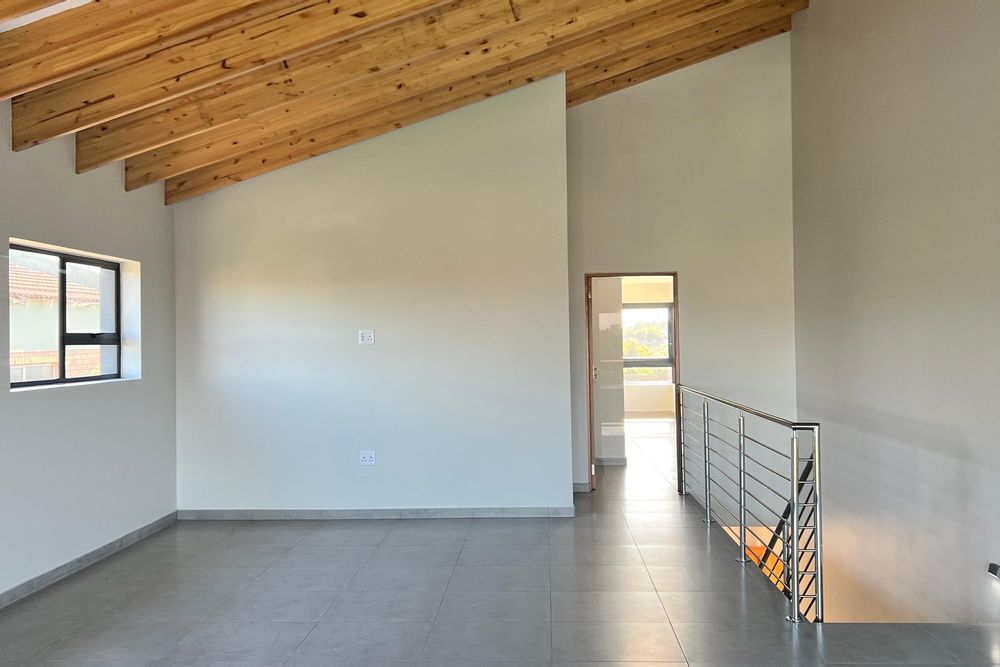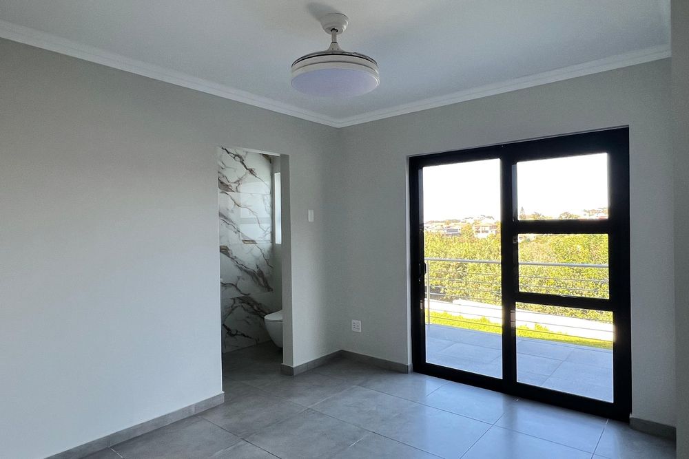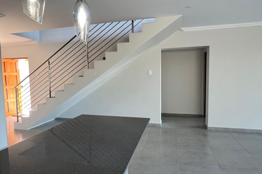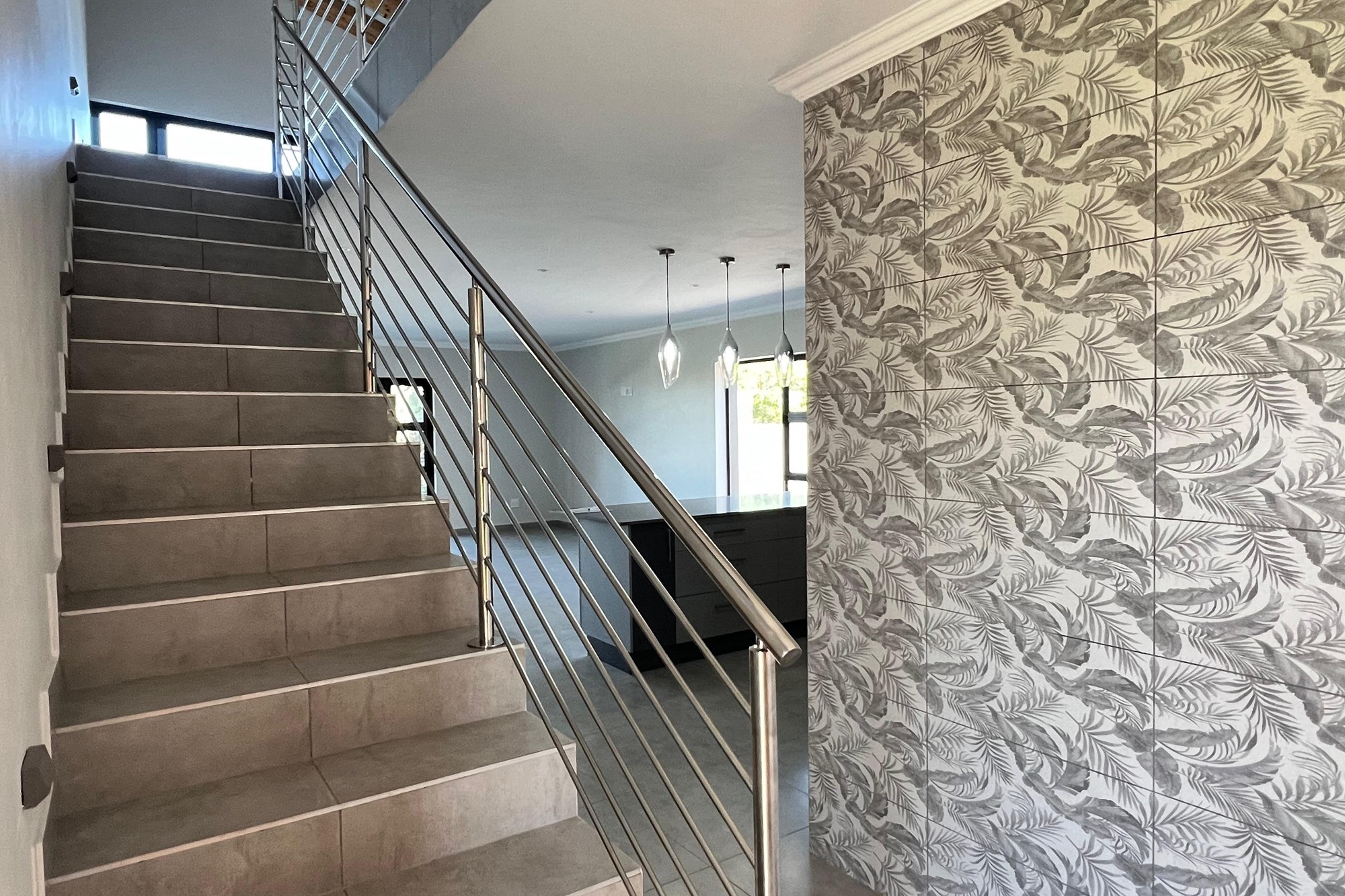 An elegant staircase leads to the upper level, where you’ll find a spacious living area complete with a built-in braai. Sliding doors open onto a balcony that frames peaceful kloof and sea views. The main suite is a luxurious retreat, featuring an open-plan en-suite with designer fixtures and sophisticated lighting.