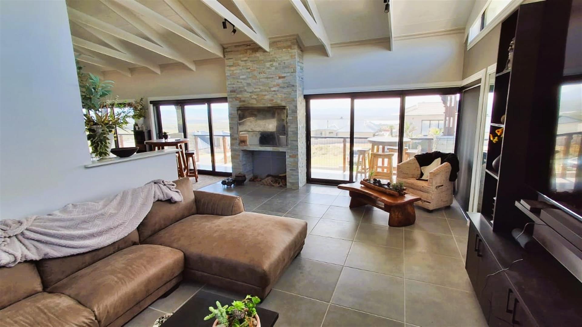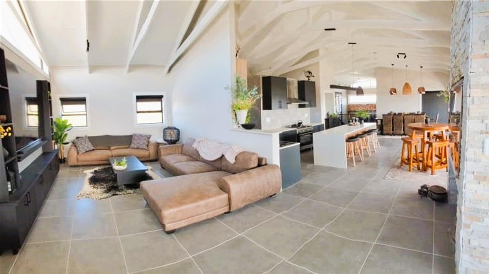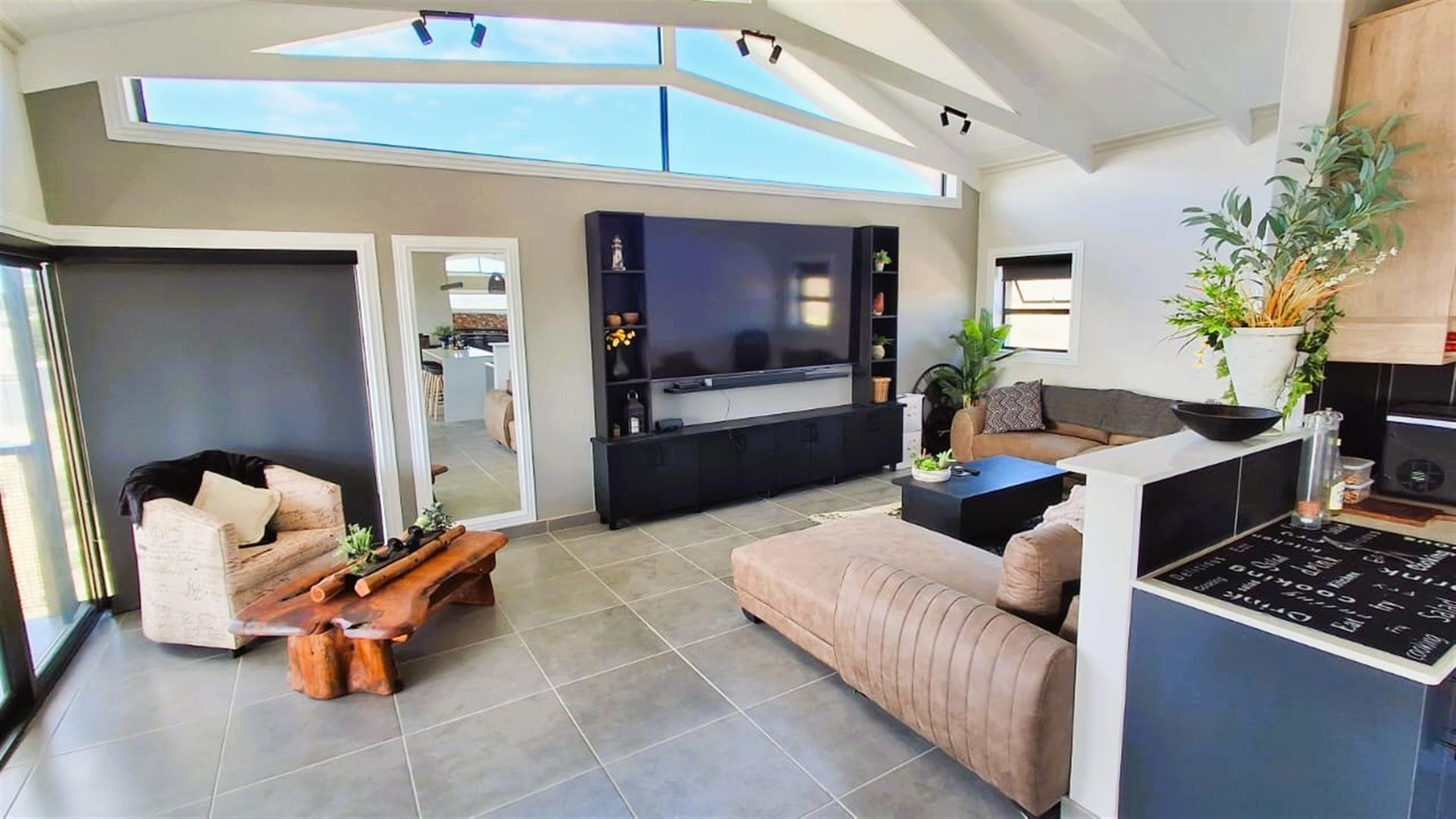 - Large lounge, dining, TV area, and indoor braai
