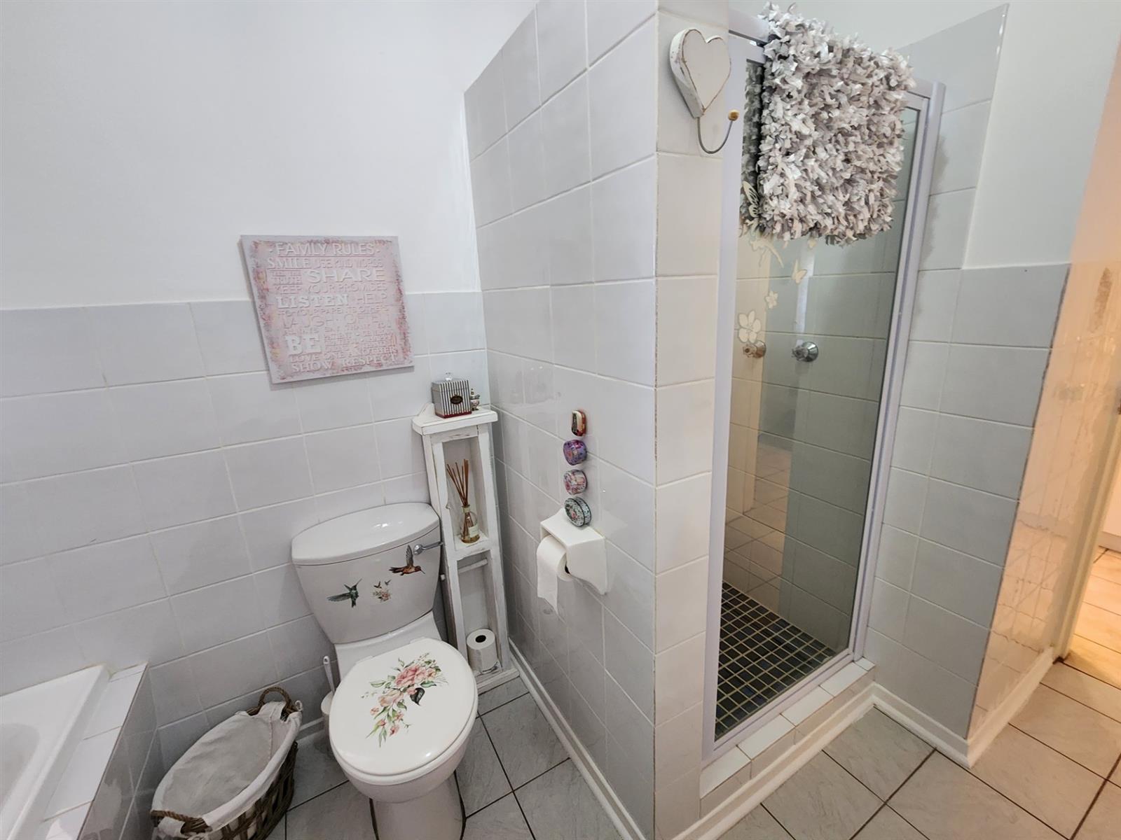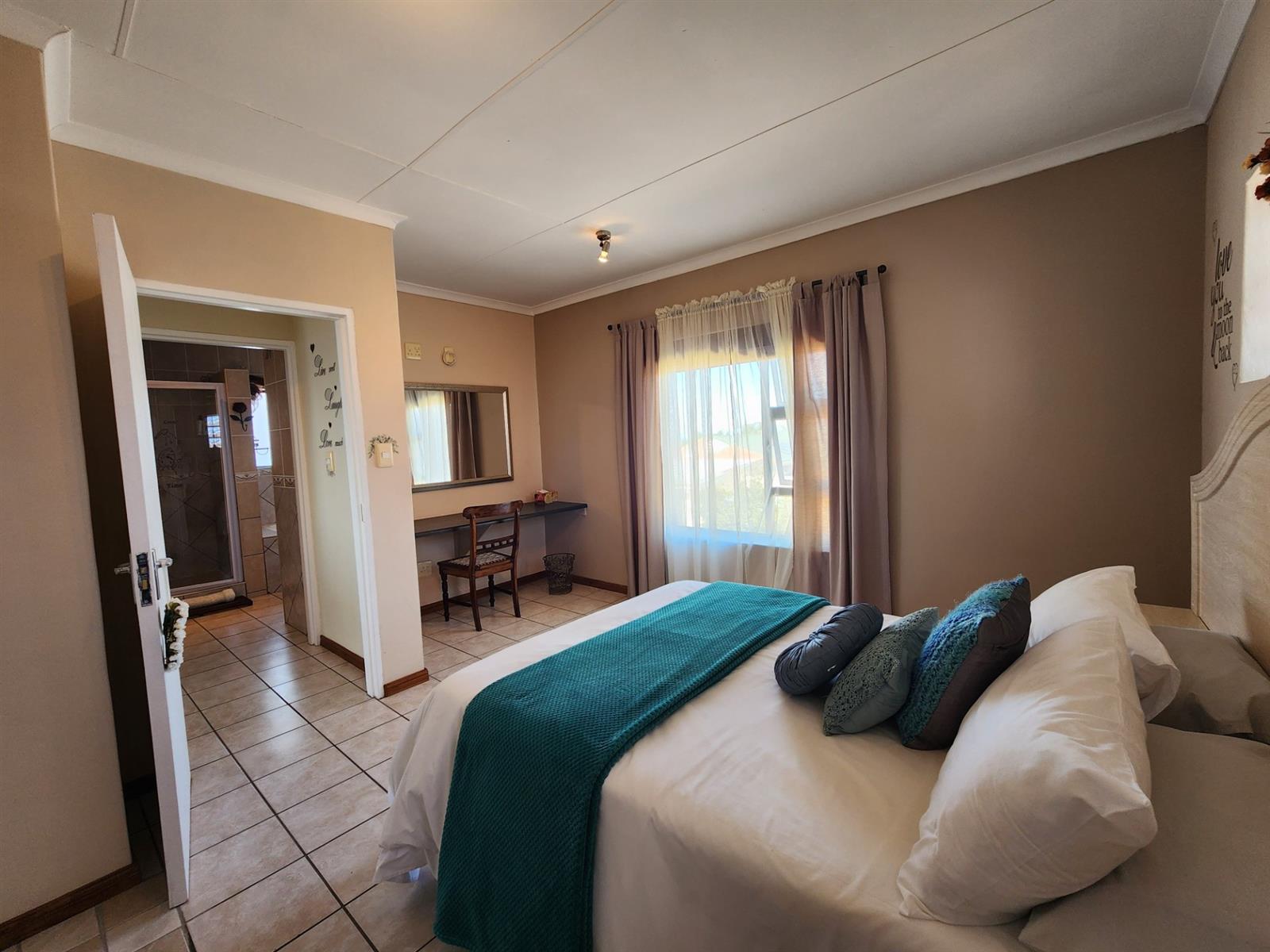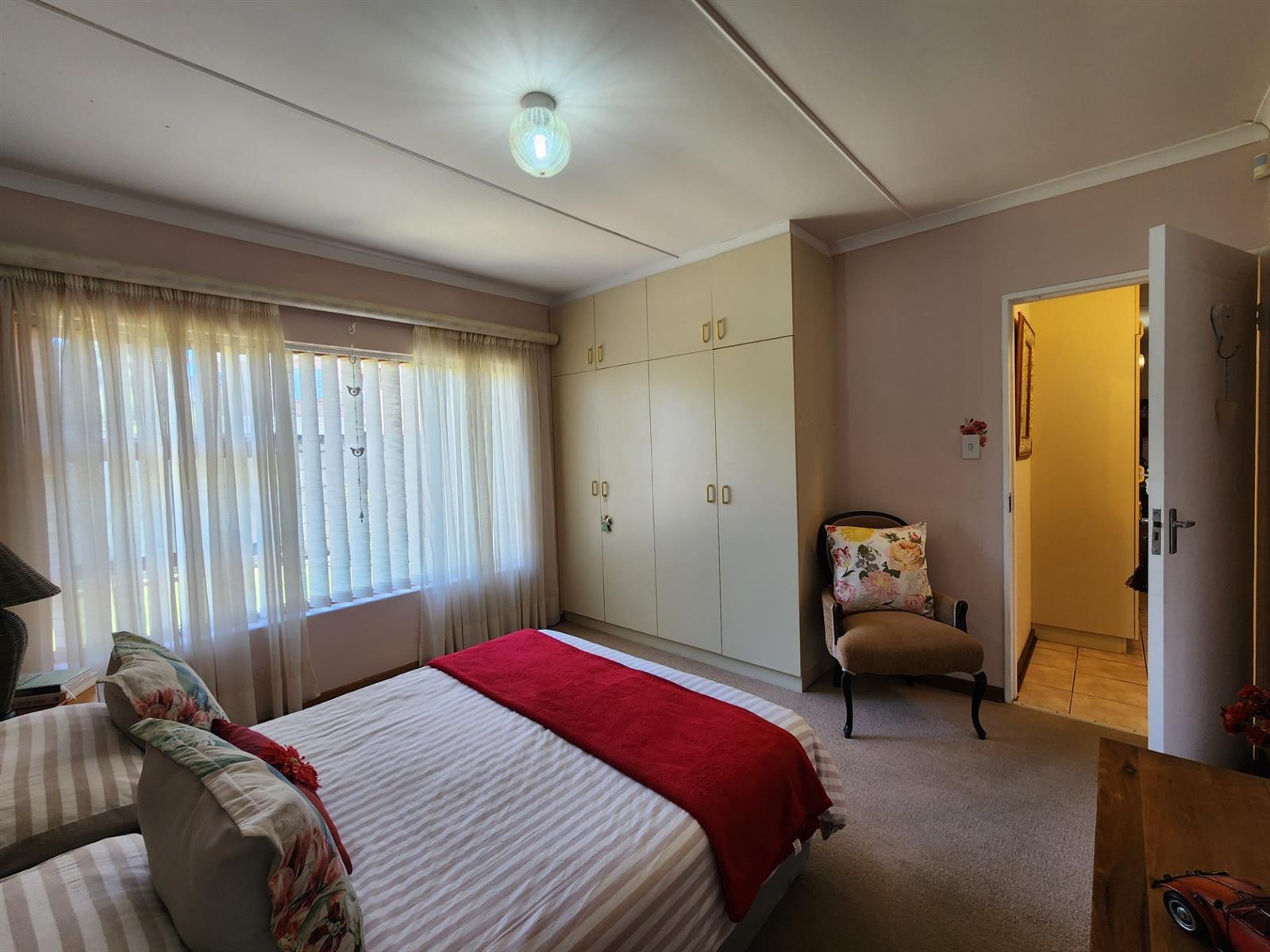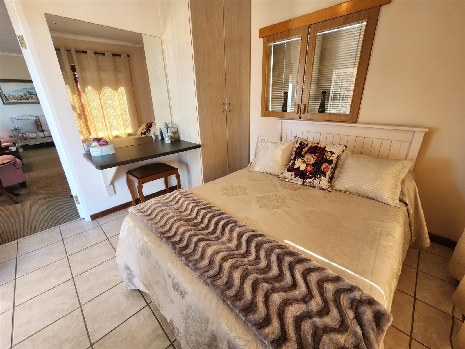 The main residence offers three generously sized bedrooms, each with ample built-in cupboards. The main bedroom provides a peaceful retreat with its own en-suite bathroom, while the remaining bedrooms share a well-appointed family bathroom. Additional linen cupboards provide valuable storage throughout the home.