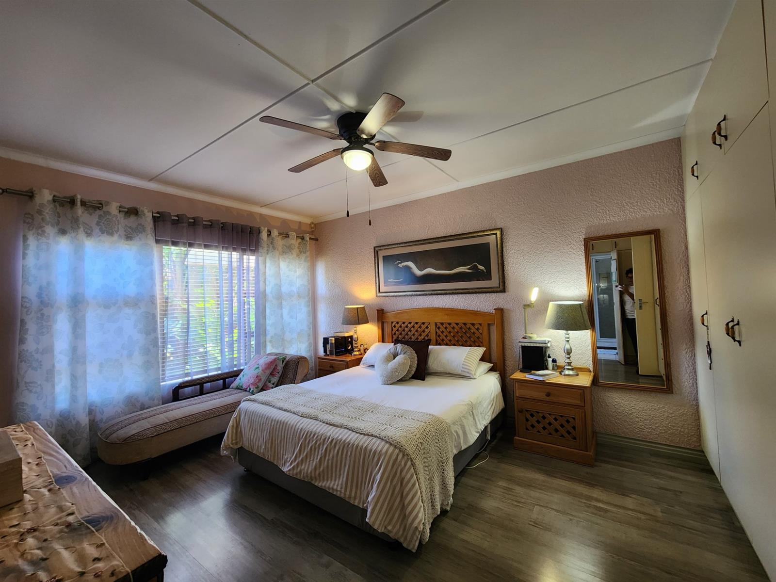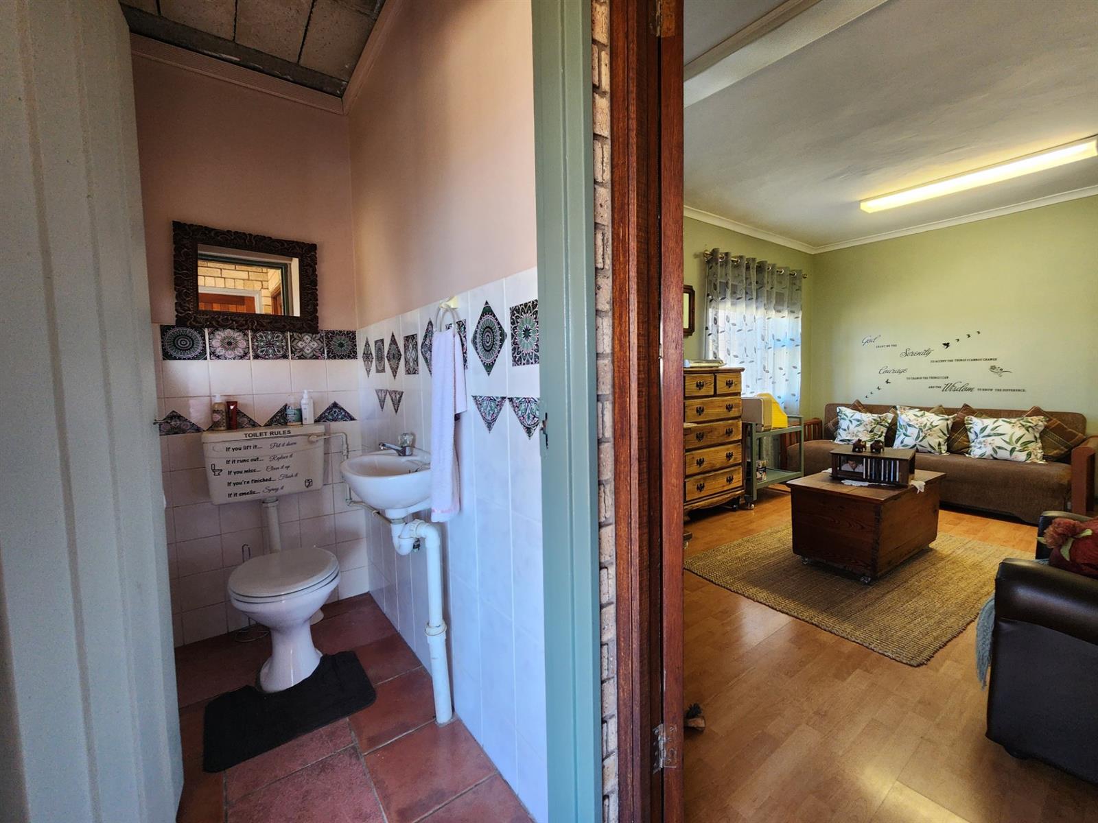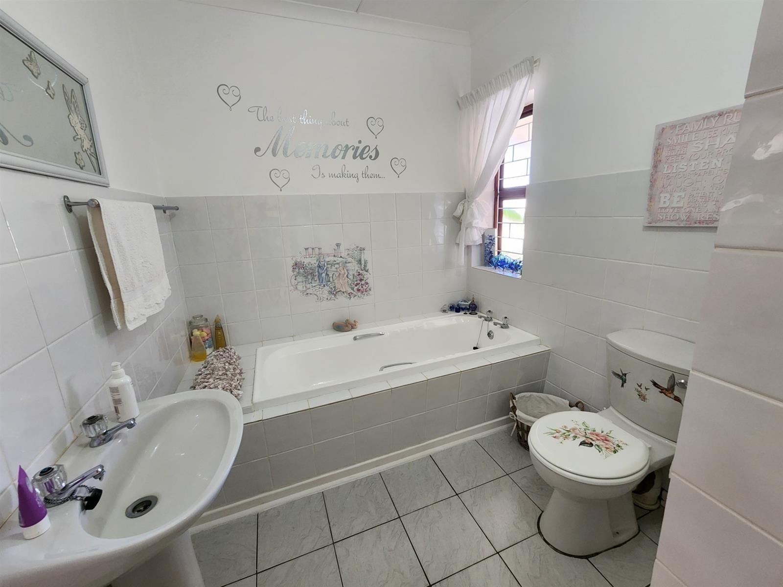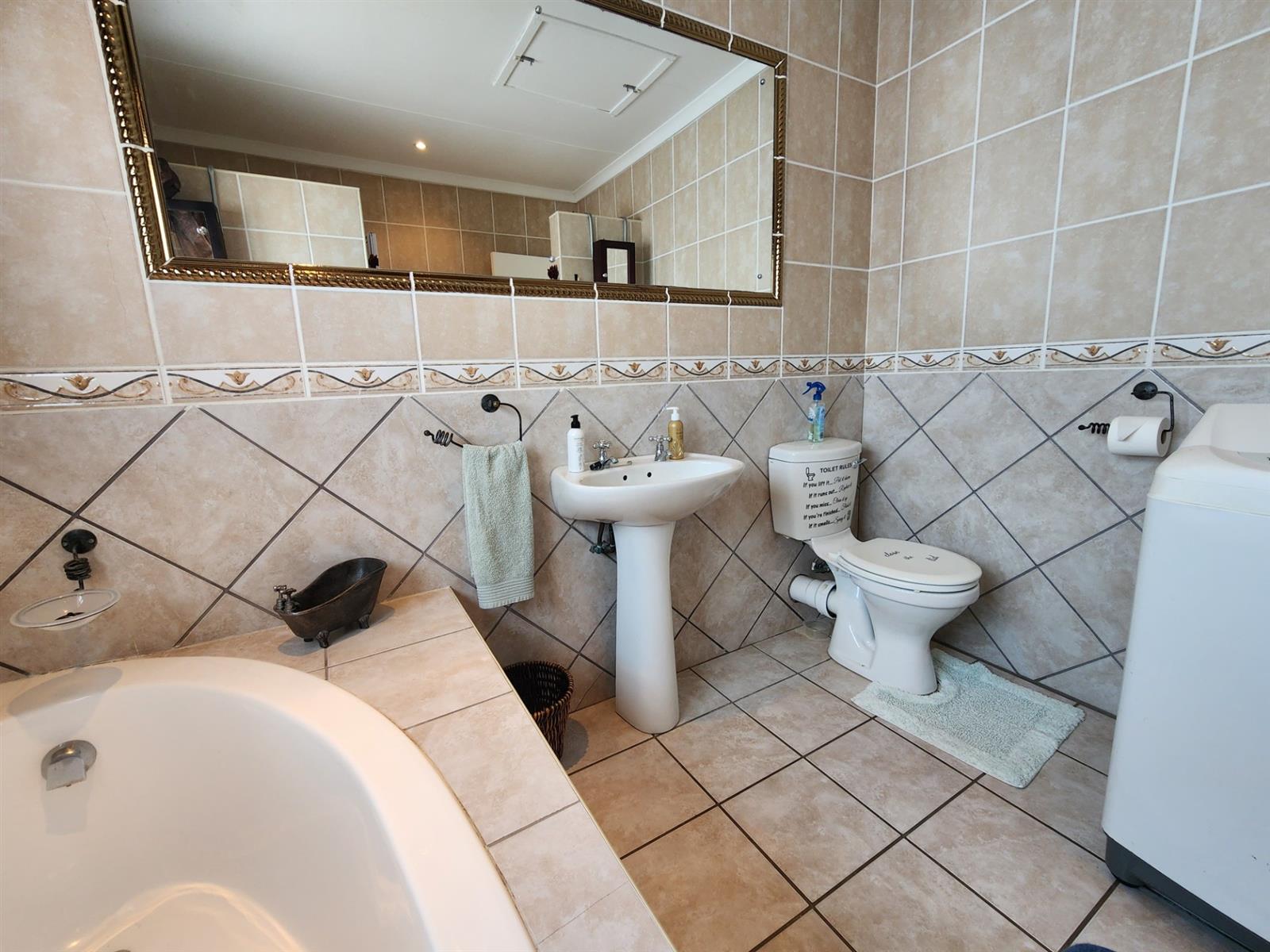 The main residence offers three generously sized bedrooms, each with ample built-in cupboards. The main bedroom provides a peaceful retreat with its own en-suite bathroom, while the remaining bedrooms share a well-appointed family bathroom. Additional linen cupboards provide valuable storage throughout the home.