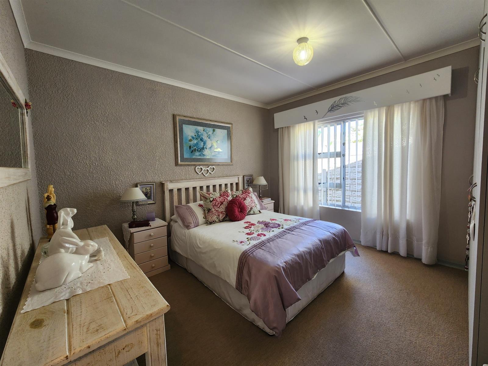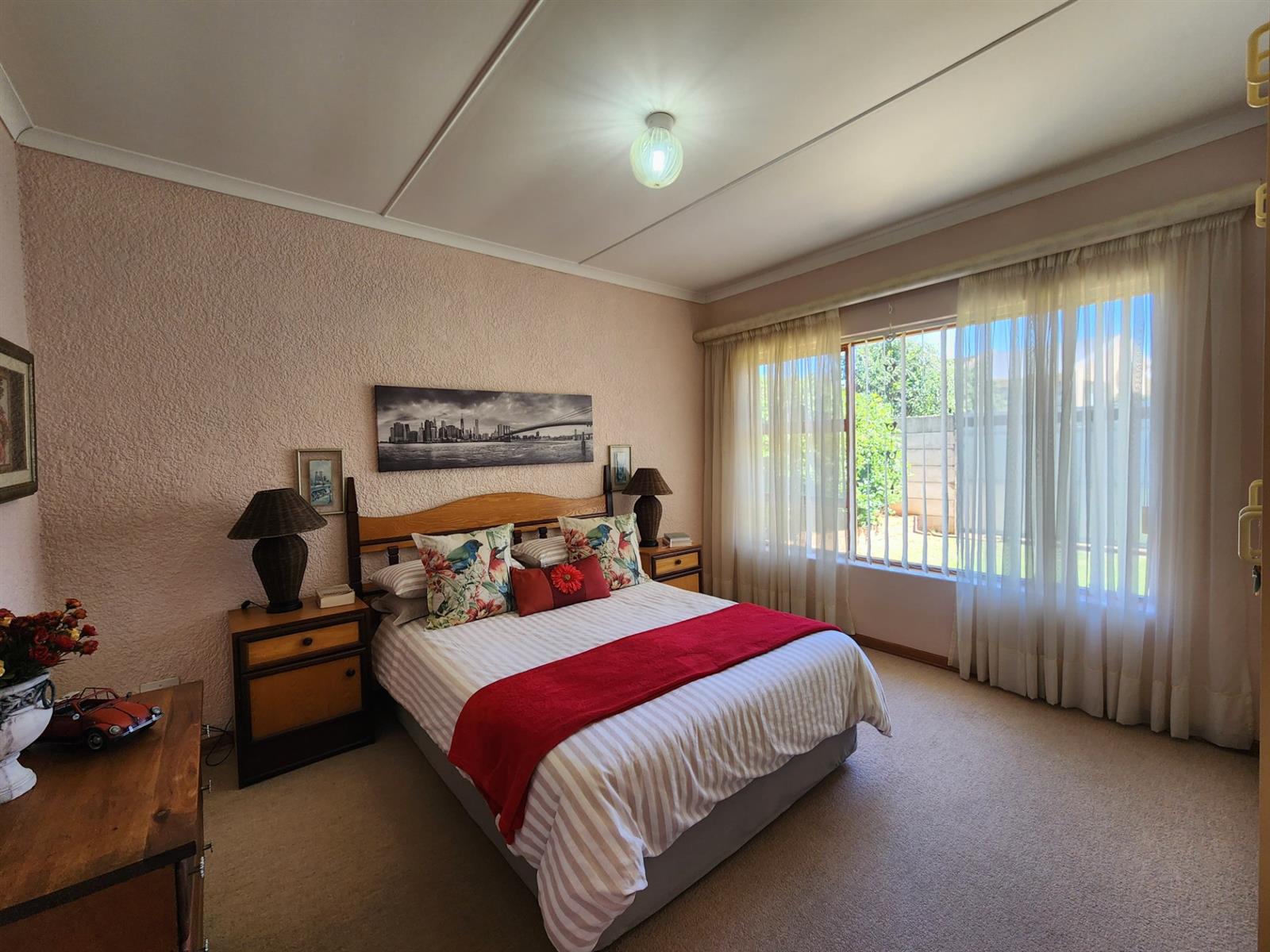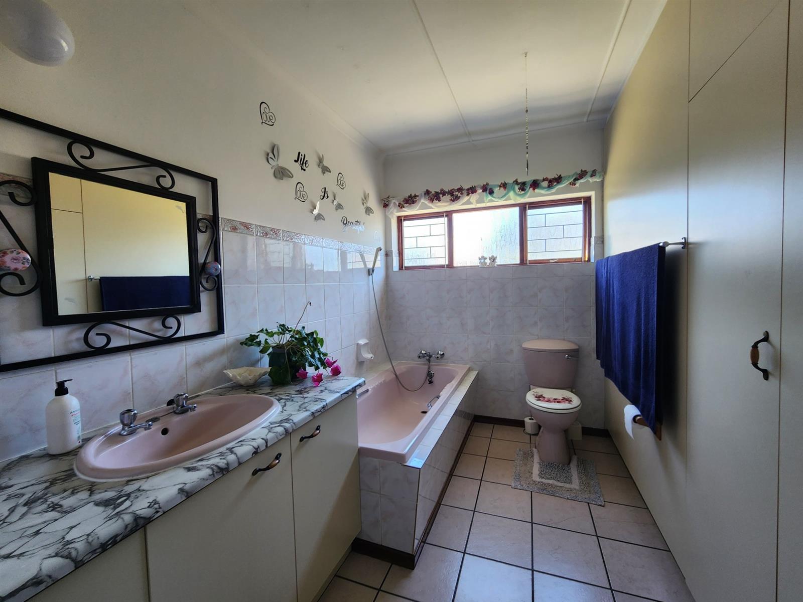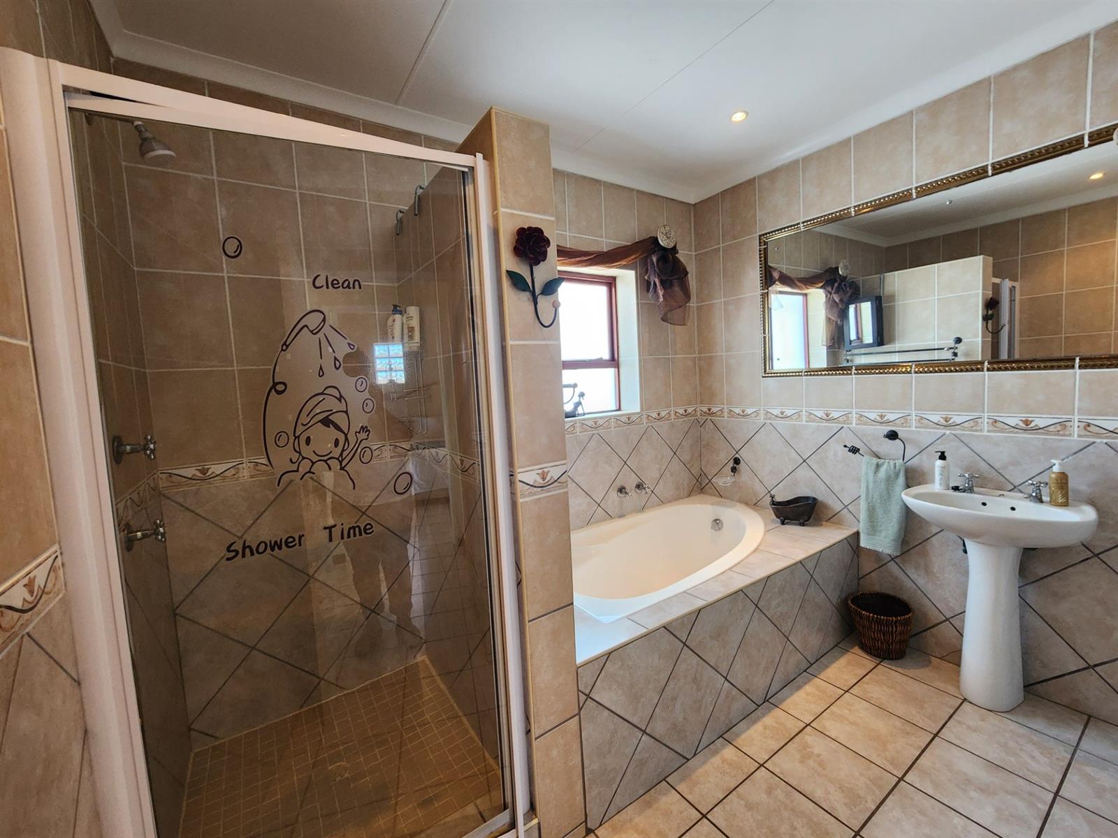 The main residence offers three generously sized bedrooms, each with ample built-in cupboards. The main bedroom provides a peaceful retreat with its own en-suite bathroom, while the remaining bedrooms share a well-appointed family bathroom. Additional linen cupboards provide valuable storage throughout the home.