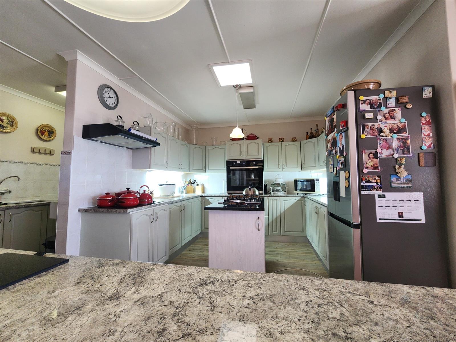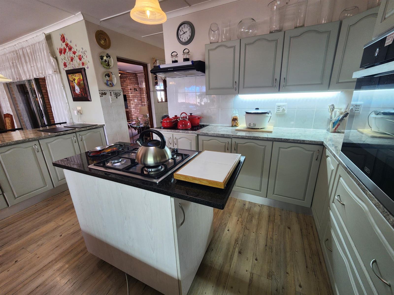 The heart of the home is the spacious open-plan living area where the kitchen, lounge, dining room, and TV room seamlessly connect to create a wonderful space for family life and entertaining. The modern kitchen is both stylish and functional, complemented by a convenient scullery and laundry area, ensuring practicality for everyday living. A built-in braai within the living area allows for effortless indoor entertaining all year round.