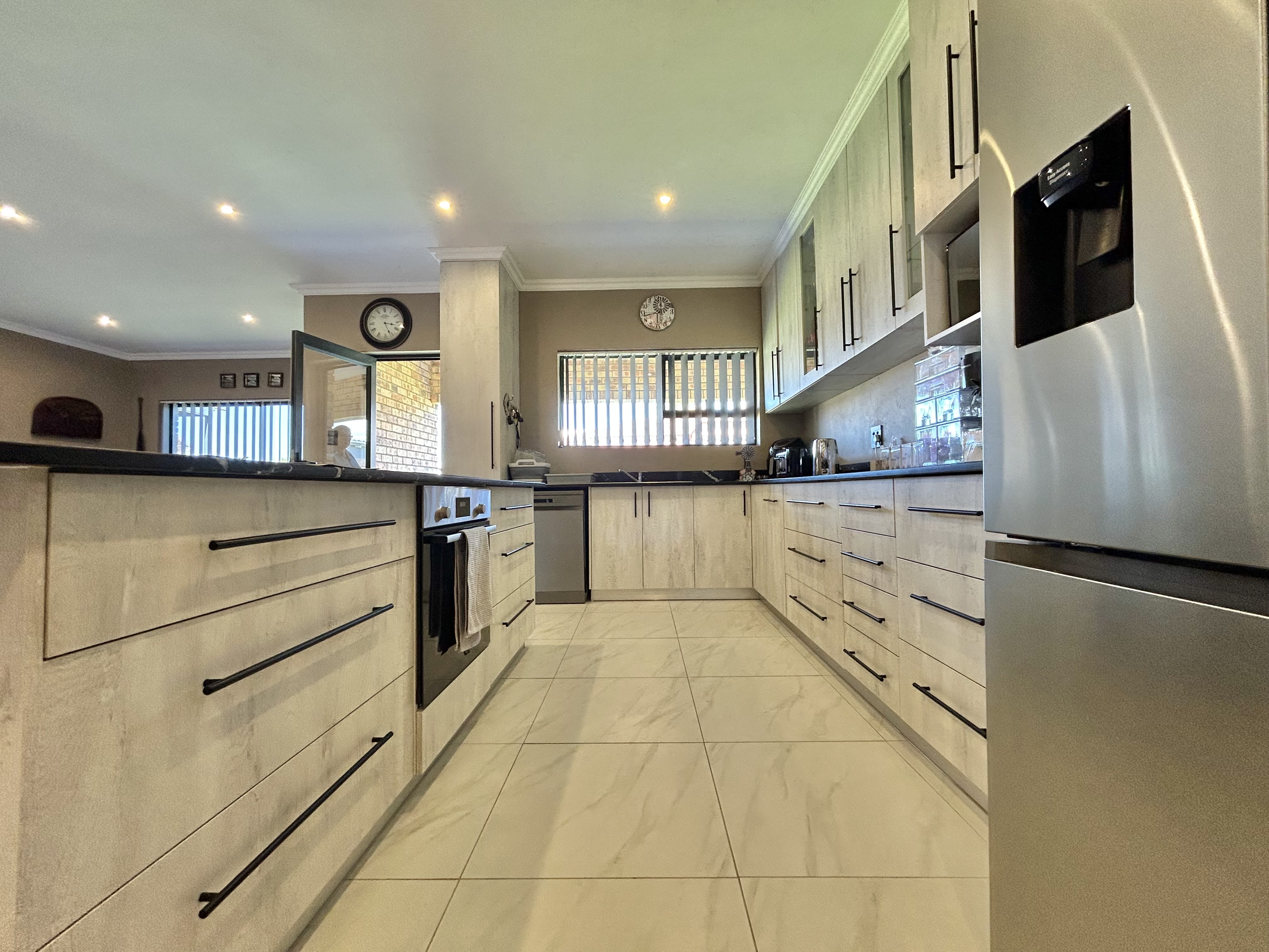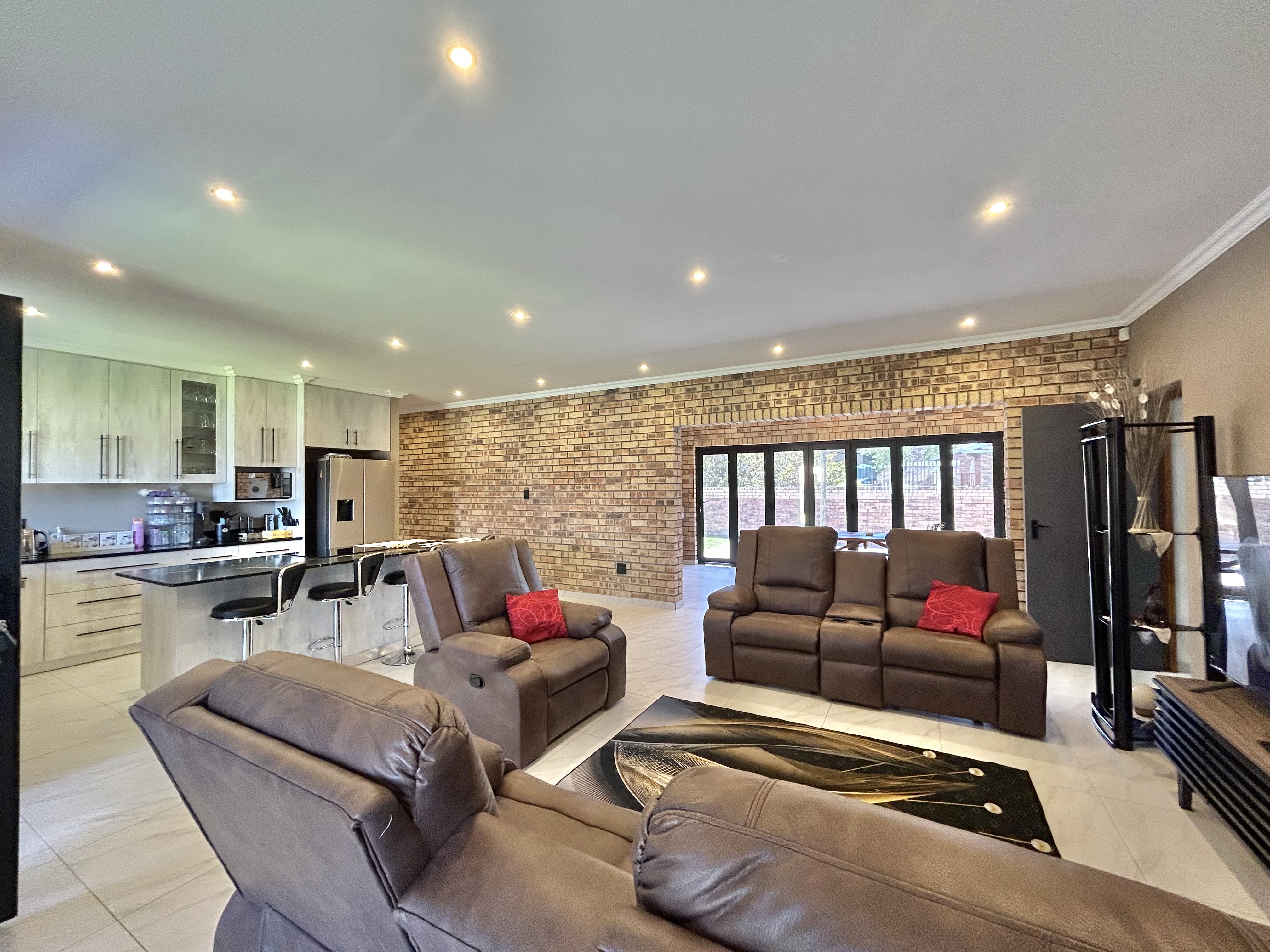 Spacious Open-Plan Living: Seamless flow between lounge, dining area, and braai room with built-in braai and stacker doors opening to a private patio.